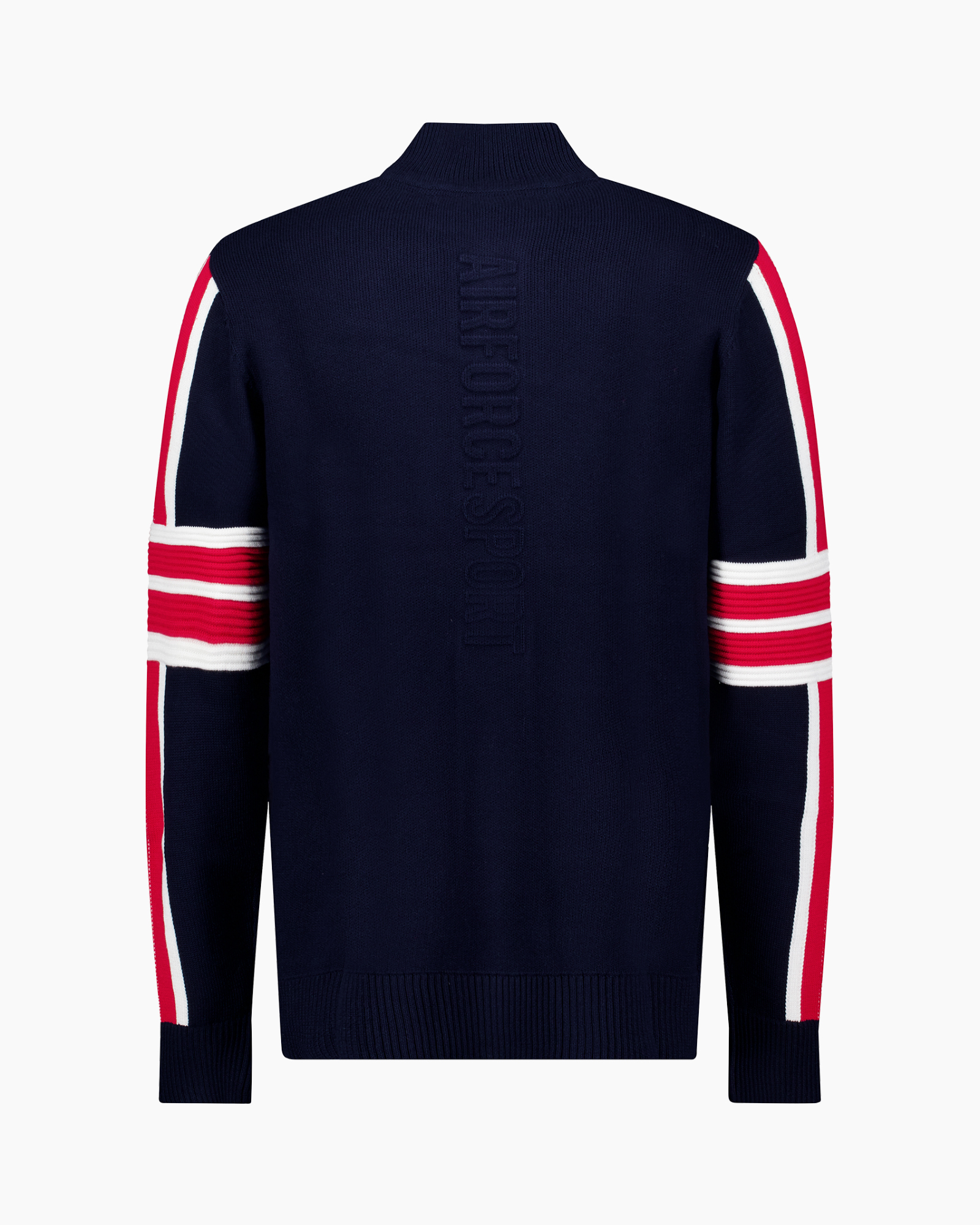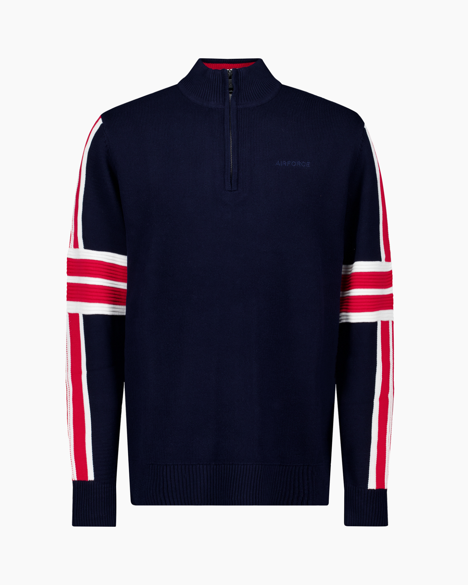Sweater Ski Cooper Knit Donker Blauw van Airforce is een gebreide trui die je warm houdt tijdens koude dagen. Dit kledingstuk heeft een donkerblauwe kleur met rode en witte banen op de mouwen. Je gebruikt de rits in de hoge kraag voor een goede aansluiting bij de hals. De rechte pasvorm geeft je veel bewegingsvrijheid.