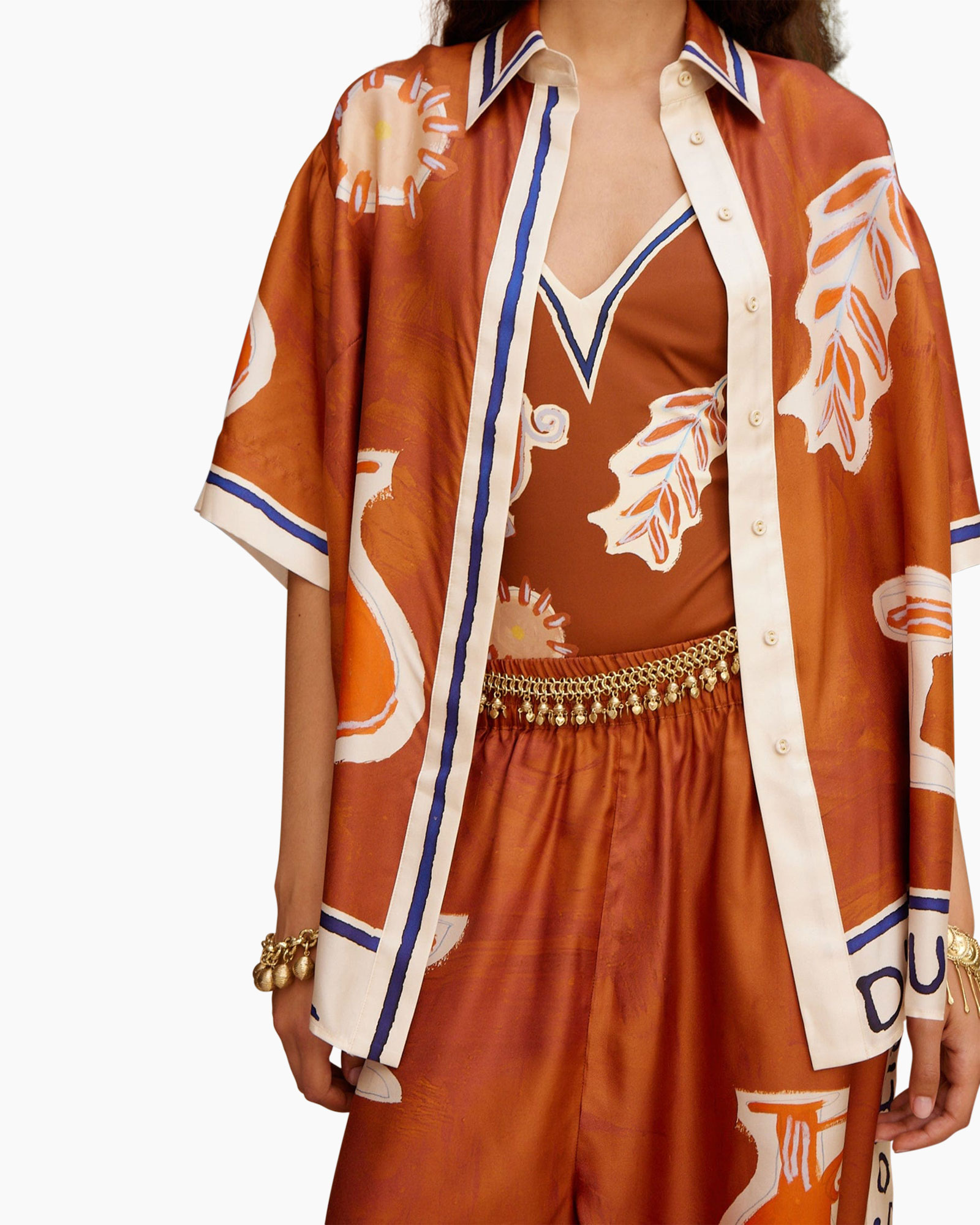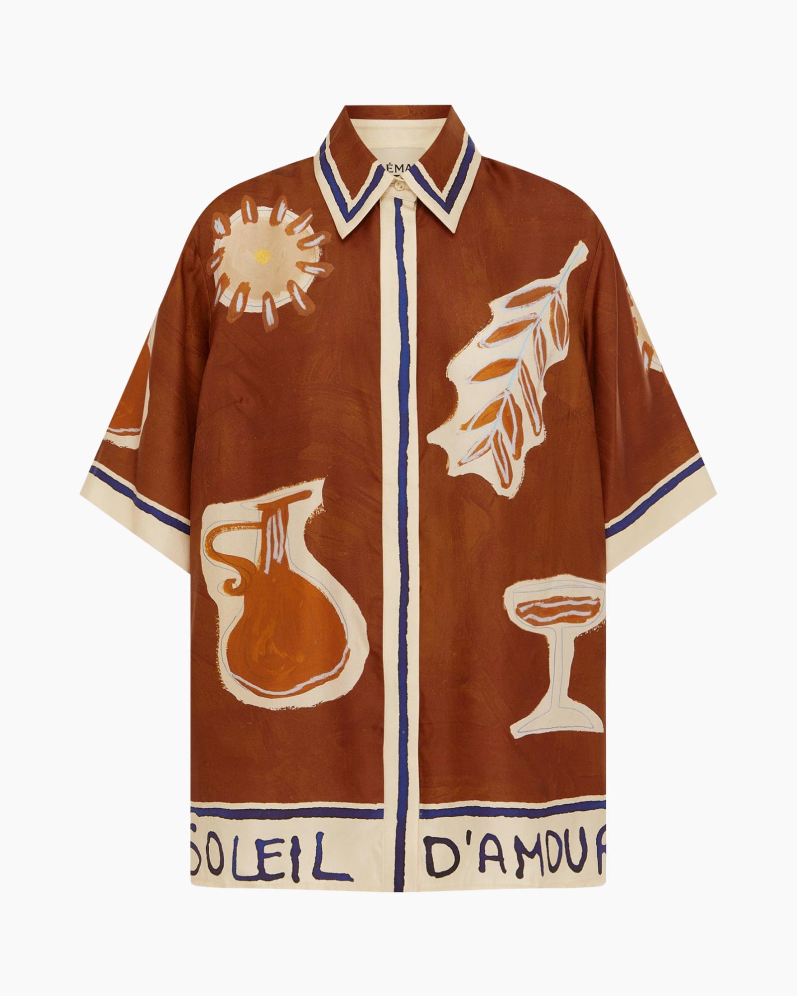 Vest Soleil D'amour Silk Roestbruin van Alemais is een shirt met korte mouwen voor warme dagen. Je ziet een roestbruine kleur die de basis vormt voor dit item. Dit kledingstuk heeft een ruime pasvorm en sluit met knopen aan de voorkant. Een kraag en witte banen langs de randen maken het geheel af.