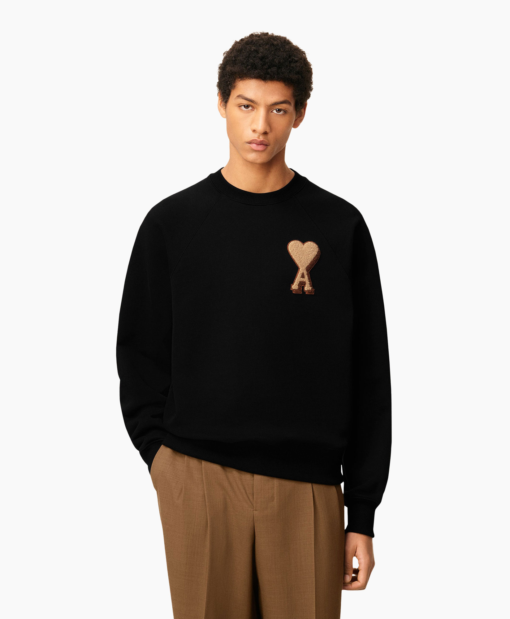 Met de Sweater Patch Zwart van Ami Paris haal je een krachtige trui in huis. De diepe zwarte kleur maakt dit kledingstuk een basis die je eenvoudig combineert met andere items. Je ziet direct dat de pasvorm ruim is; de sweater valt losjes om je lichaam. Deze trui heeft een klassieke ronde hals en is afgewerkt met stevige ribbels bij de polsen en de onderzijde.