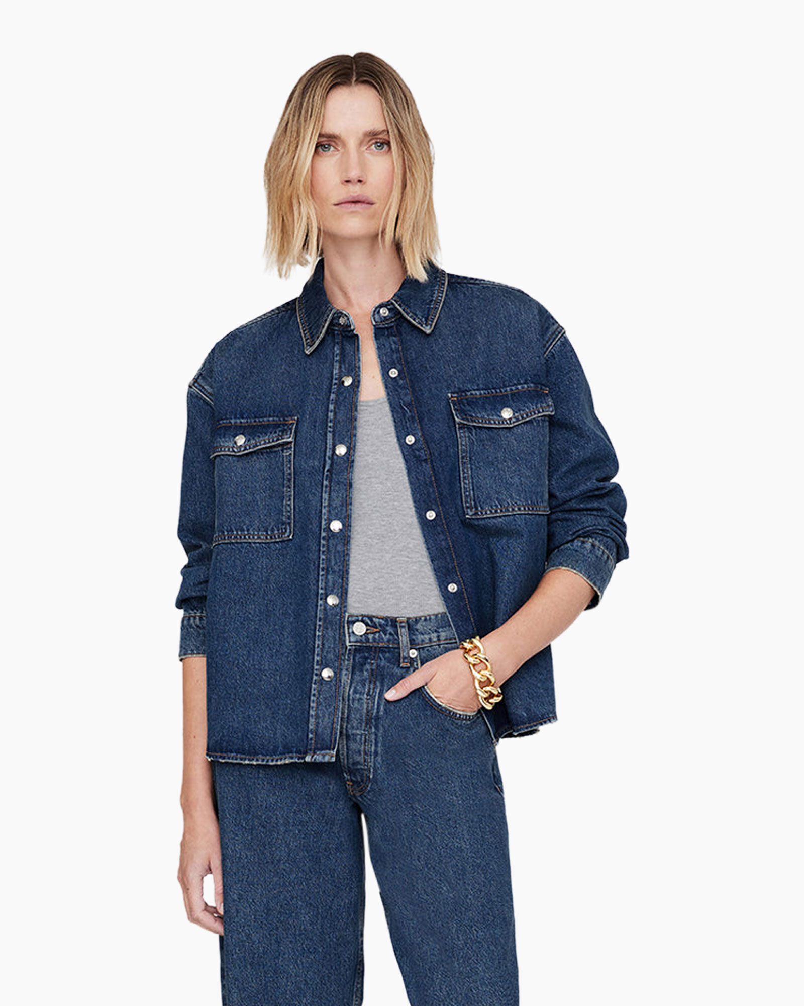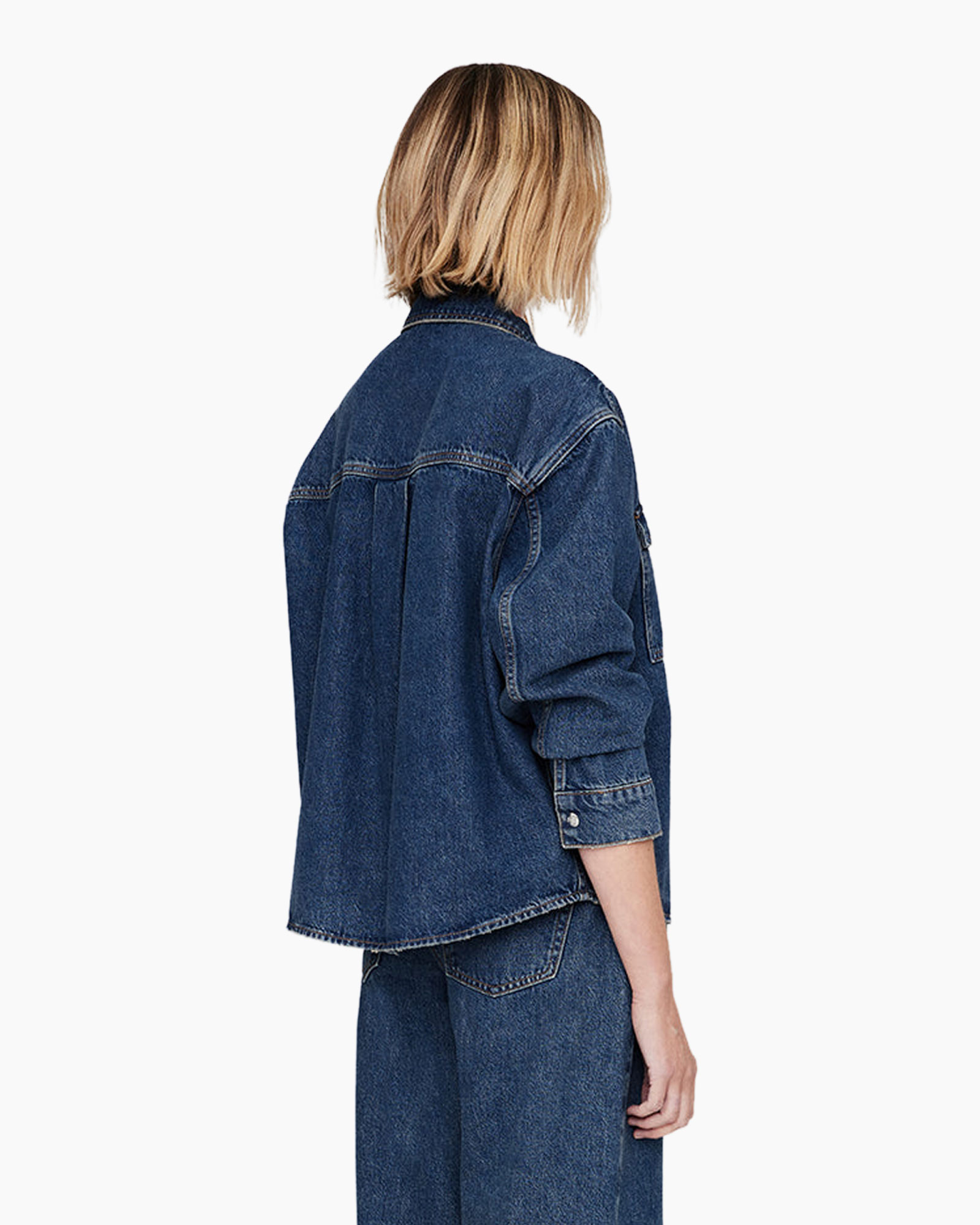 De Blouse Dante Blauw is vervaardigd van stevig denim, wat zorgt voor een aangenaam draagcomfort en duurzaamheid. De blouse heeft een klassieke kraag en is voorzien van drukknopen voor een eenvoudige sluiting. De opvallende borstzakken voegen een speels detail toe zonder de minimalistische look te verstoren. Anine Bing’s subtiele merkaccenten zijn zorgvuldig verwerkt in het ontwerp, waardoor het een ingetogen en verfijnde uitstraling krijgt.