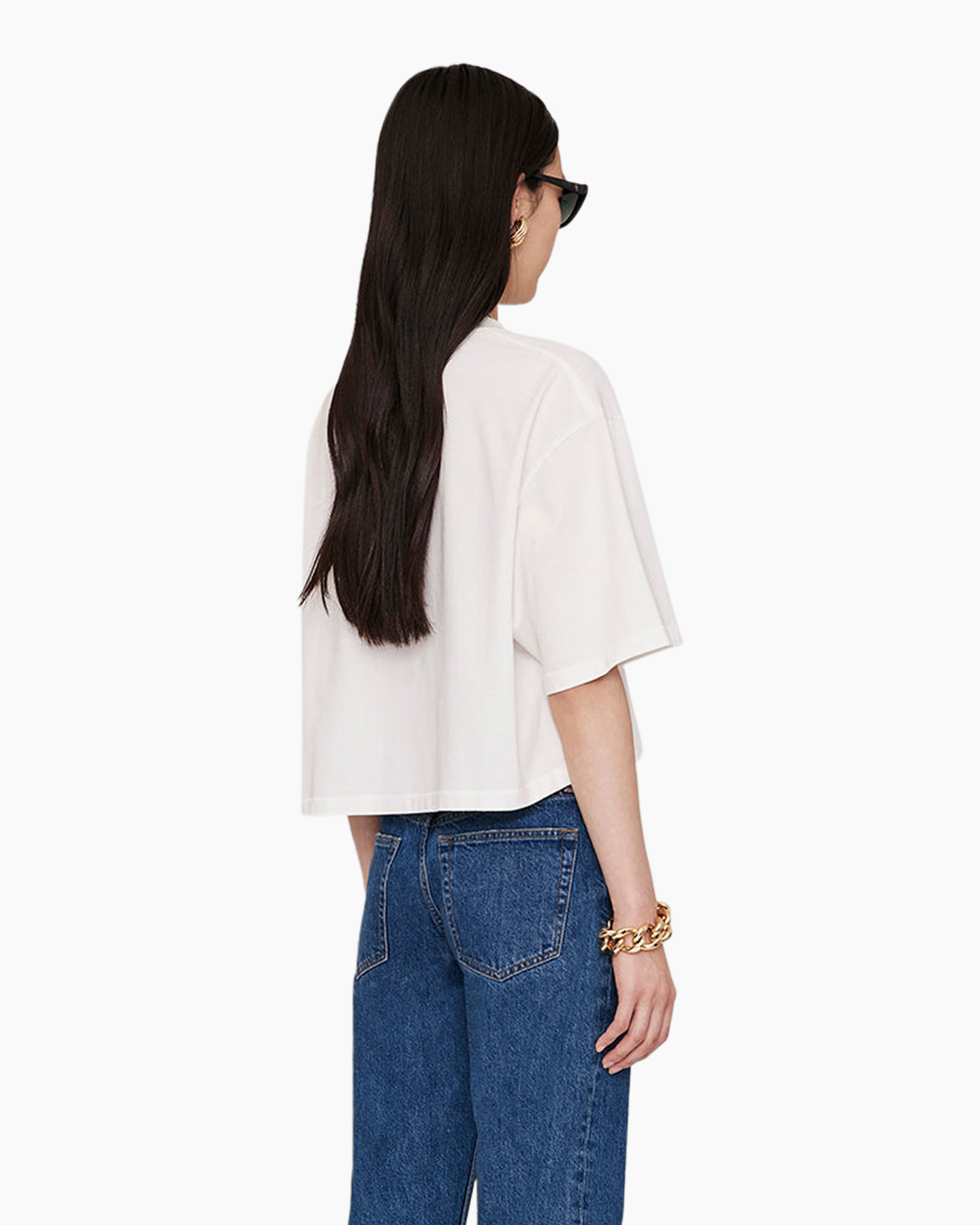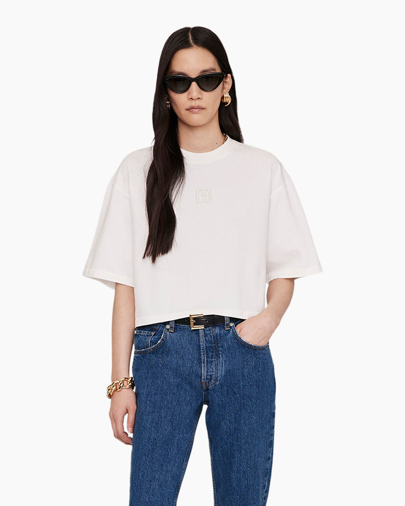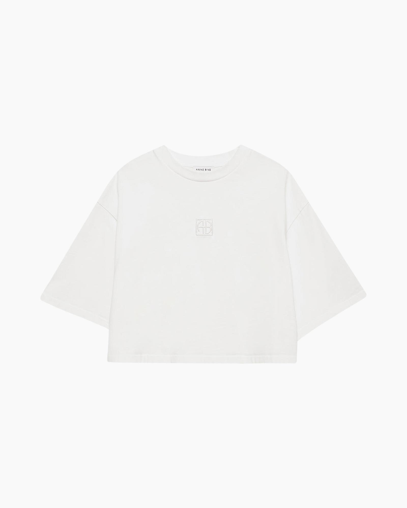 De Myers Cropped Tee met ingelijst monogram is gemaakt van een zware 100% katoenen jerseystof. Deze relaxte basic heeft een ton-sur-ton, ingelijst ANINE BING-monogram geborduurd op de borst.