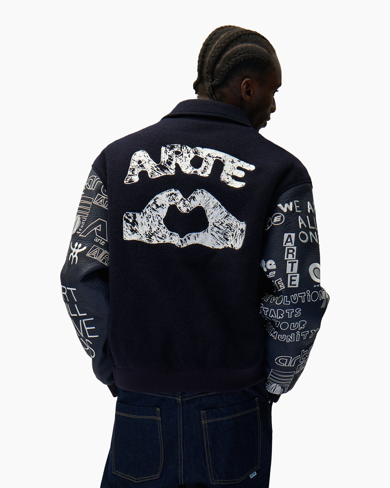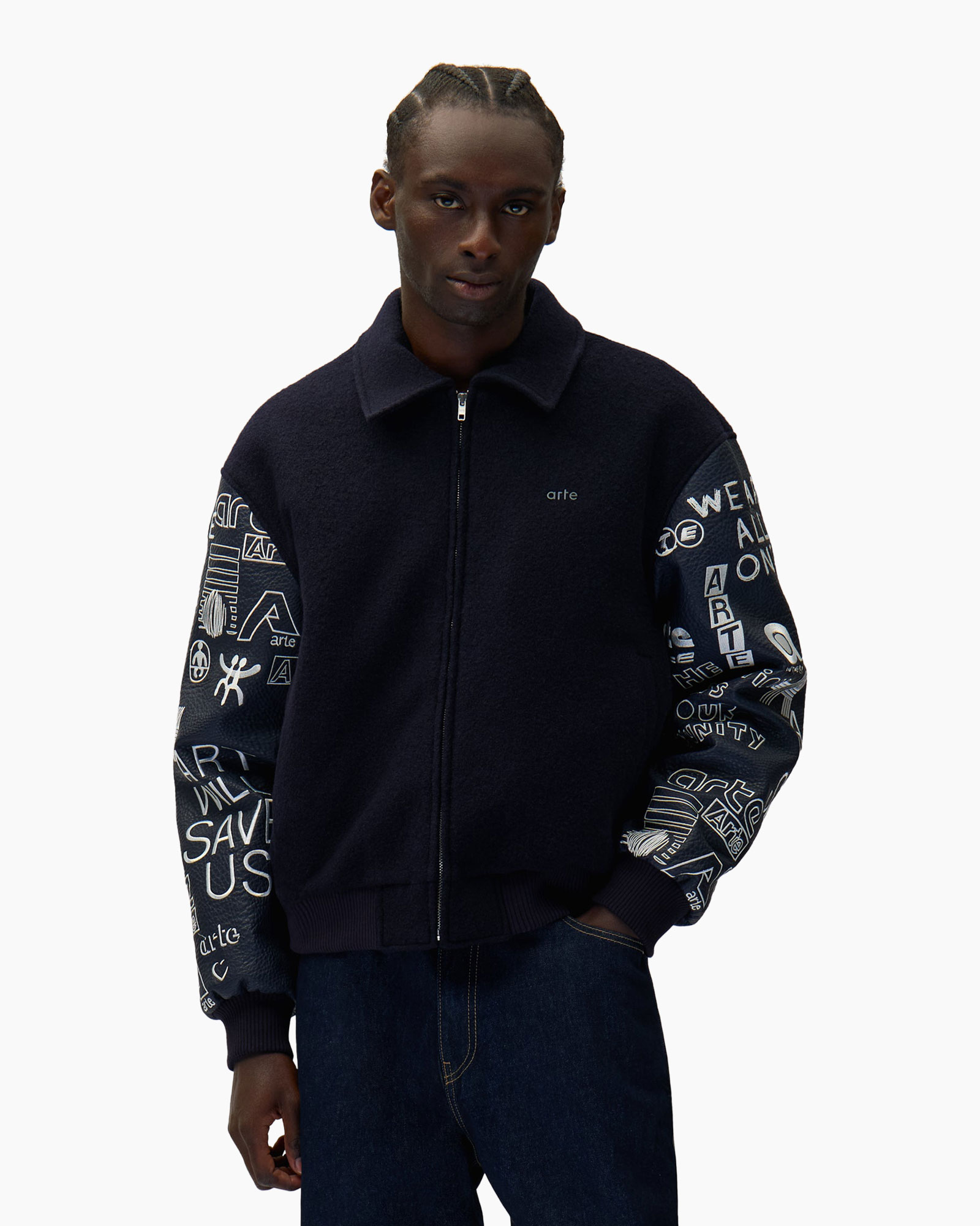 Het jack is gemaakt van hoogwaardige materialen die dragen comfortabel maken. De pasvorm sluit perfect aan en zorgt voor bewegingsvrijheid. De kraag en ritssluiting geven het een klassieke uitstraling, terwijl de unieke opdrukken op de mouwen en rug een artistieke flair toevoegen. Op de rug prijkt het woord “Arte” prominent, wat een sterk merkaanduiding biedt. Het subtiele merkembleem aan de voorzijde completeert het geheel.