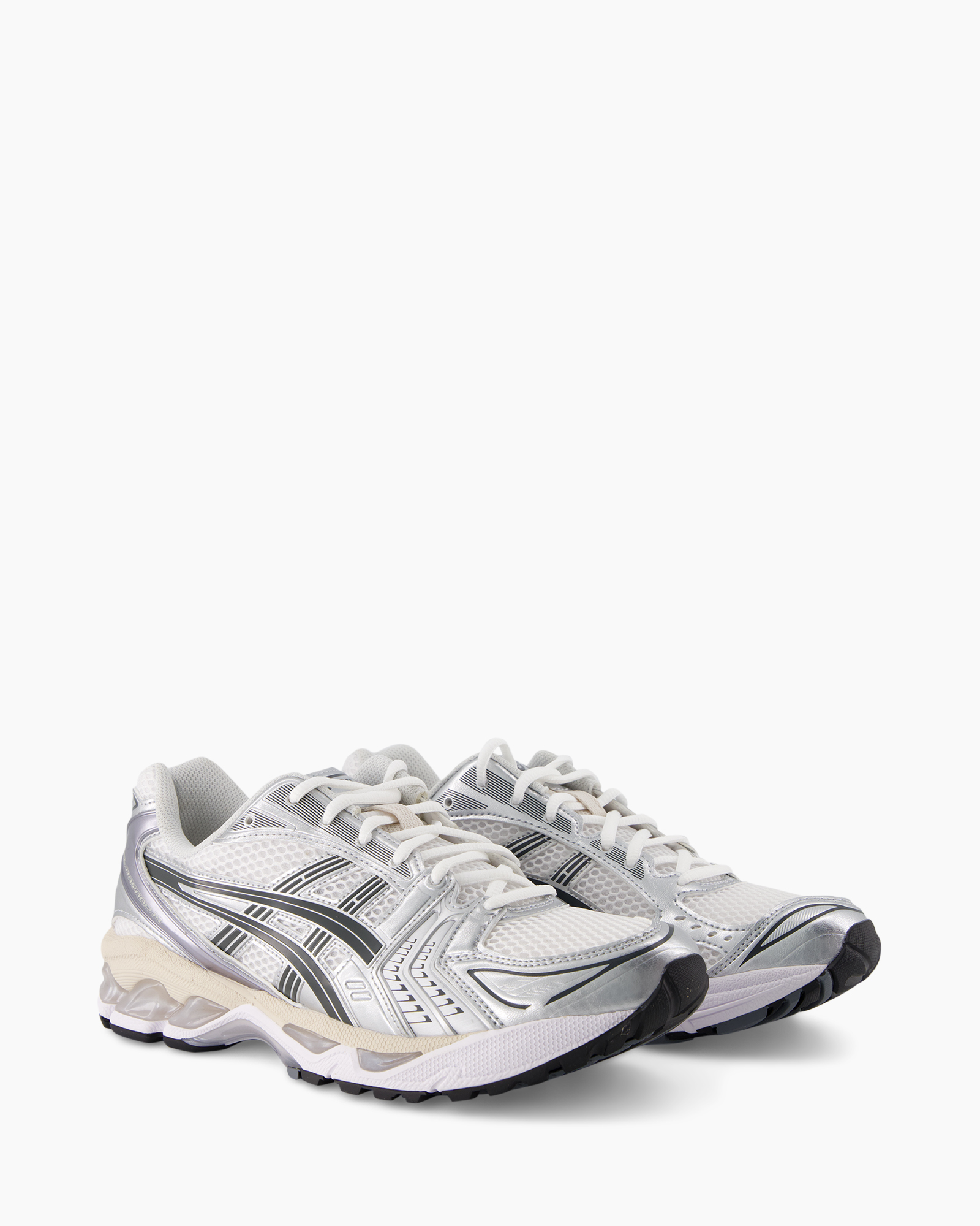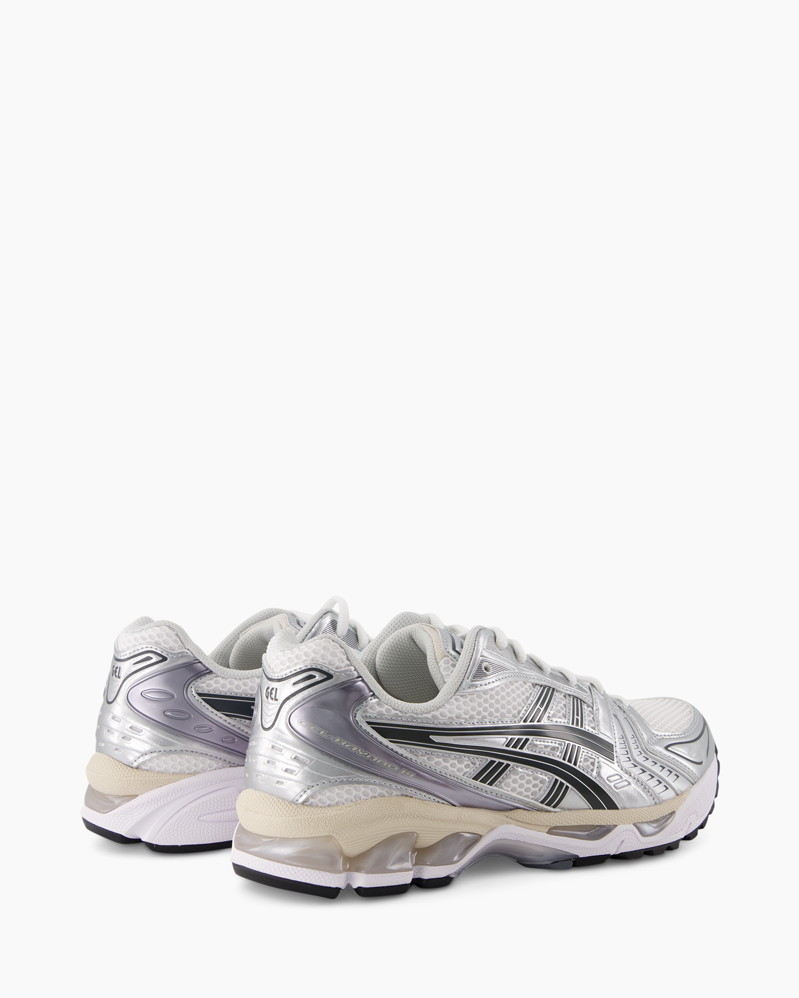 Op de zijkanten vallen de zwarte strepen van Asics meteen op, subtiel omlijst met wit, wat een sterk contrast biedt. De witte veters zorgen voor een uniforme uitstraling aan de bovenkant. Kijk je goed, dan zie je de specifieke tekst van de Gel-kayano 14 op de zijkant. De crèmekleurige accenten in de zool geven een warme twist aan het geheel. Een sneaker die spreekt, zonder hard te roepen.