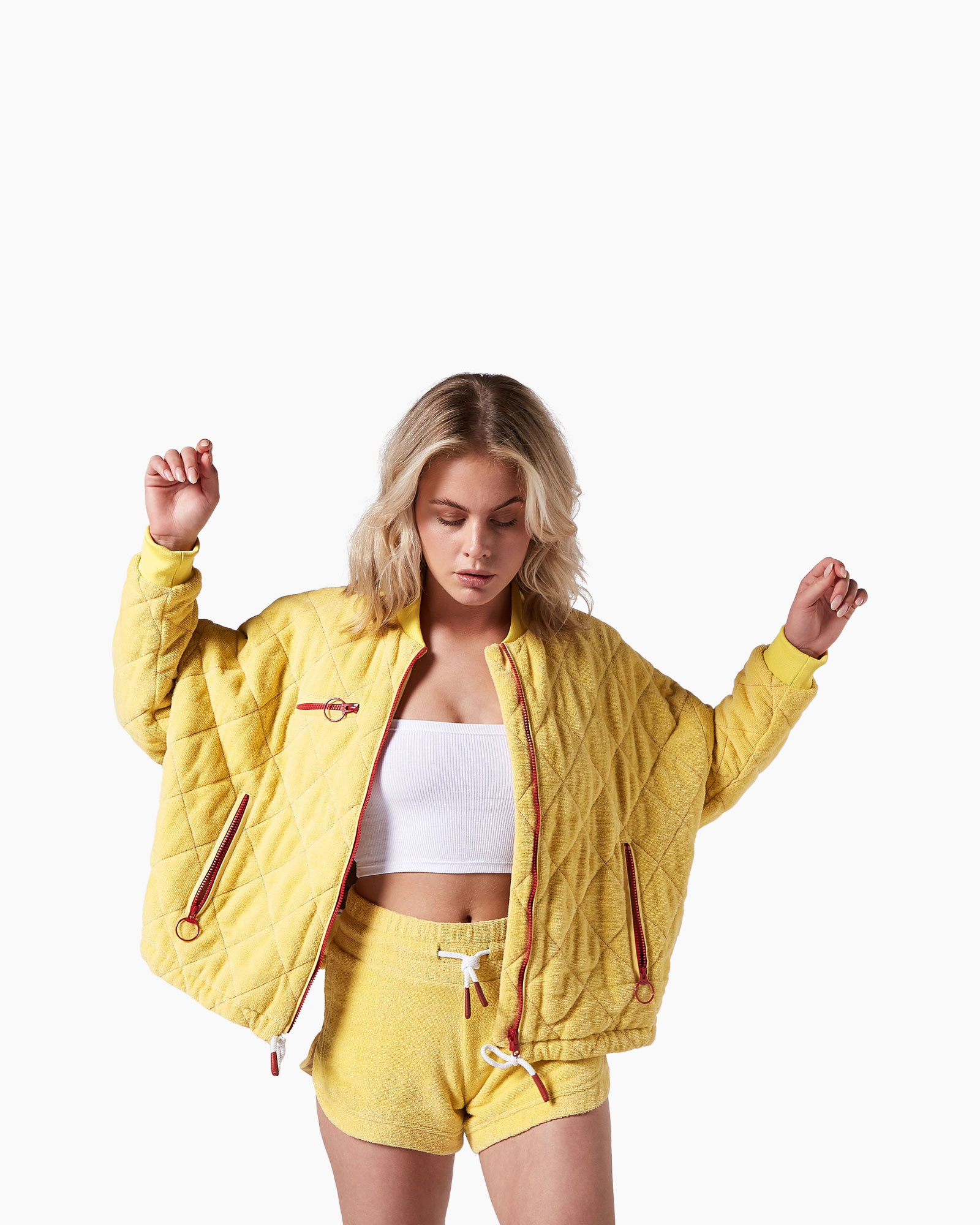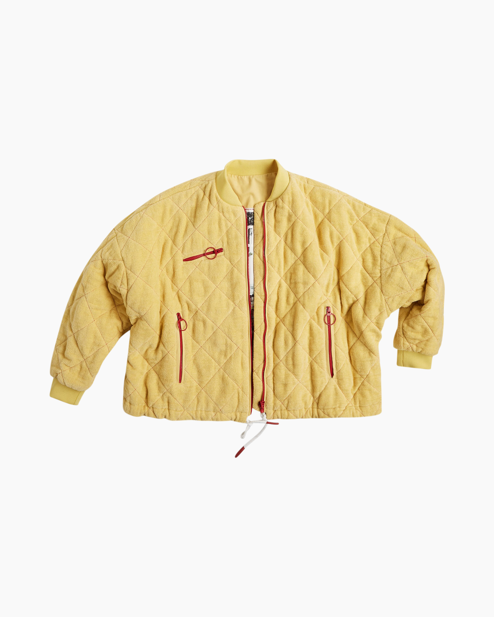De opvallende stiksels geven het jack een unieke uitstraling. Op de achterkant bevindt zich een print met de tekst "Baindoux" en een afbeelding. De rode rits zorgt voor een speels contrast met het gele badstof.