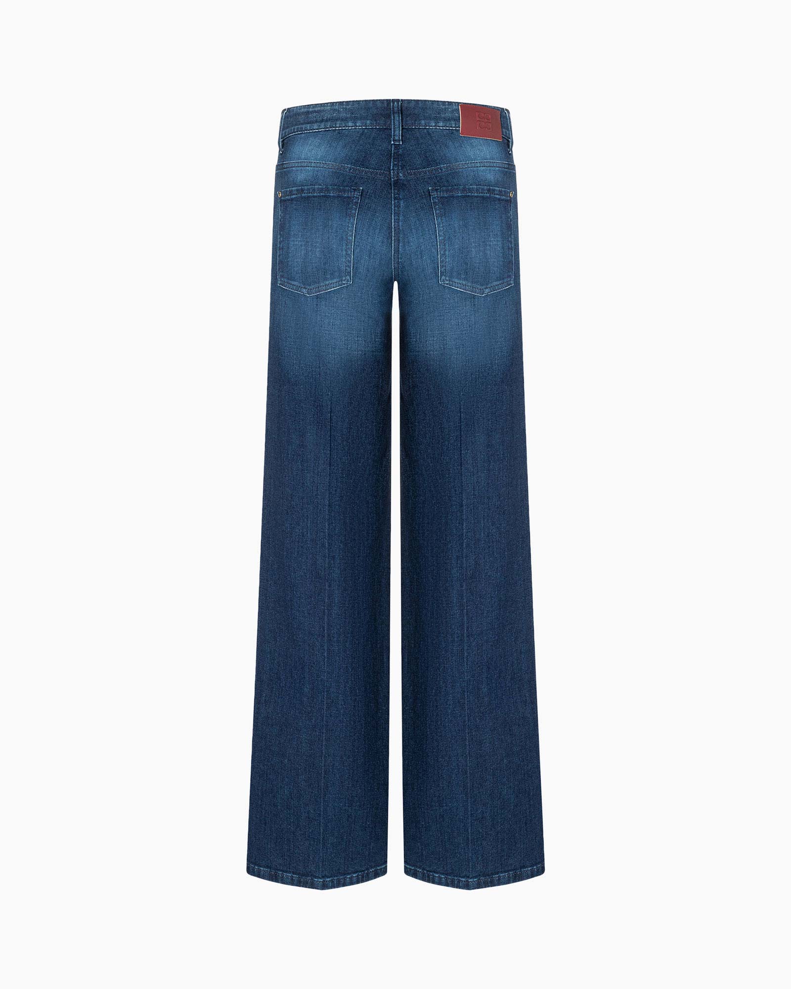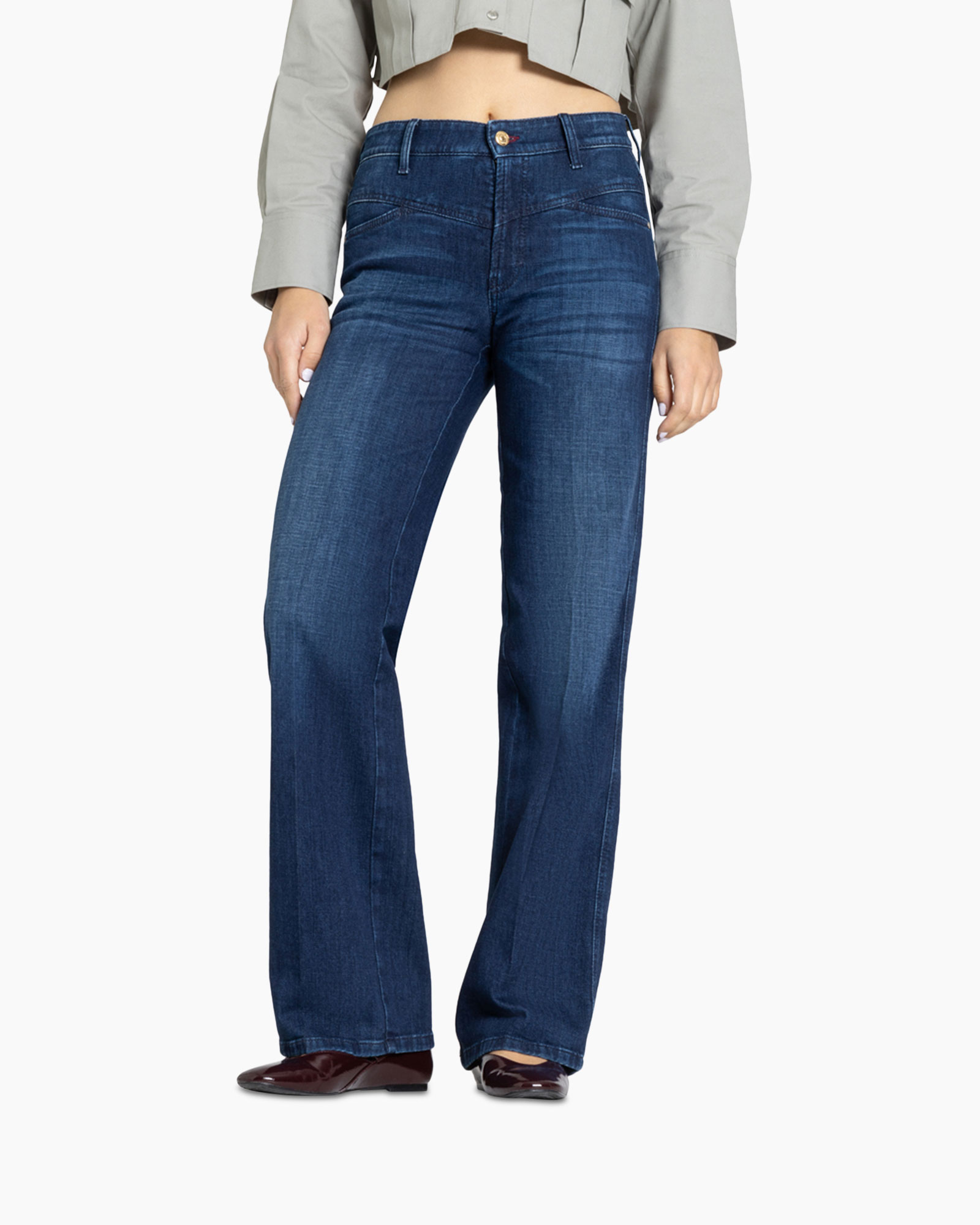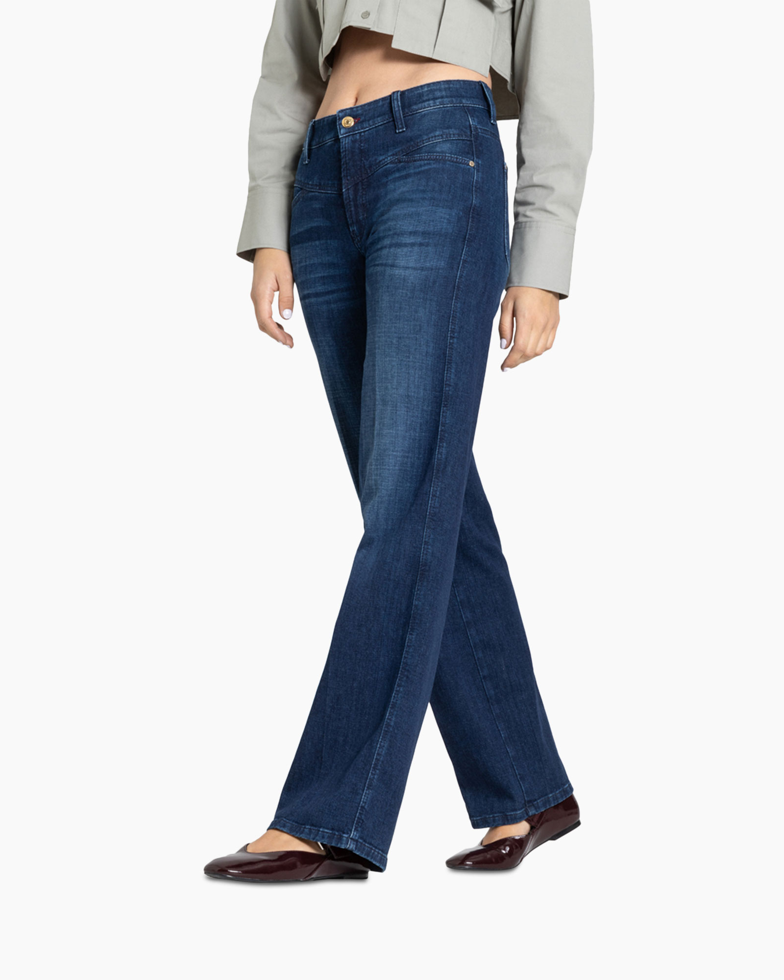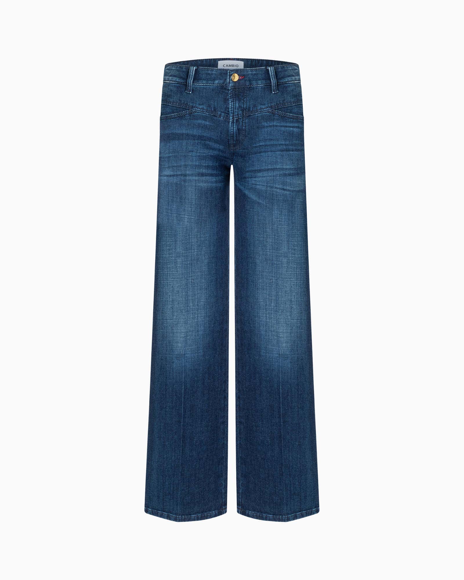 Jeans Aimee Seam True Indigo Blauw van Cambio geeft je een spijkerbroek die je garderobe direct aanvult met een fris accent. Deze jeans heeft een rijke True Indigo Blauwe kleur, verrijkt met een subtiele wassing die de diepte van de denim mooi laat uitkomen. Je ziet direct de comfortabele hogere taille en een pasvorm die strak begint en vanaf de knie wijder uitloopt. Deze wijde snit zorgt voor veel bewegingsvrijheid en geeft je silhouet een verlengde vorm. De voorkant heeft een klassieke knoopsluiting en de kenmerkende vijfzakkenstijl, met zowel praktische steekzakken als een klein muntzakje. Aan de achterzijde vind je twee opgestikte zakken. Een opvallend kenmerk zijn de verticale naden die over de gehele lengte van de voor- en achterkant van de pijpen lopen. Je draagt deze jeans met gemak, of je nu een casual dag hebt of een gelegenheid die iets meer aankleding vraagt.