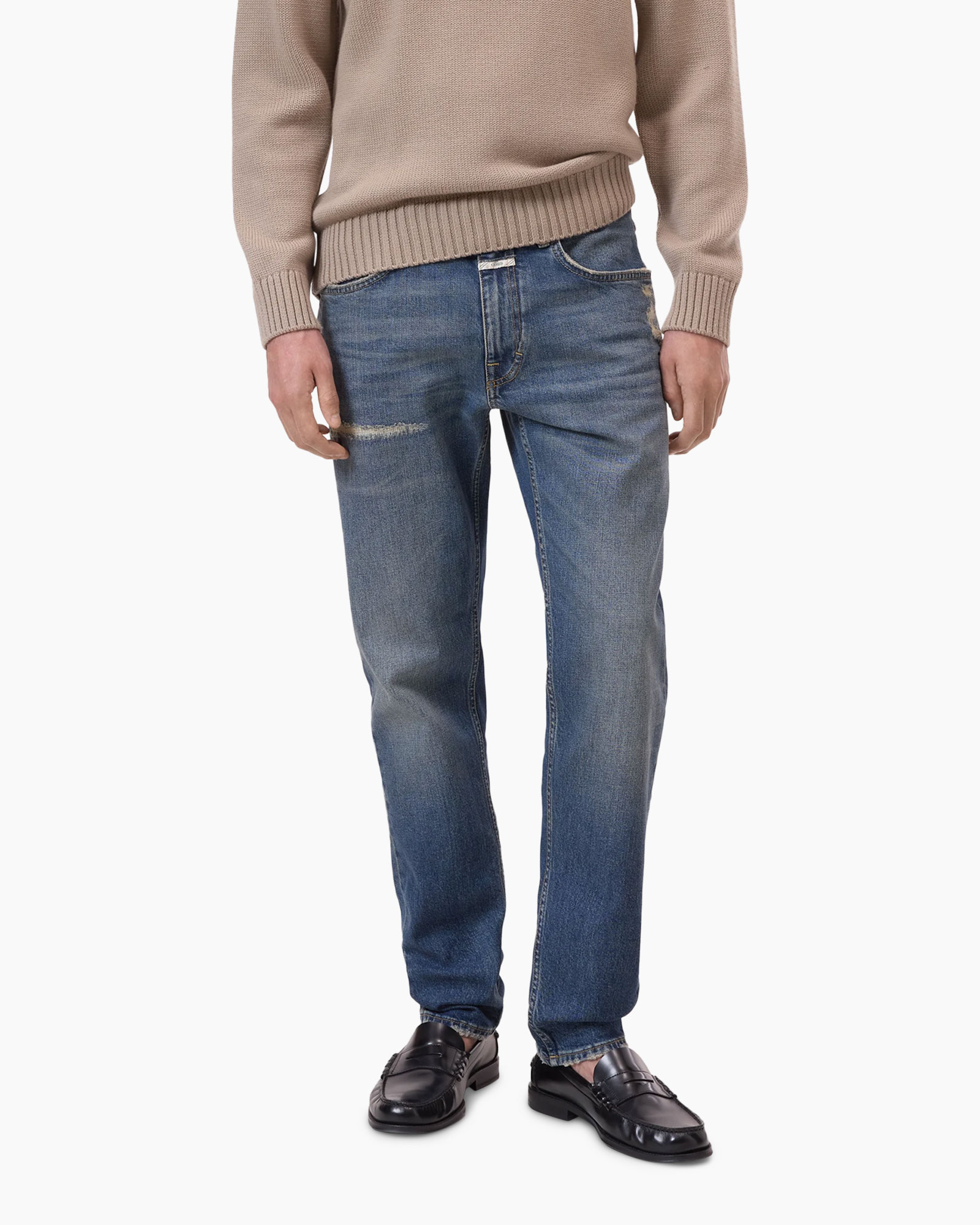Jeans Cooper True Blauw van Closed is de authentieke jeans voor jou. Deze jeans heeft een rechte pasvorm en biedt je daardoor volop bewegingsvrijheid. Je ervaart direct het comfort van deze broek. De kleur is een fraaie medium blauwe wassing, die je jeans een doorleefd karakter geeft. Kijk maar naar de subtiele verweerde plekken, inclusief een gerepareerde beschadiging op het bovenbeen en bij de rechter achterzak. Je sluit de broek eenvoudig met een knoopsluiting. De praktische vijf zakken – twee voor, een muntzakje en twee opgestikte zakken achter – bieden ruimte voor jouw benodigdheden. Opvallend zijn de contrasterende stiksels, die de lijnen van de jeans benadrukken. Achterop de tailleband vind je een strak wit leren label. Deze jeans voegt een robuuste touch toe aan jouw garderobe.