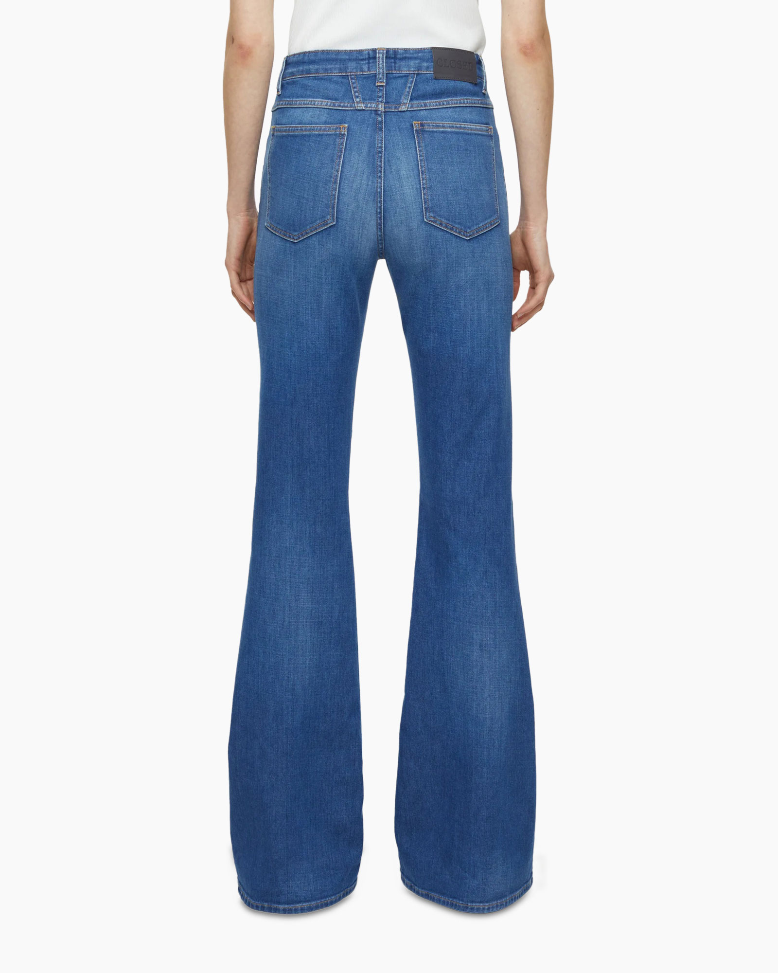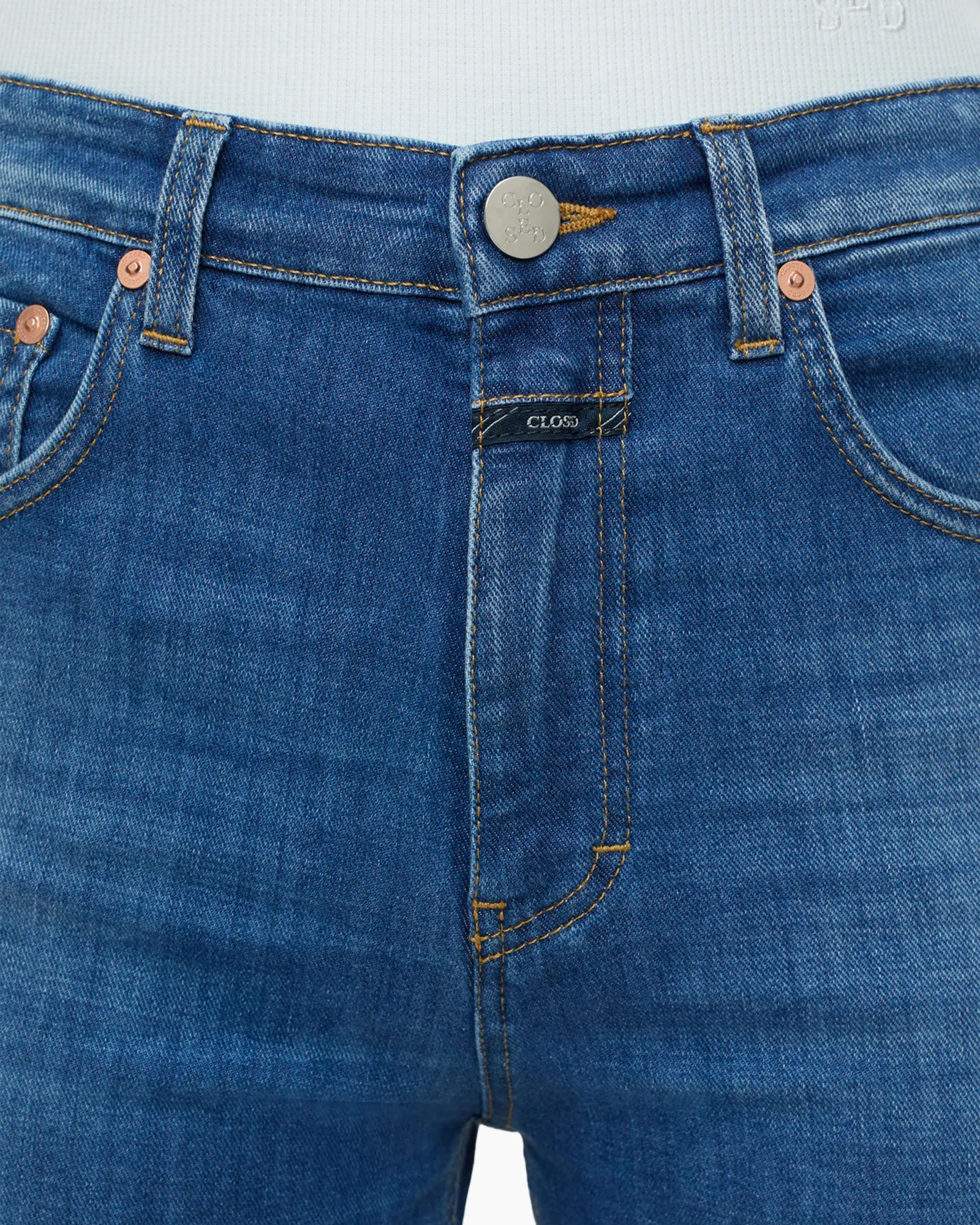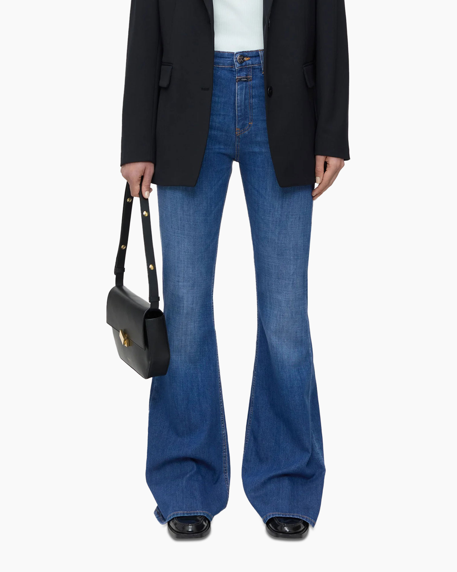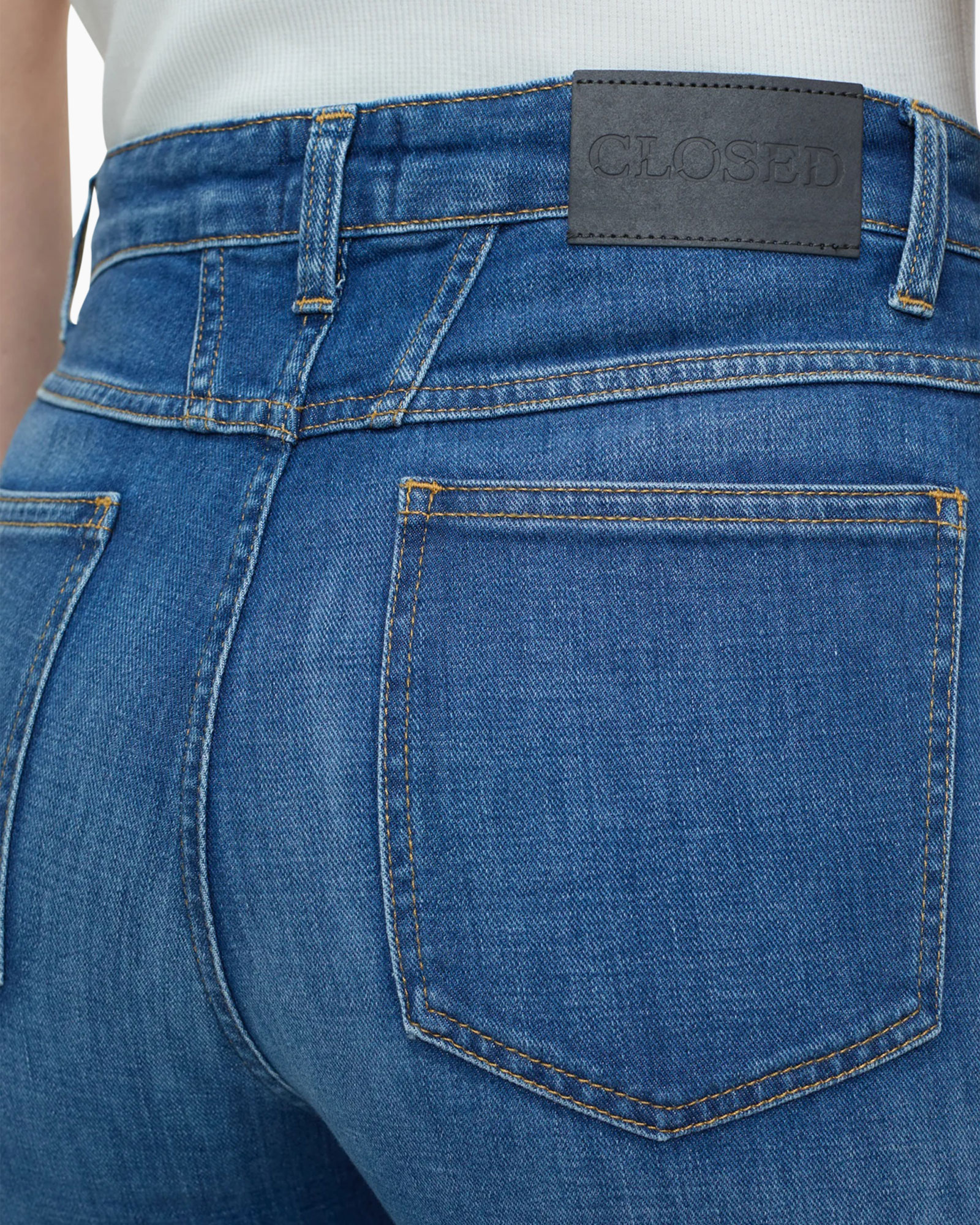Jeans Rawlin Donker Blauw van Closed is de jeans die je zoekt. Deze jeans heeft een hoge taille en valt direct op door de wijde pijpen die uitlopen. Deze pasvorm benadrukt je figuur bij de heupen en dijen, waarna de pijpen breed uitlopen vanaf de knie. De blauwe wassing is een middentint, met subtiele lichte slijtageplekken voor een levendig effect. Je ziet de klassieke vijf-pocket indeling, compleet met knoop- en ritssluiting aan de voorkant. De stiksels langs de naden en zakken voegen een fijne touch toe. Op de achterkant van de tailleband zit een donker label. Dit zijn details die tellen.