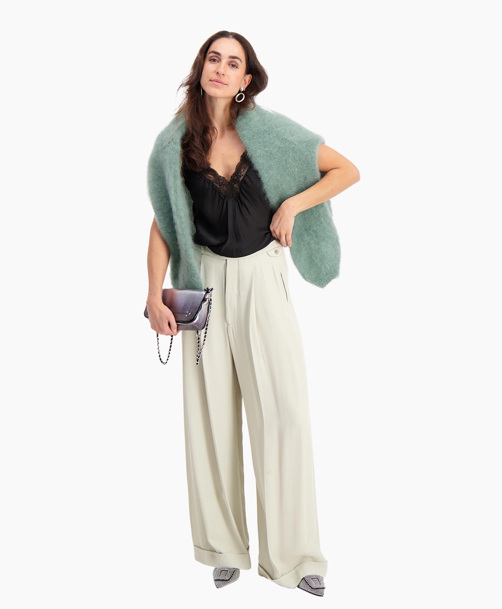 Als je op zoek bent naar een luchtige toevoeging aan je garderobe, dan is de Top Singlet Zwart van d’Arc precies wat je zoekt. De soepel vallende pasvorm geeft je alle bewegingsvrijheid voor elke gelegenheid. Een diepe V-halslijn vormt het middelpunt, versterkt door een fraaie kanten rand die doorloopt in de brede schouderbanden. Onder de borst zie je subtiele plooien die zorgen voor een flatterend volume. Het intense zwart van de stof laat zich perfect combineren met zowel lichte als donkere items. Maak nu de keuze voor dit veelzijdige kledingstuk en voeg direct een tijdloos basisstuk toe aan je collectie.