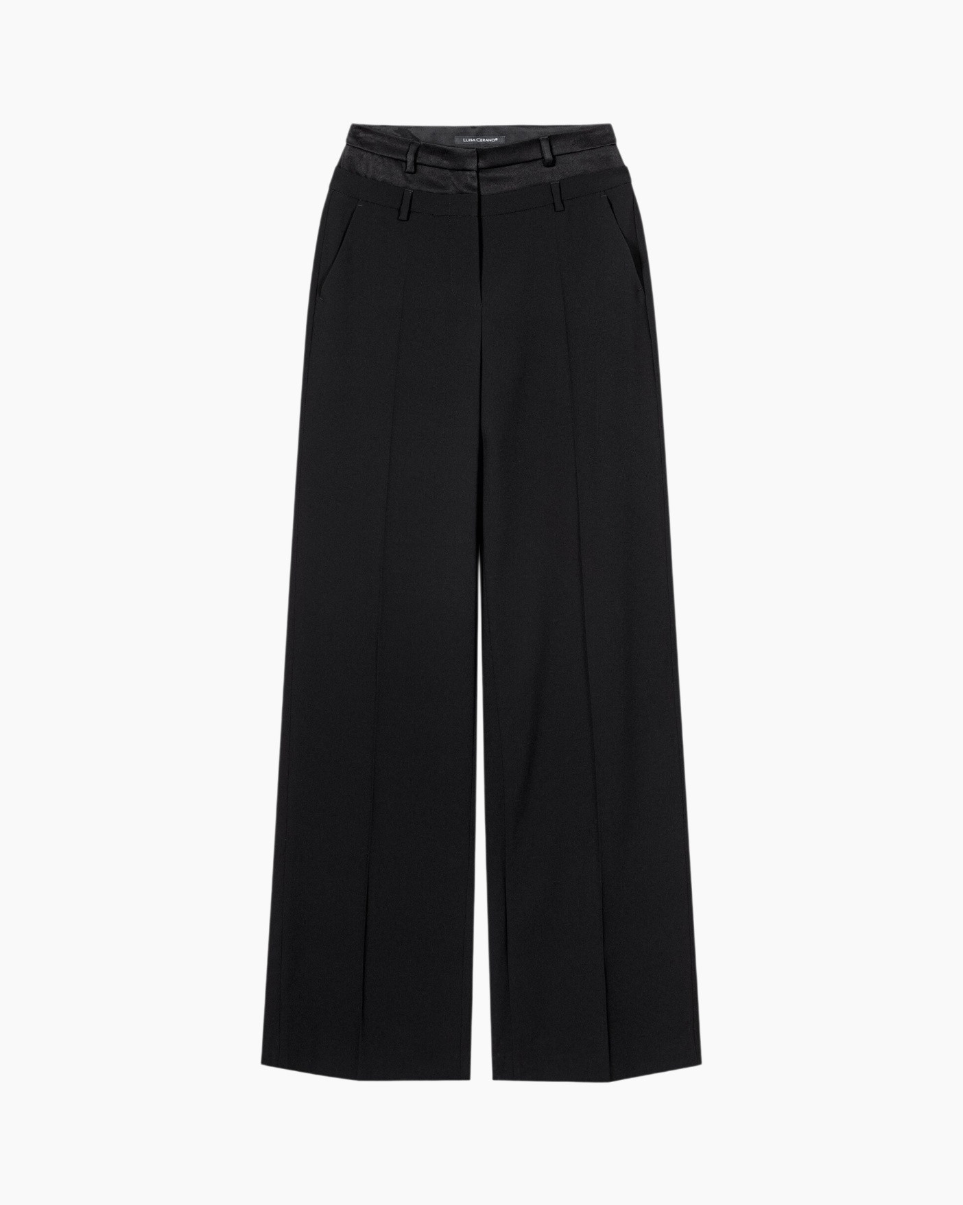 Deze zwarte broek valt op door de dubbele band in de taille. Ruime pijpen vormen een krachtig beeld bij elke stap. Het soepele materiaal beweegt vloeiend mee. De afwerking geeft een strakke vorm.