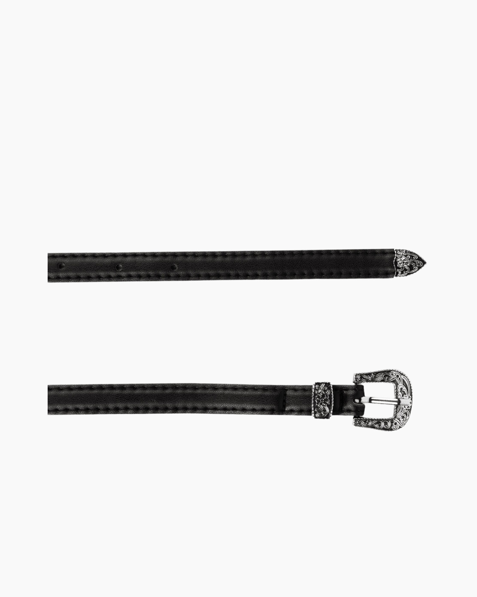 Deze zwarte riem van soepel leer overtuigt door de zilverkleurige hardware. Het smalle ontwerp krijgt karakter door de rijk versierde gesp. De subtiele glans en doorgestikte randen geven een verzorgde uitstraling. De donkere kleur vormt een rustige basis voor de details.