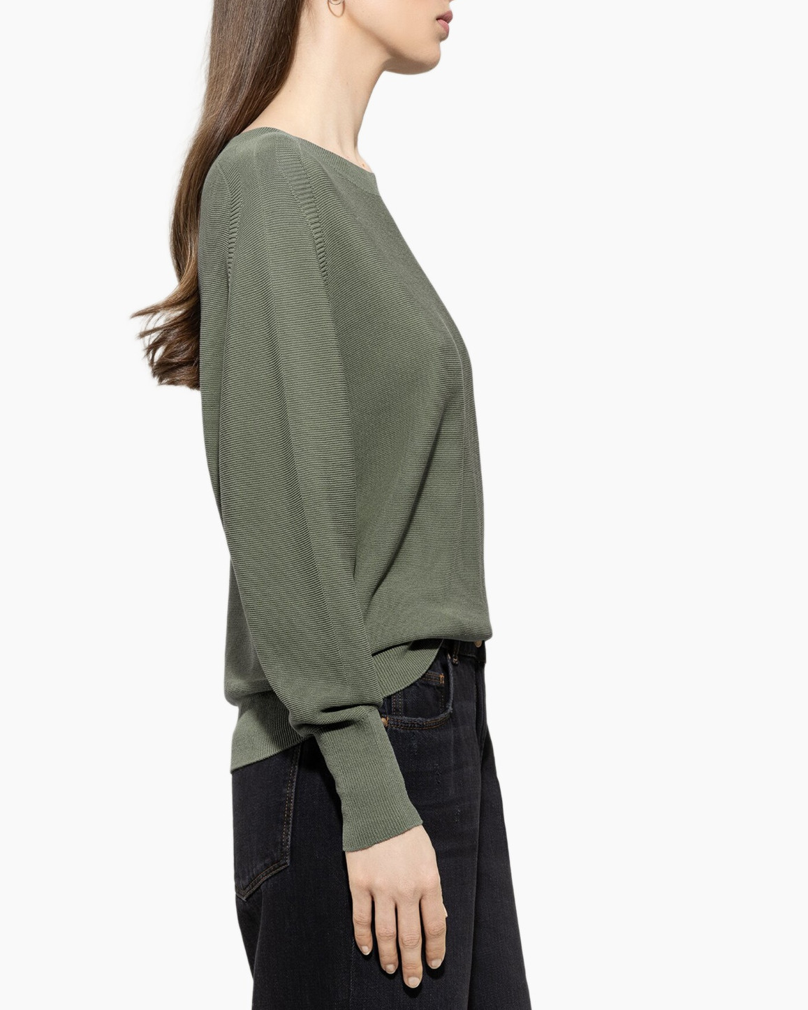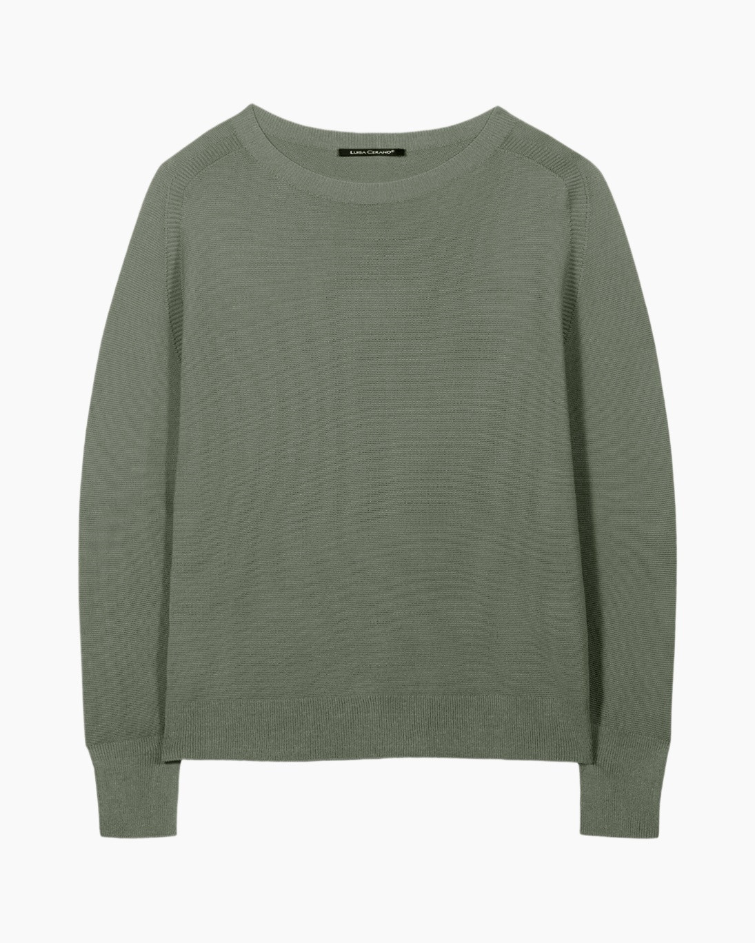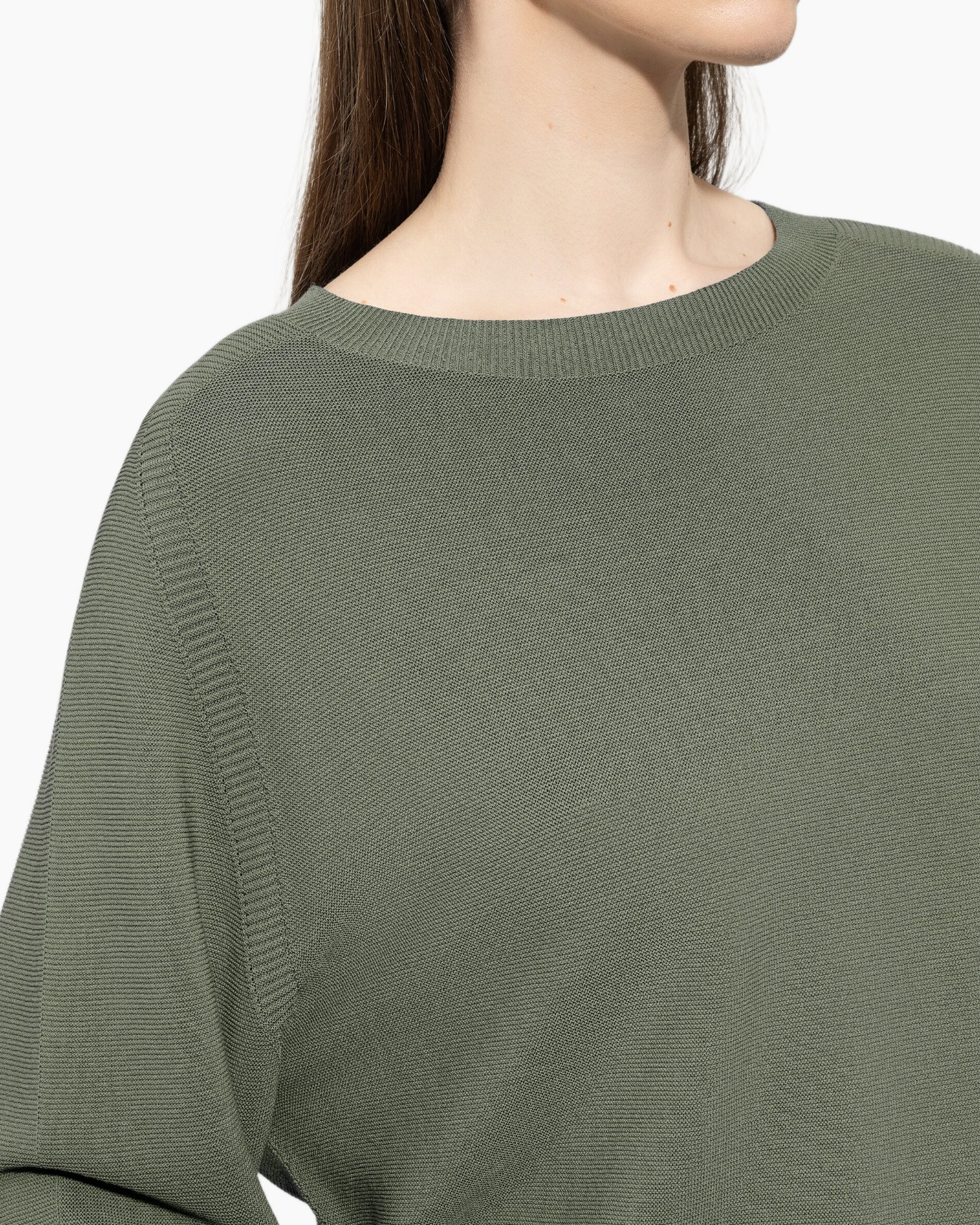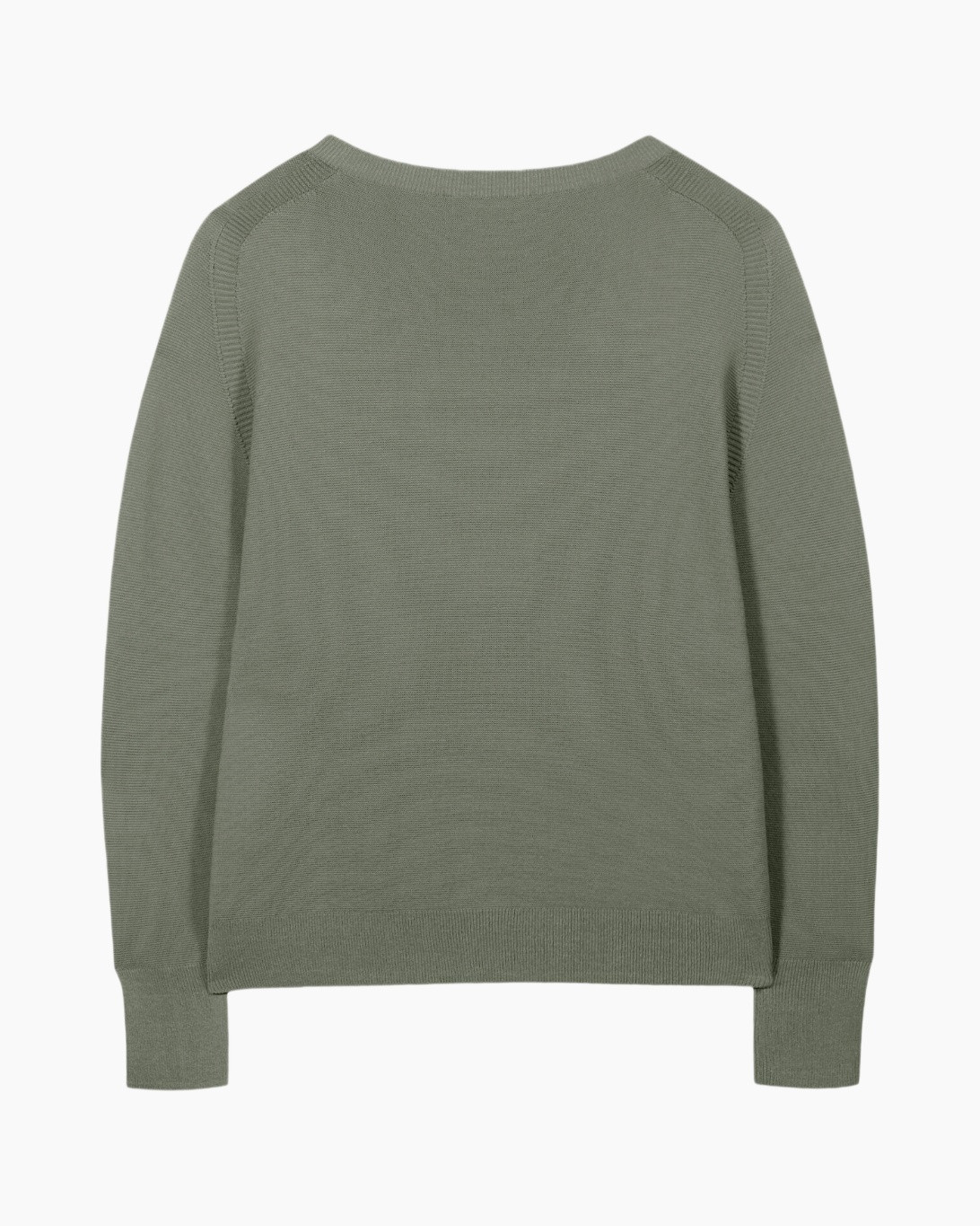 Deze zachte trui in een vergrijsde groentint biedt warmte tijdens gure dagen. Het fijngebreide materiaal voelt prettig en vormvast aan. De raglanmouwen geven structuur bij de schouders. Je draagt dit kledingstuk met plezier.