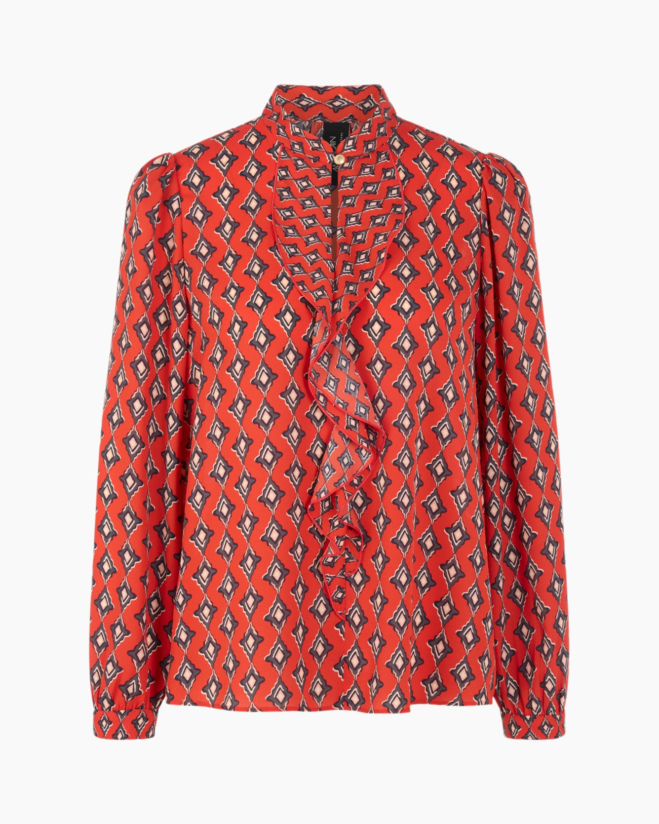 Deze rode blouse toont een levendig karakter door het geometrische ruitpatroon in zwart en beige. De soepele stof zorgt voor een comfortabel gevoel en een zachte valling. Verfijnde ruches langs de halslijn geven een vrouwelijk accent. Dit ontwerp brengt kleur in je zomergarderobe.