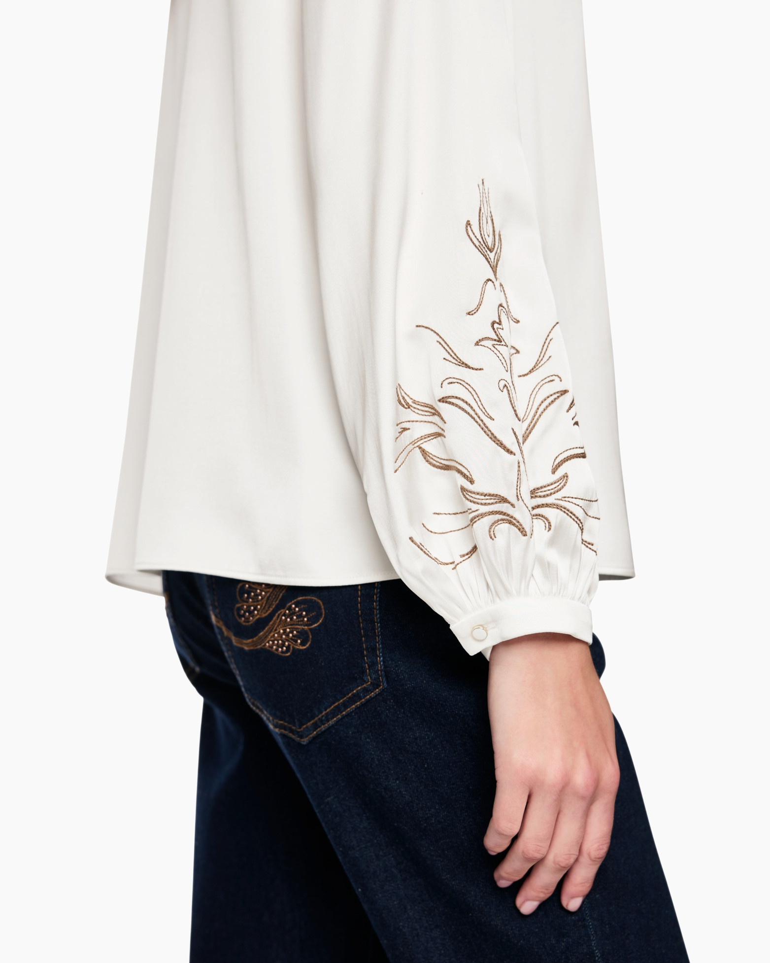 Deze off white blouse toont een zijdeachtige glans. Het soepele materiaal beweegt gracieus mee. Goudkleurig borduursel met organische takken siert de schouders en mouwen. De kraag mondt uit in een opening aan de voorzijde.