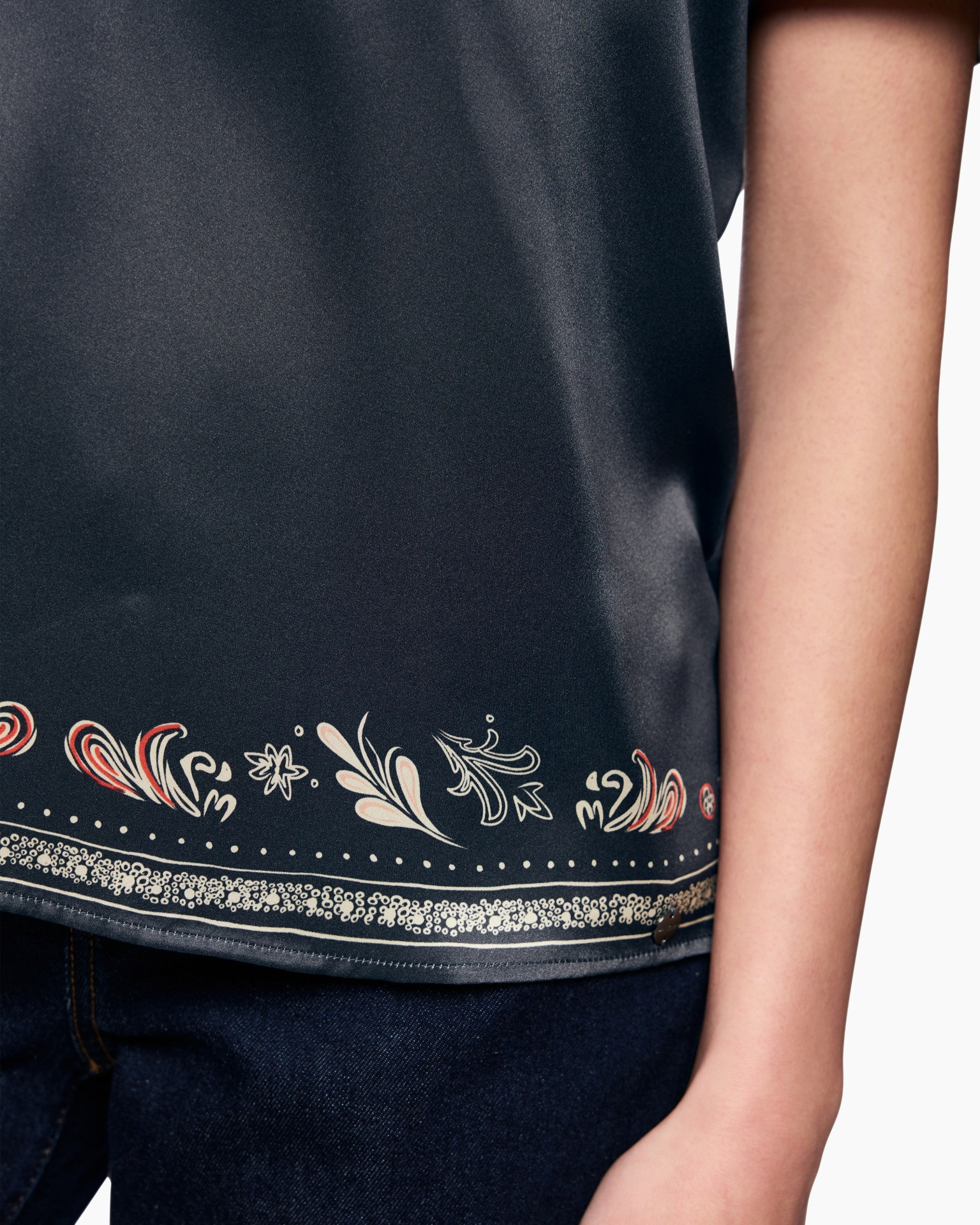 Dit satijnen blusenshirt in diep petrol brengt een subtiele glinstering in de zomergarderobe. De soepele stof valt losjes en voelt koel aan op de huid tijdens warme dagen. De v-hals krijgt extra nadruk door een verfijnde decoratie. Krulmotieven en bloemvormen sieren de halslijn, mouwen en onderzijde van de blouse.