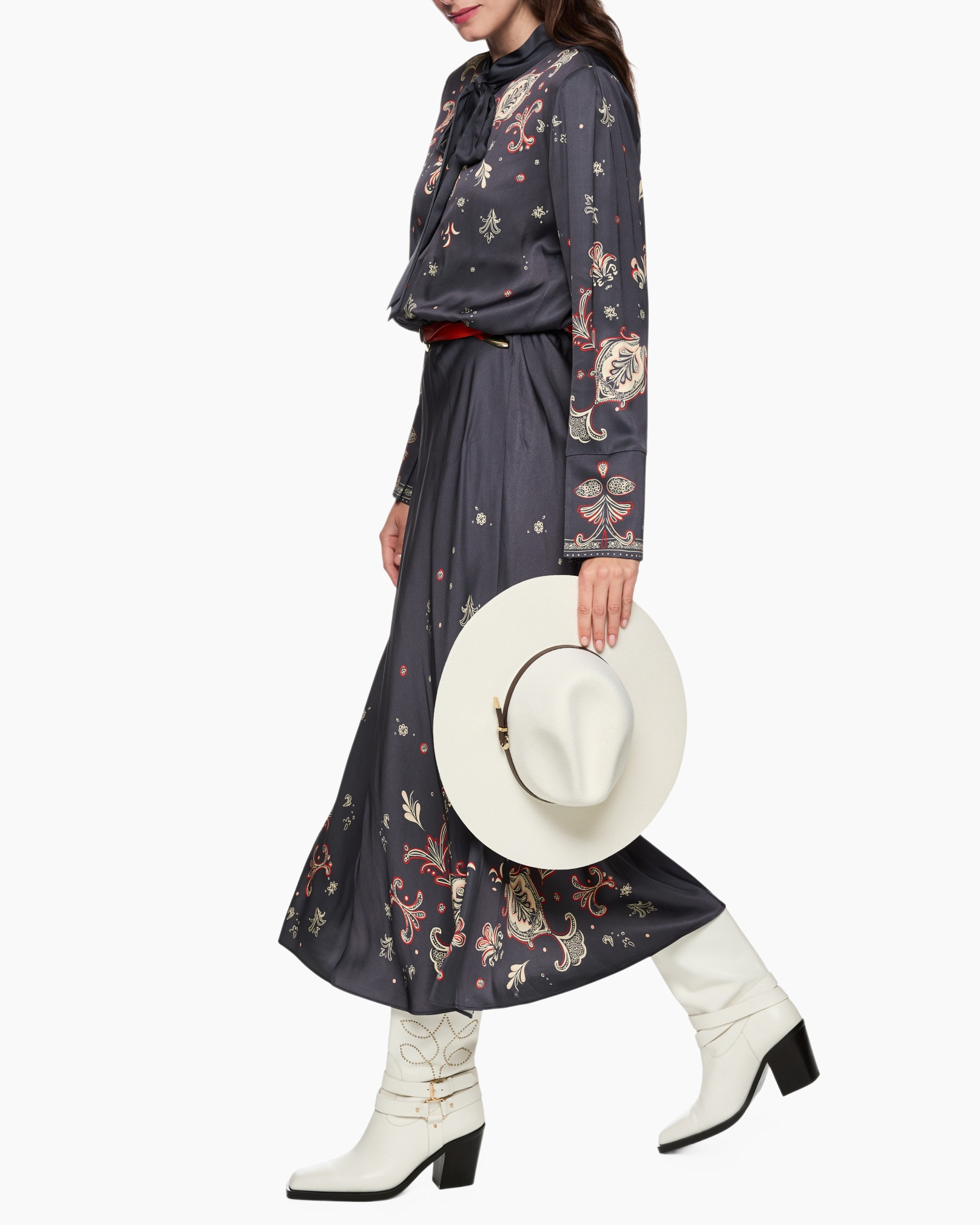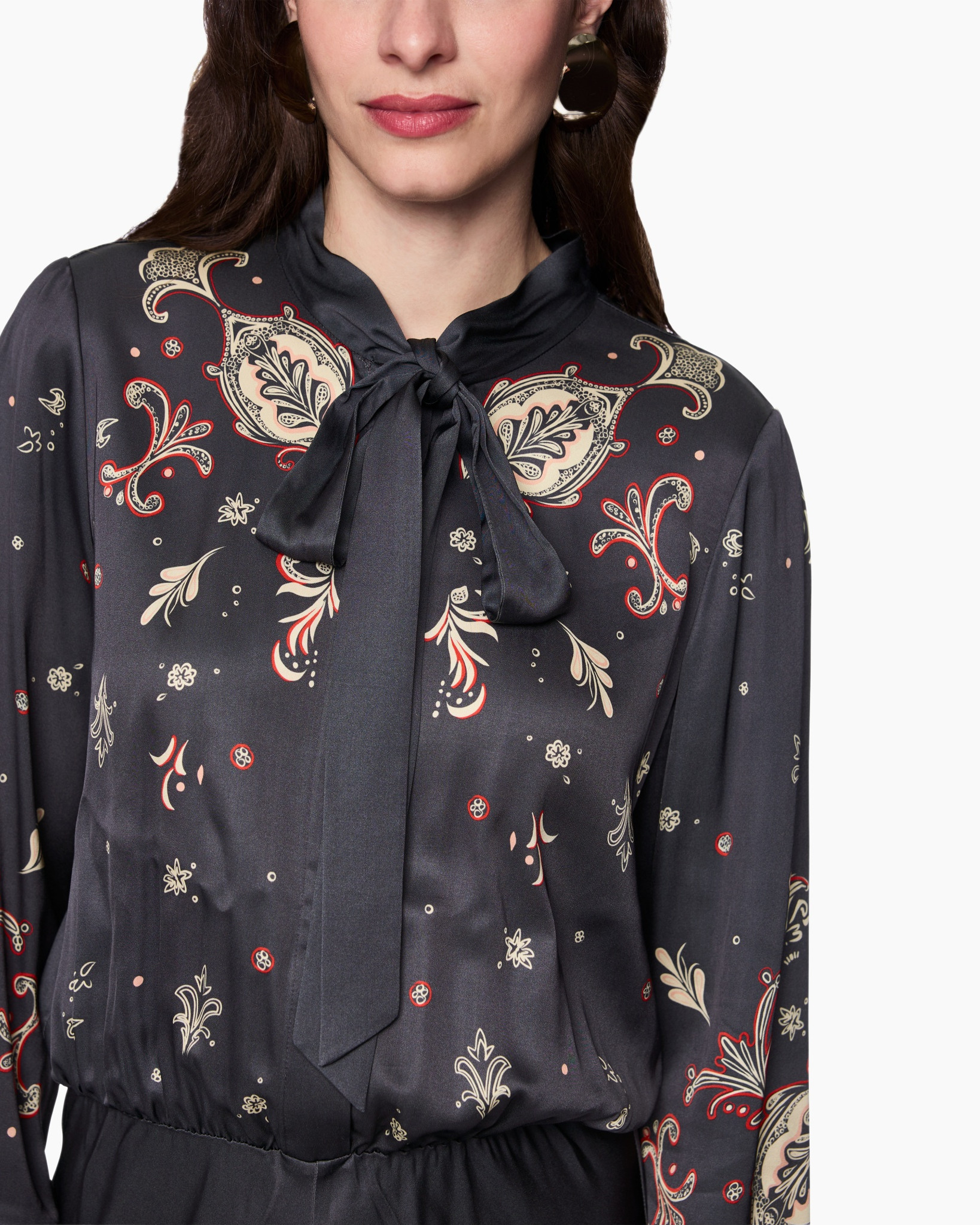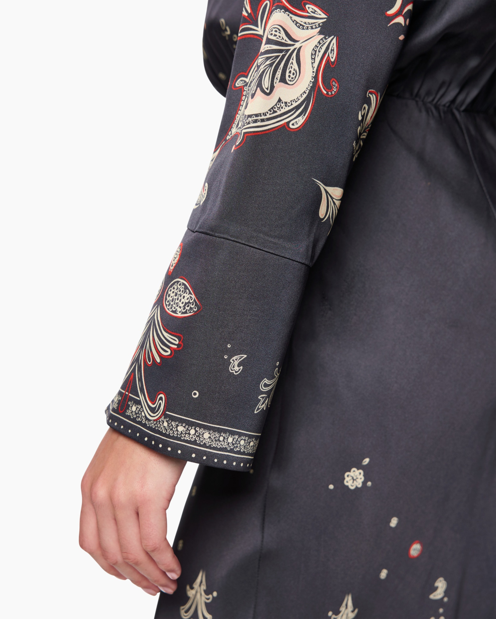 Deze petrolblauwe jurk verrijkt de zomergarderobe met een vloeiende stof en verfijnde patronen. De diepe kleur vormt de basis voor paisley-ornamenten in warme rood- en crèmetinten. Je geniet van een elegante verschijning door de strikkraag die de hals siert. De lange mouwen met versierde manchetten maken het geheel compleet.