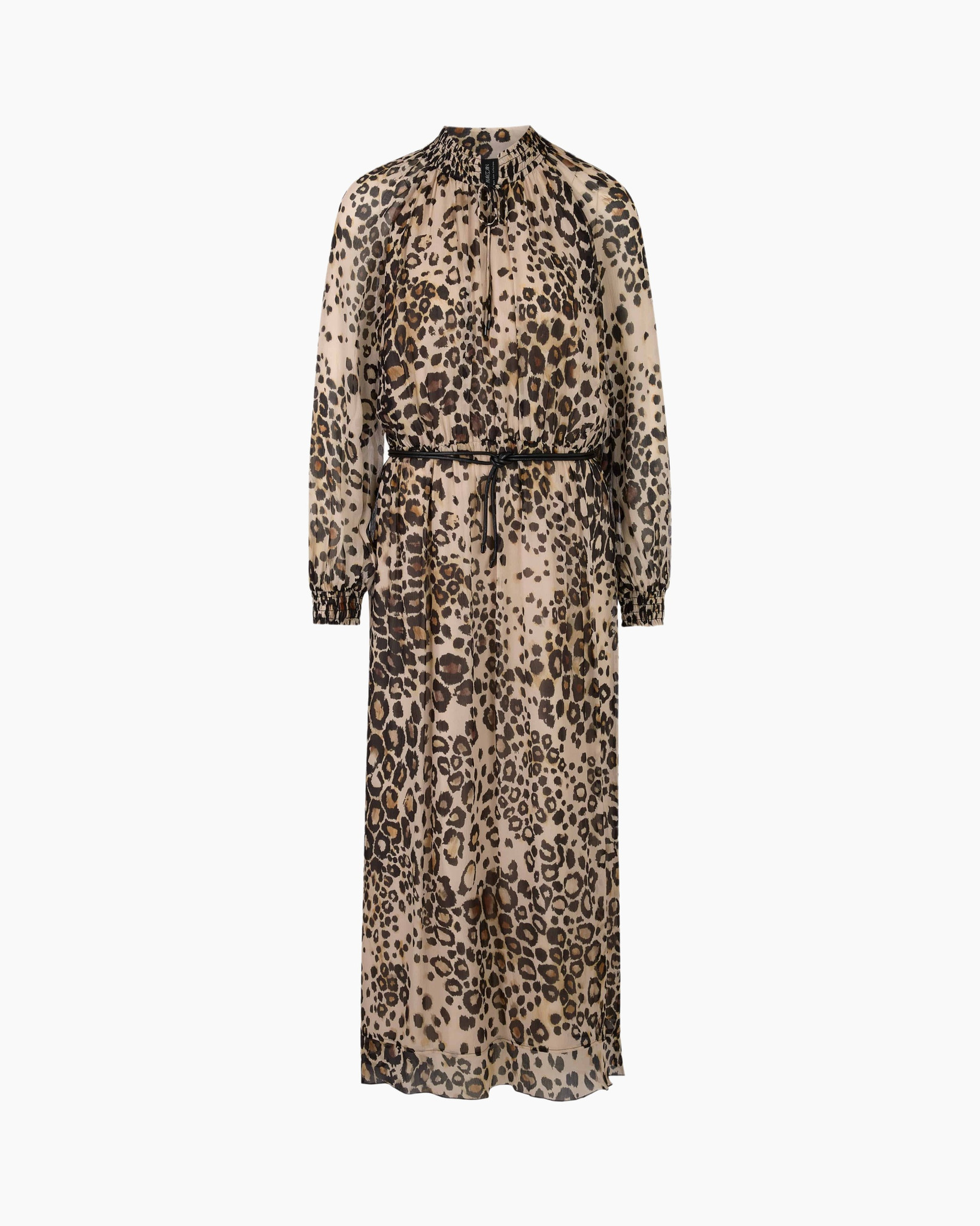 Deze elegante maxi-jurk met luipaardprint en V-hals, die met twee koorden individueel kan worden aangepast, is een echte blikvanger. De plooien in de taille, versterkt door een elastische tailleband, zorgen voor een perfecte pasvorm en een hoog draagcomfort. Lange mouwen met elastiek en de volant aan de zoom geven de jurk een vrouwelijke touch. De soepel vallende stof zorgt voor een prettige bewegingsvrijheid. Een aparte riem maakt het ontwerp af – ideaal voor speciale gelegenheden.