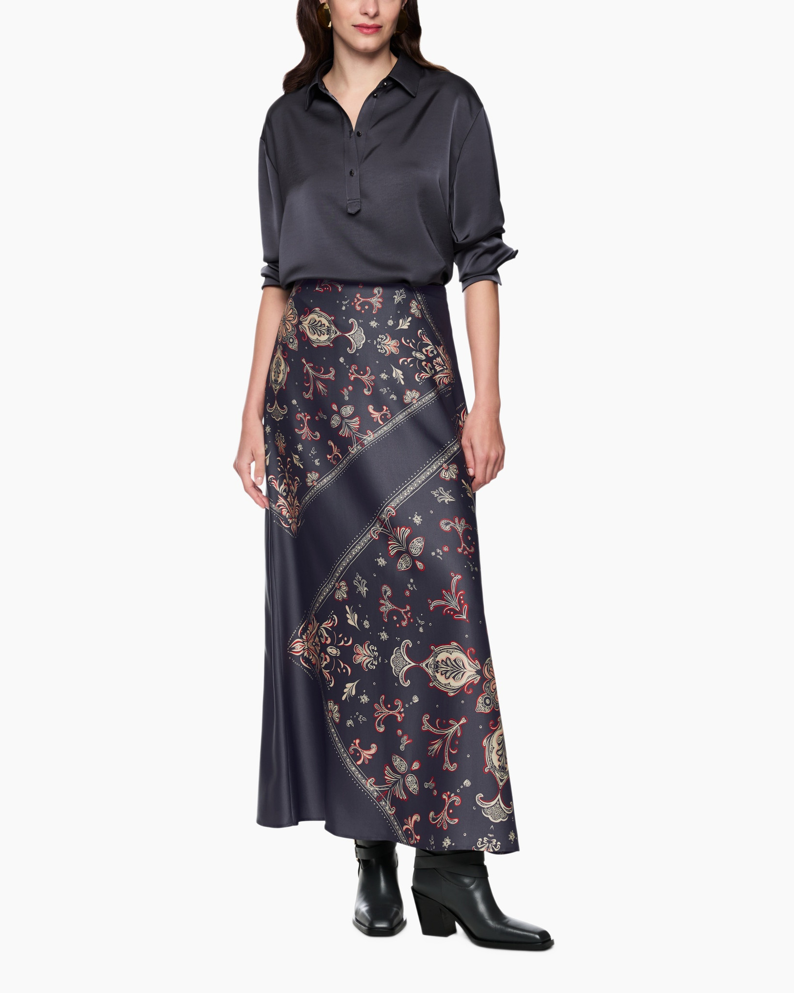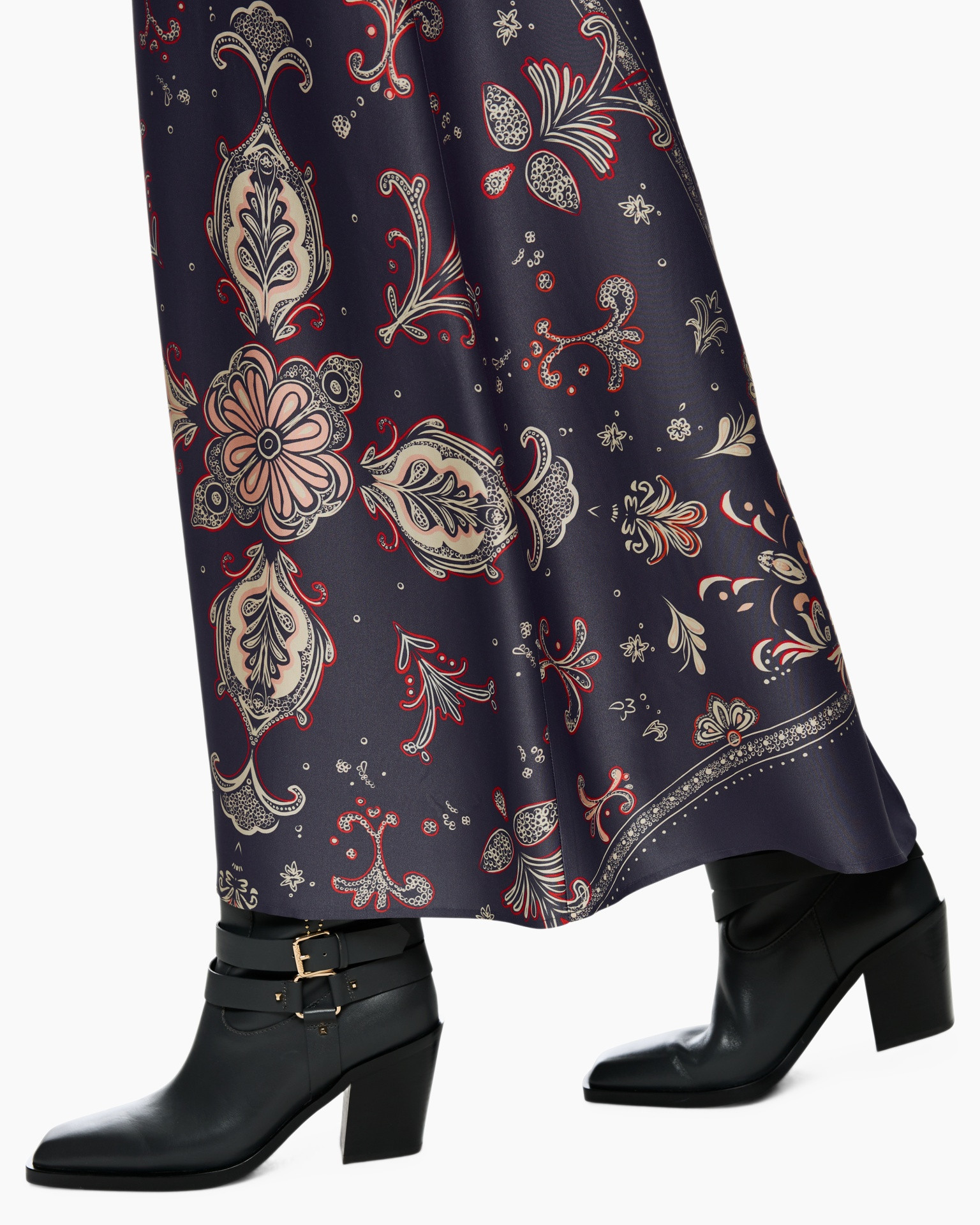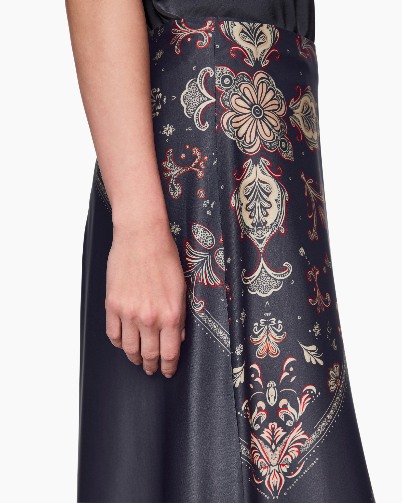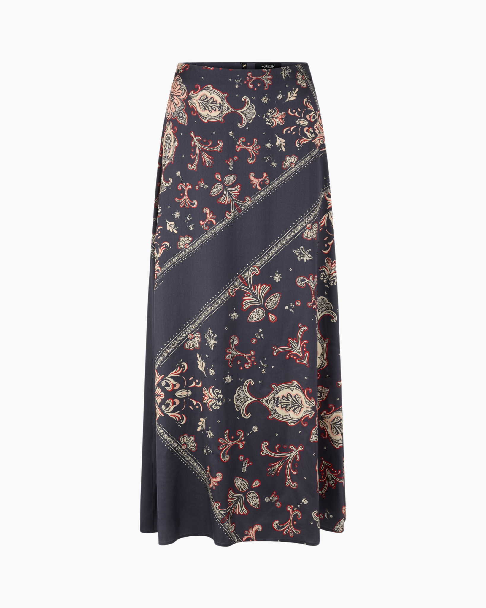 Deze maxi-rok in petrol valt soepel en beweegt elegant mee. Het rijke decor van paisley-motieven in beige en rood geeft een karakteristieke uitstraling. De schuine baanverdeling brengt dynamiek in het ontwerp. Een gladde afwerking zorgt voor een hoogwaardig gevoel op de huid.
