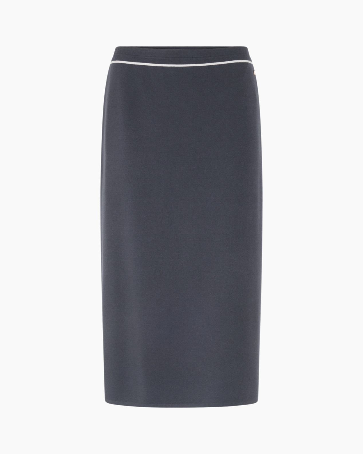 Deze rok in de kleur petrol valt soepel langs het lichaam tot op de knie. De fijne stof behoudt de hele dag een strakke vorm. Een witte bies en een goudkleurig embleem sieren de tailleband. Het materiaal voelt zacht aan op de huid.
