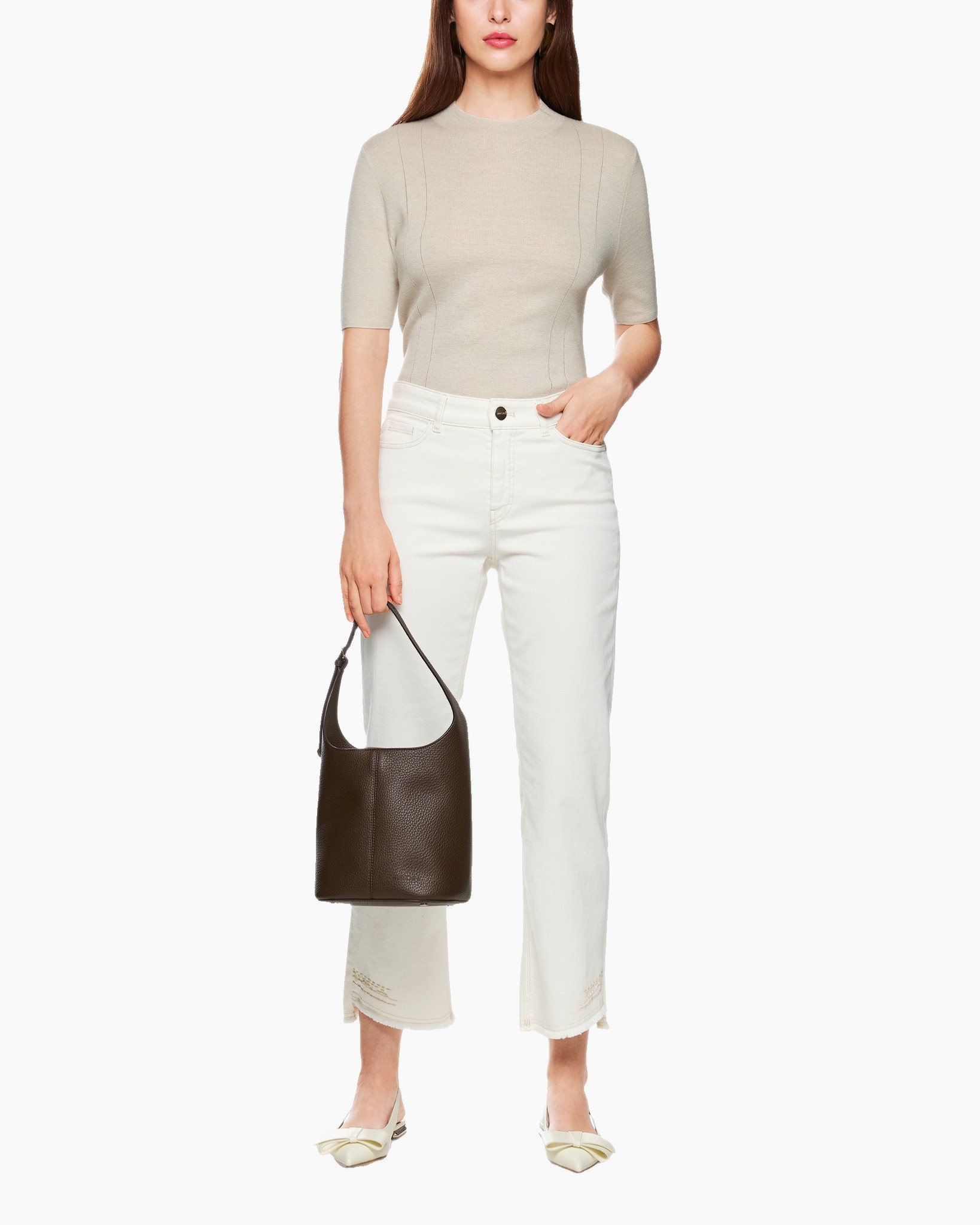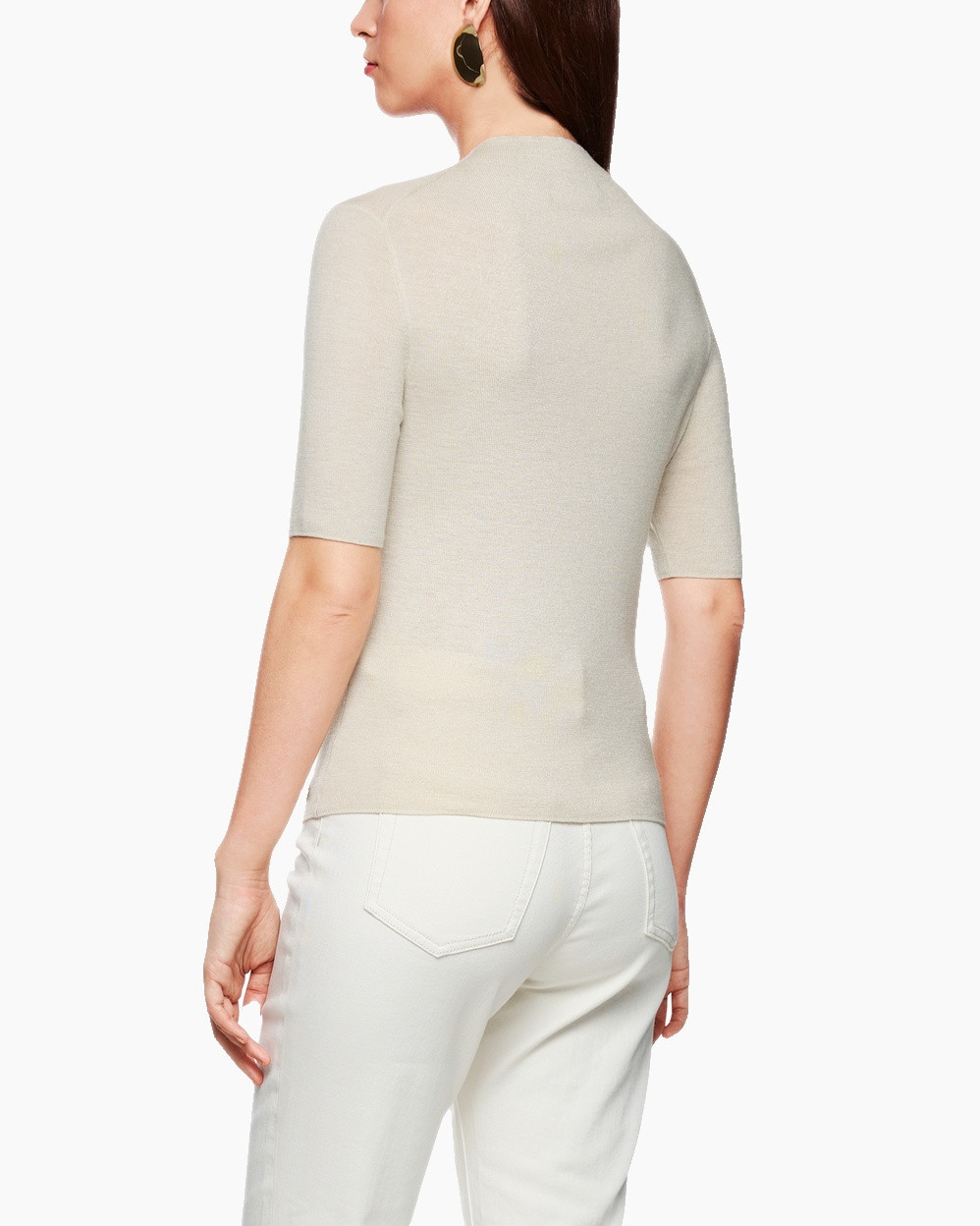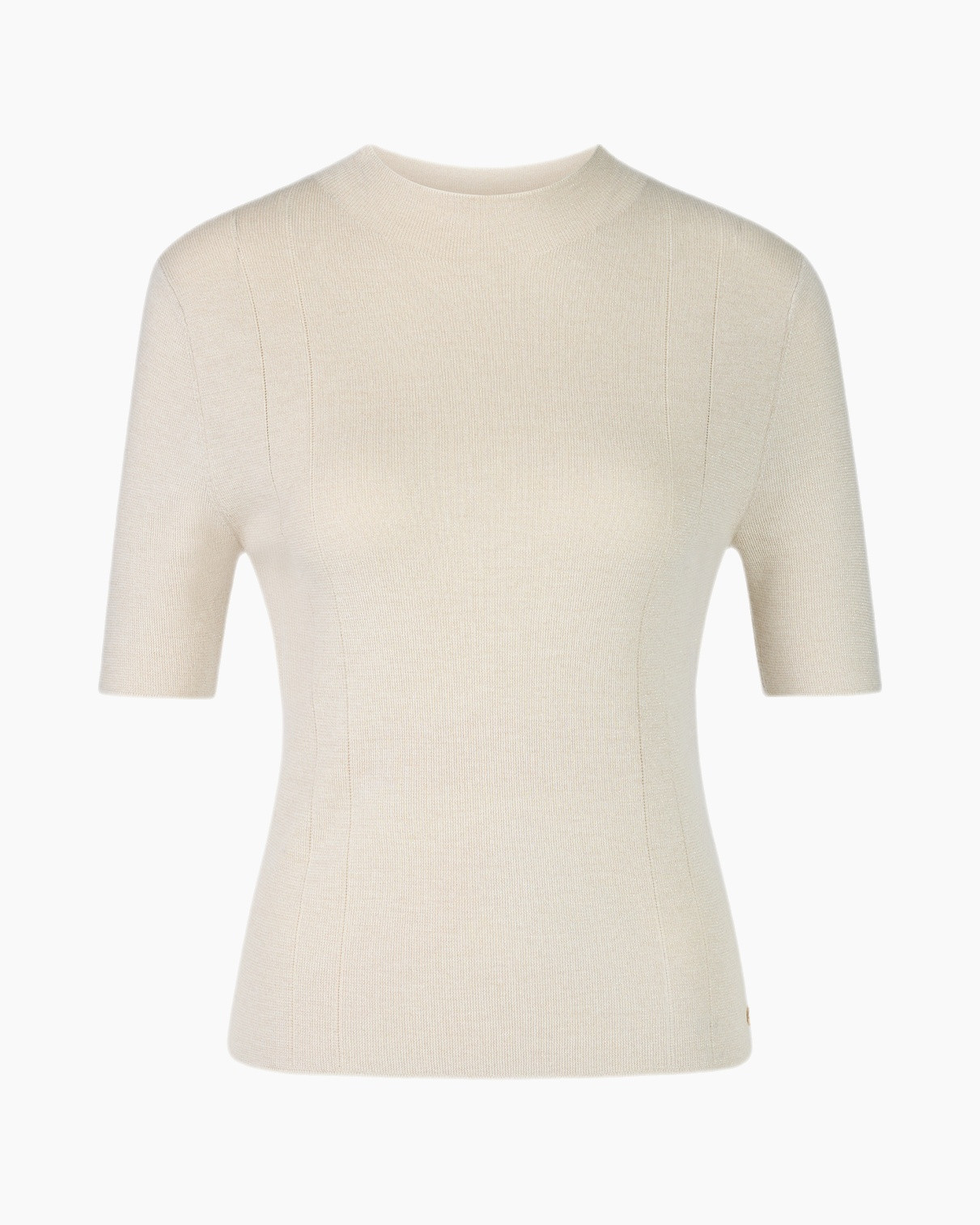 Met zijn glanzende lurexgaren is dit gebreide shirt een ideale basic. Het heeft een nauwsluitende pasvorm met een iets opstaande kraag en is zeer comfortabel om te dragen. De halflange mouwen benadrukken de elegante stijl.