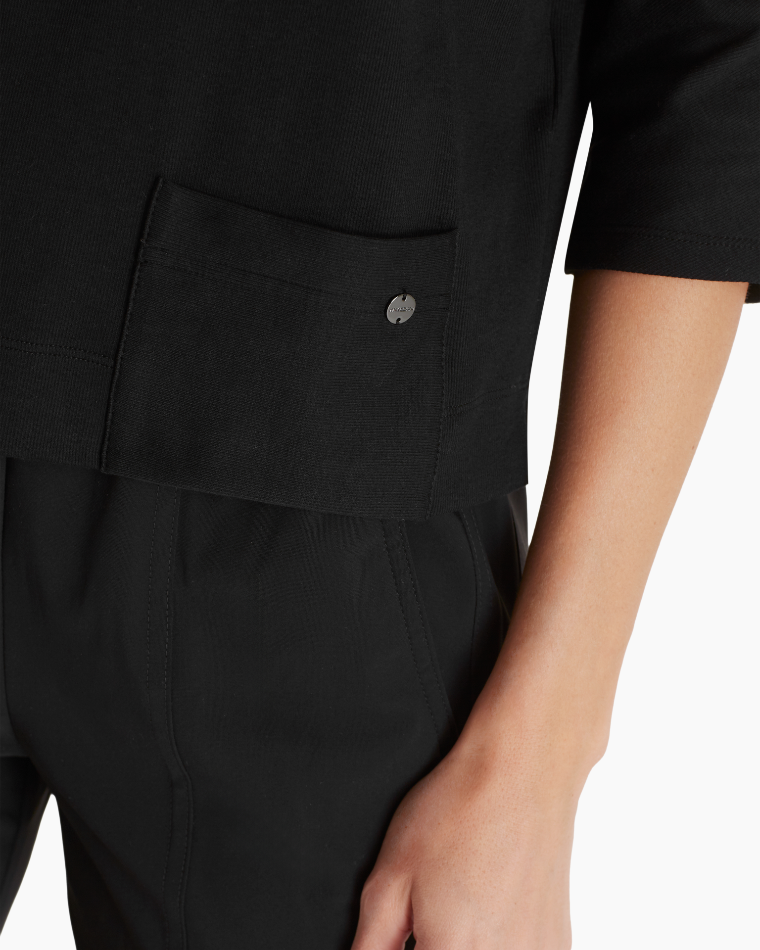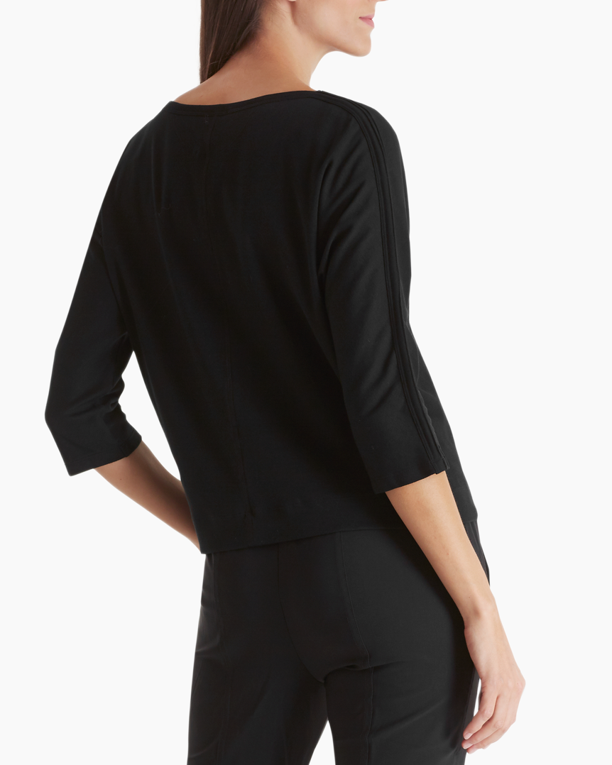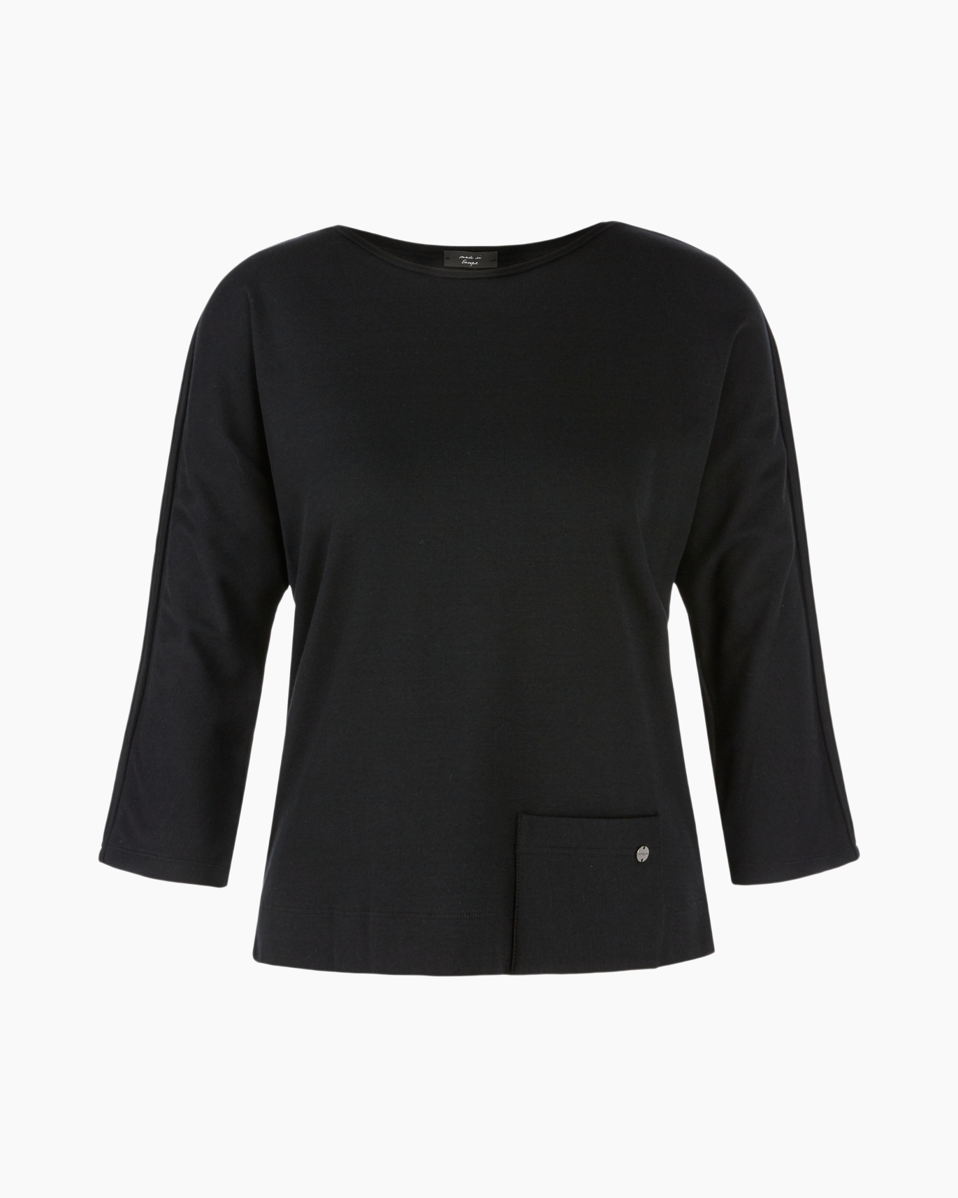 Deze zwarte top heeft een elegante boothals. Het soepele materiaal valt ruim tot op de heup voor een verzorgde uitstraling. Een subtiel detail is het opgestikte zakje aan de voorzijde met een metalen knoopje. De diepzwarte kleur is onmisbaar in de zomer.