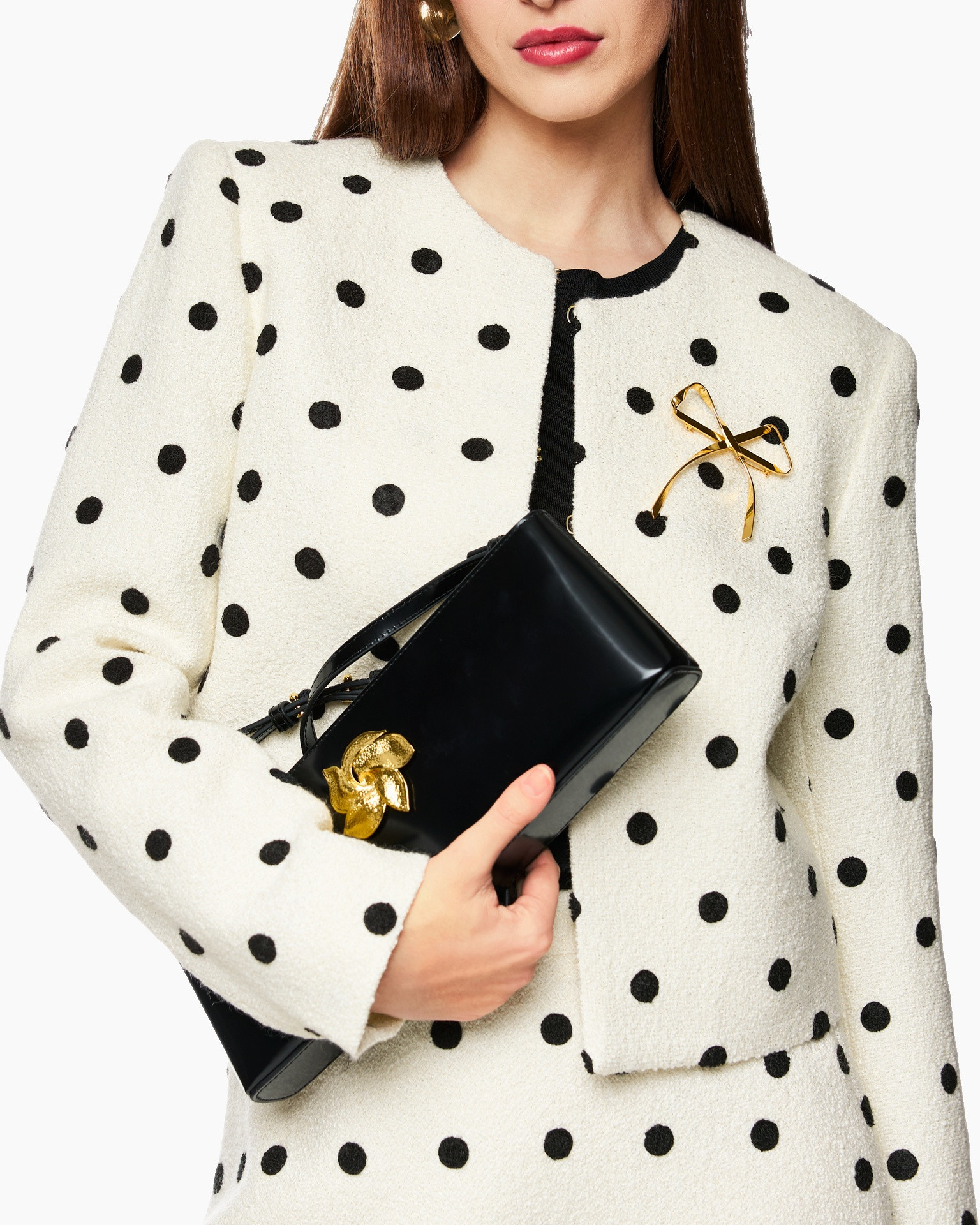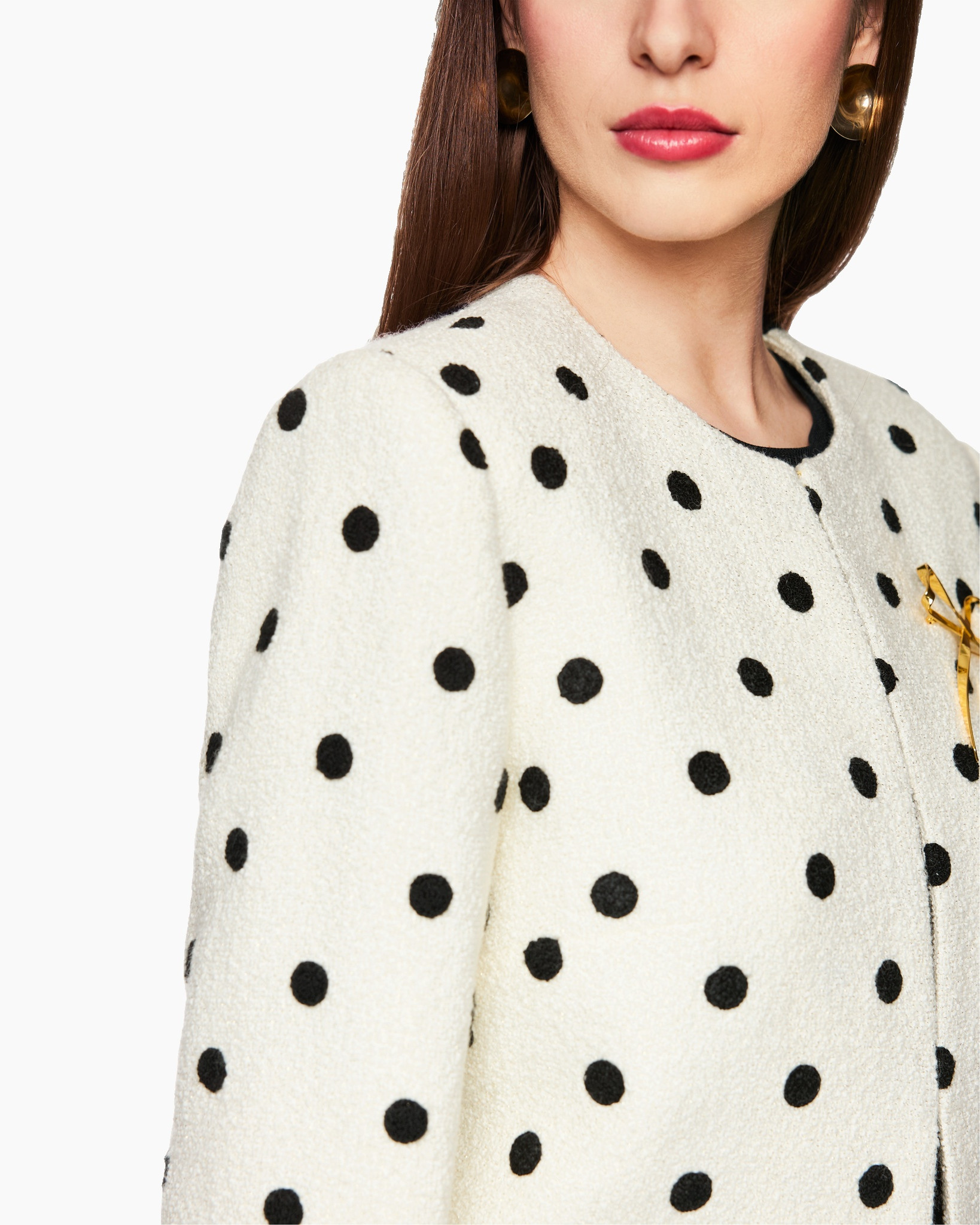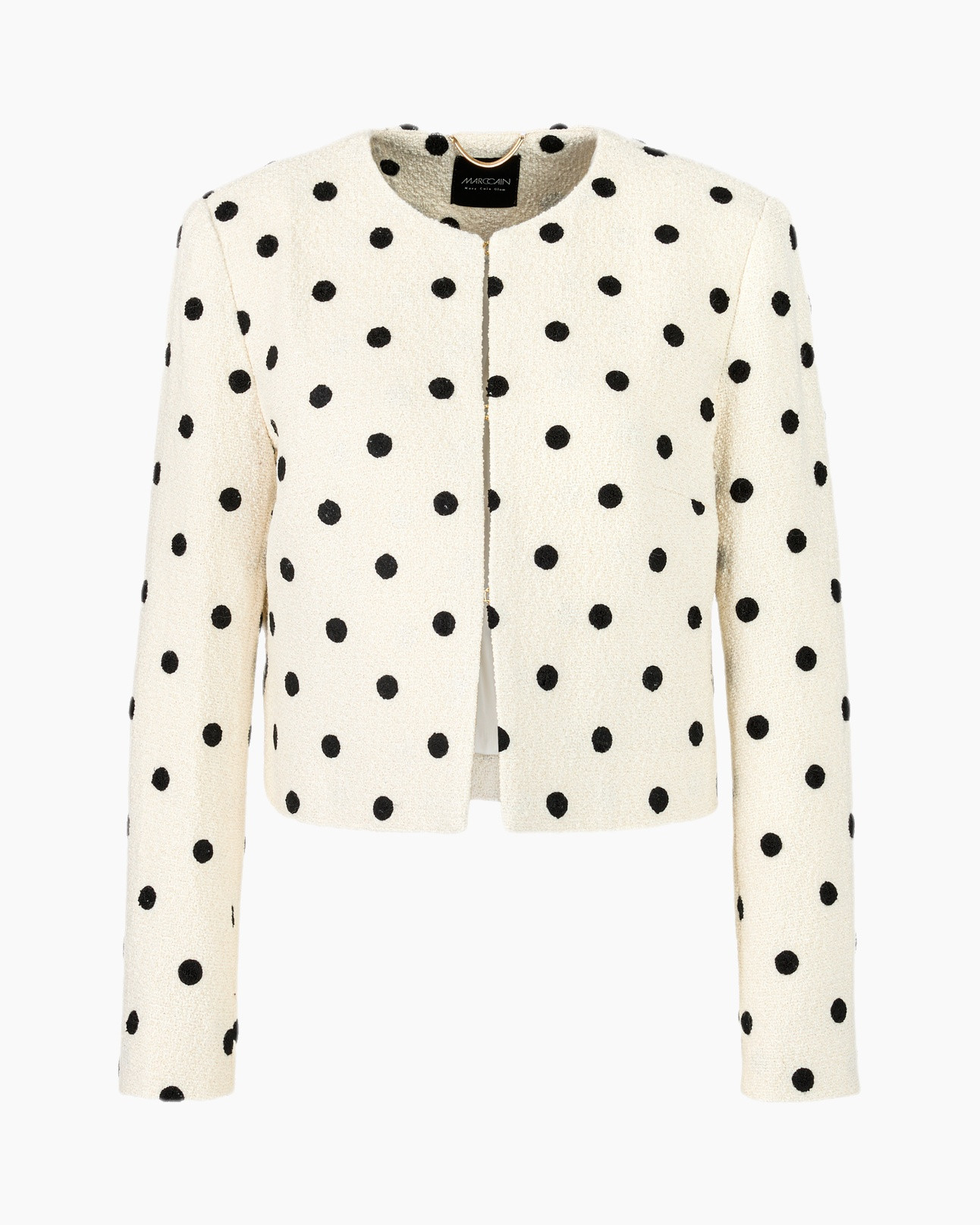 Het korte jasje heeft een boxy snit en is voorzien van een opvallend stippendessin. Een gouden lurexdraad zorgt voor een subtiel glinsterend effect. Het jasje kan worden vastgemaakt met drie goudkleurige sluitingen die kunnen worden vastgehaakt. Met een gevoerde binnenkant en gewatteerde schouders.