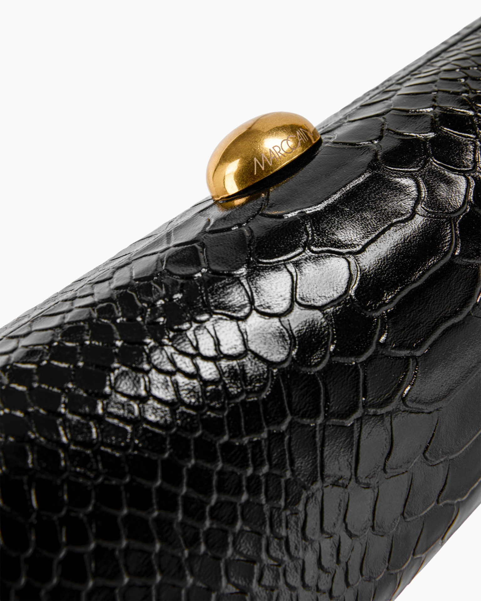 Deze zwarte avondtas heeft een gedetailleerde slangenstructuur. Het ronde ontwerp biedt ruimte voor benodigdheden tijdens een feestelijke zomeravond. De glanzende afwerking zorgt voor een verzorgde verschijning. Op de goudkleurige bolvormige sluiting staat de naam MARCCAIN gegraveerd.