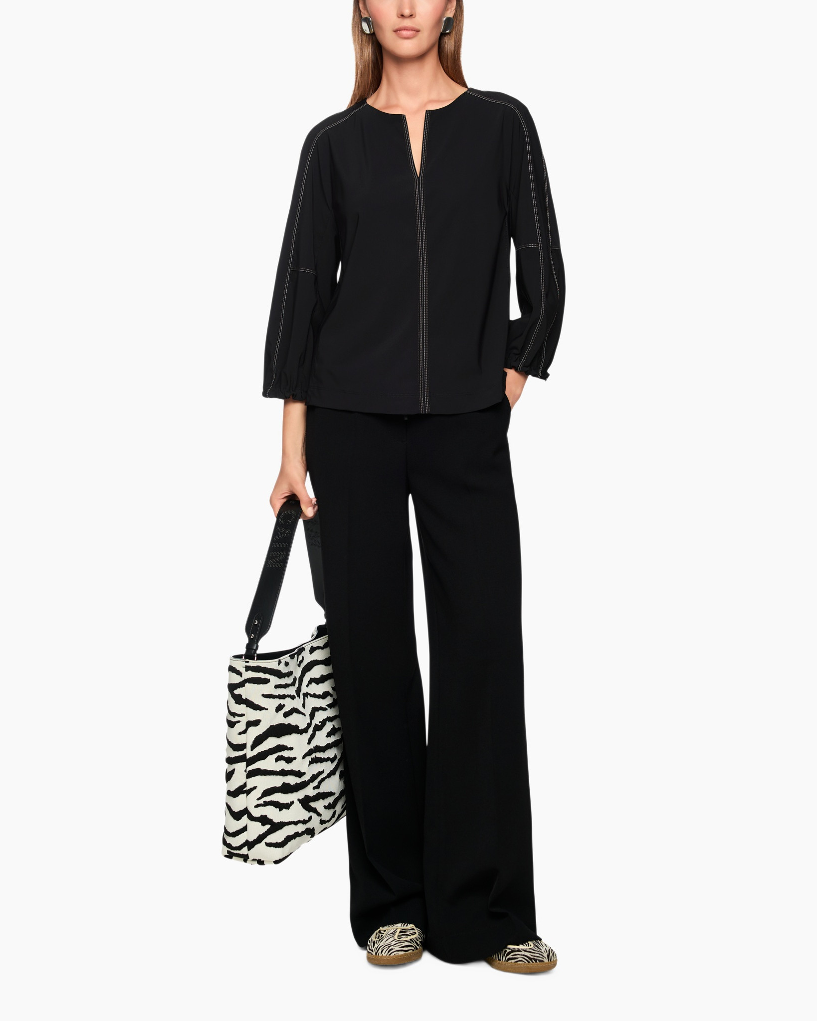 Draag de top op je wijde zwarte pantalon.