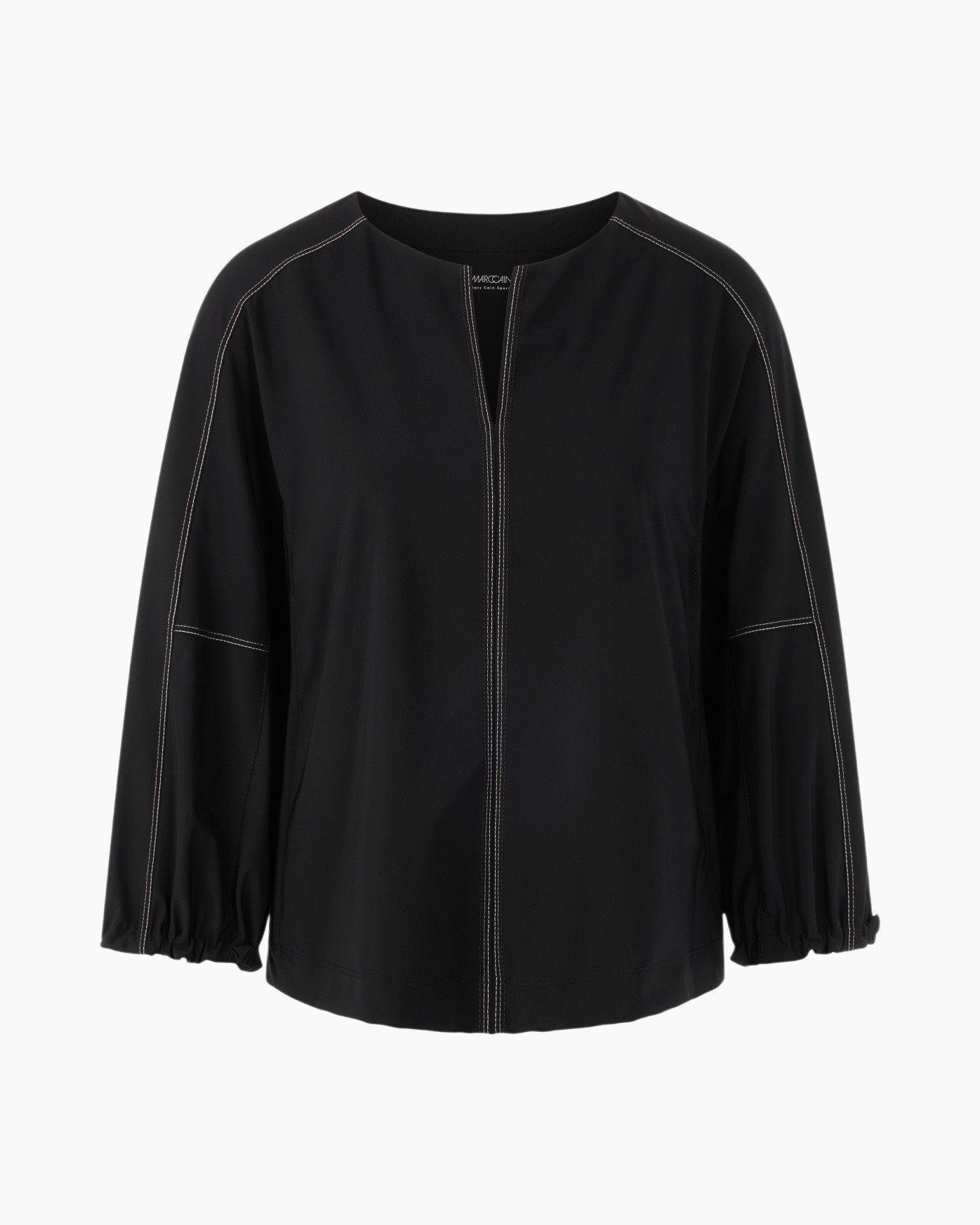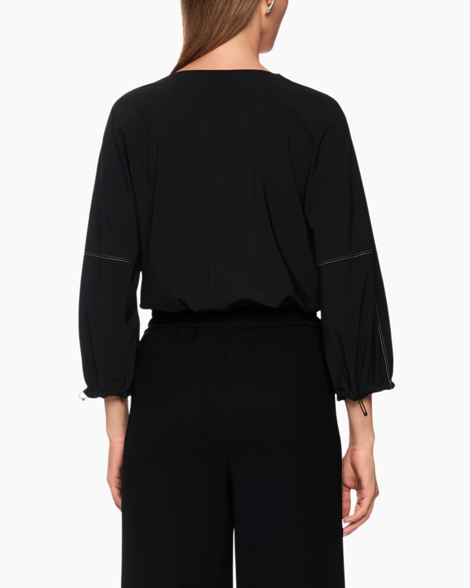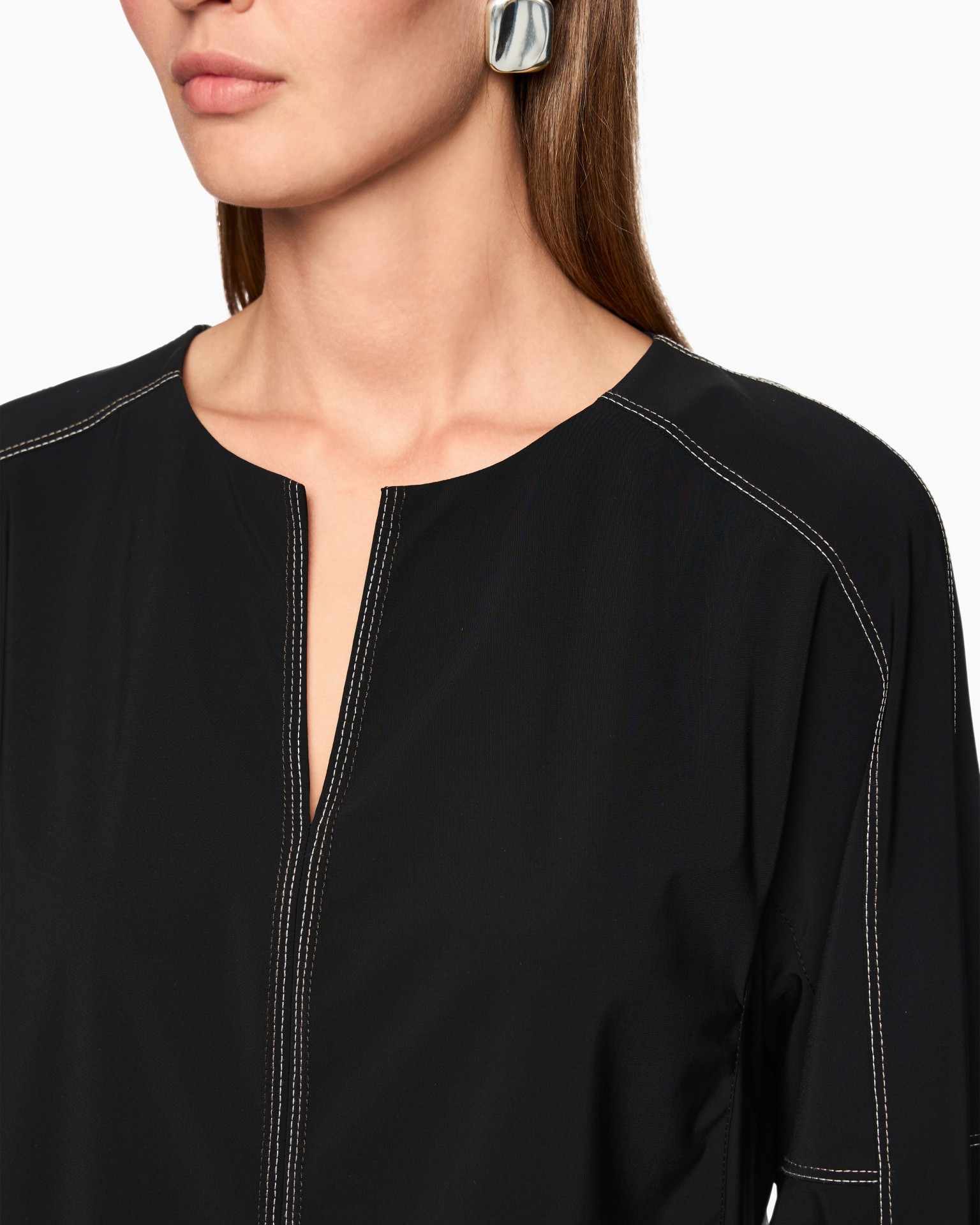Deze zwarte top combineert een actieve dynamiek met verfijnde details. Het soepele materiaal voelt koel aan op de huid. Witte siernaden sieren de voorzijde en mouwpartij voor een grafisch accent. De subtiele split bij de halslijn creëert een open gevoel.