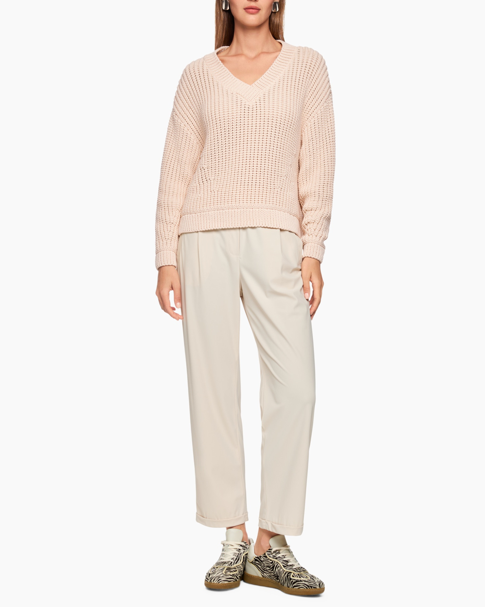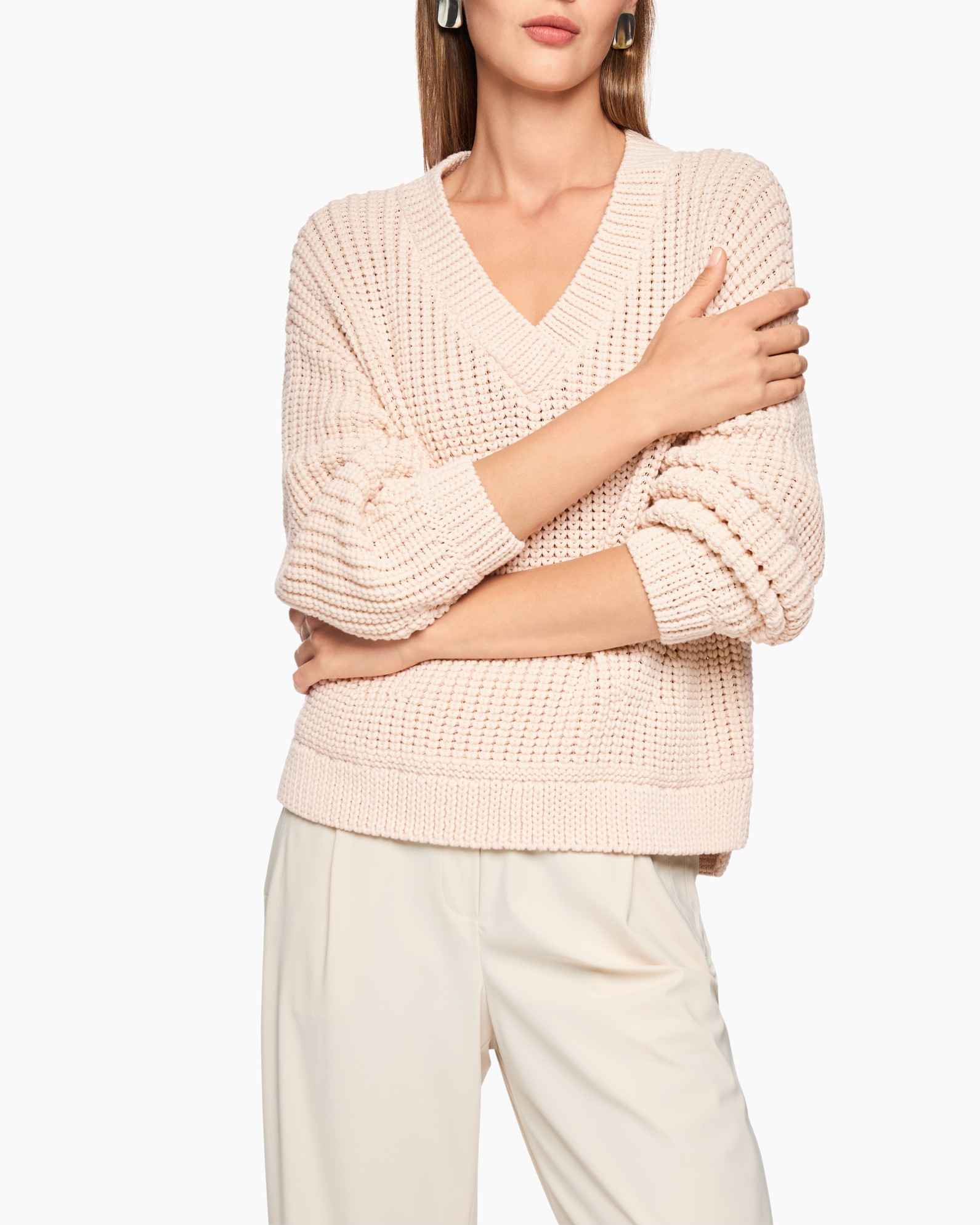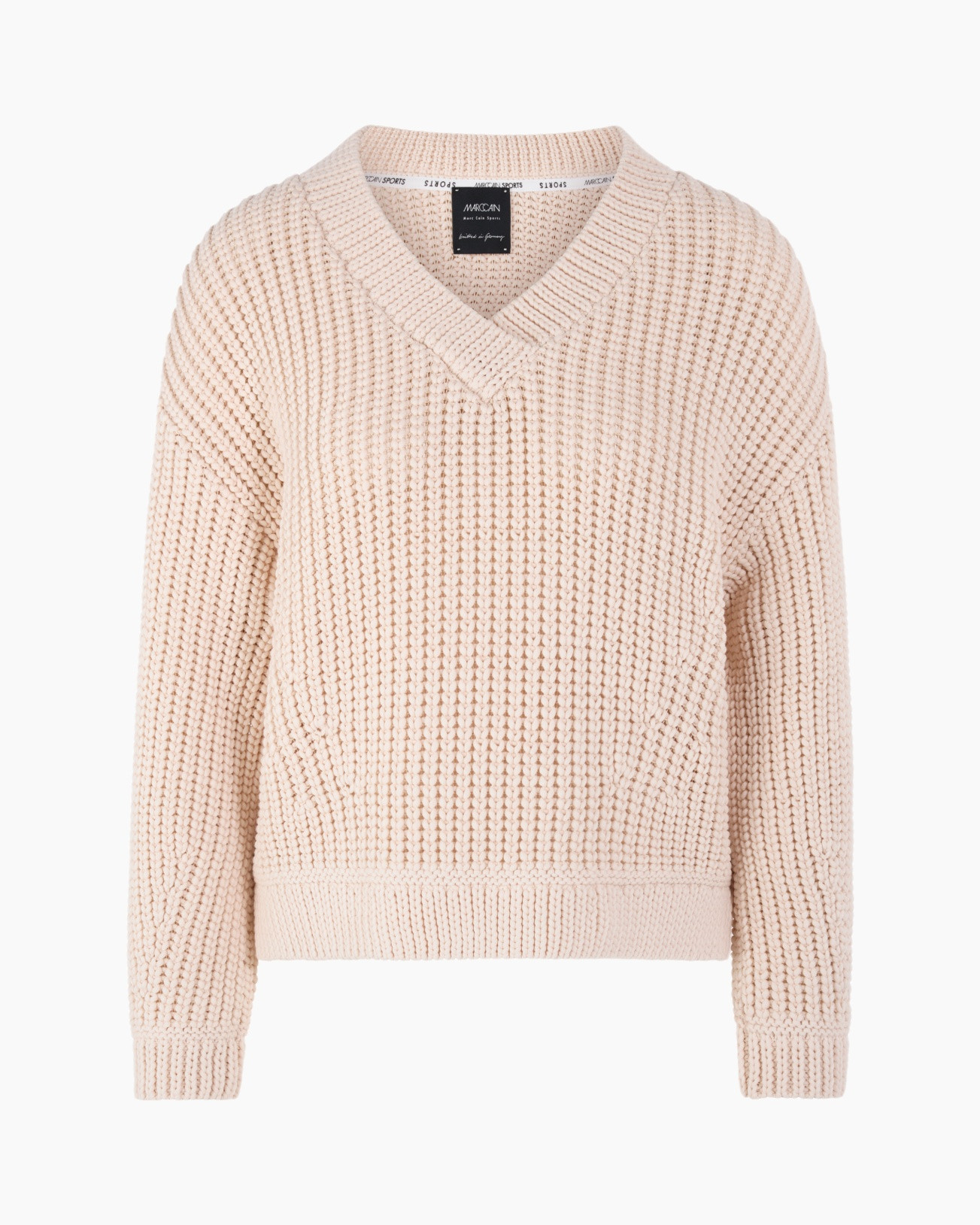 Deze ecru trui heeft een grove breistructuur die textuur geeft aan de outfit. De katoenmix voelt luchtig aan op de huid tijdens zonnige dagen. Door de verlaagde schouderinzet valt de stof soepel om het lichaam. Een v-hals met brede ribboord zorgt voor een open aanblik.
