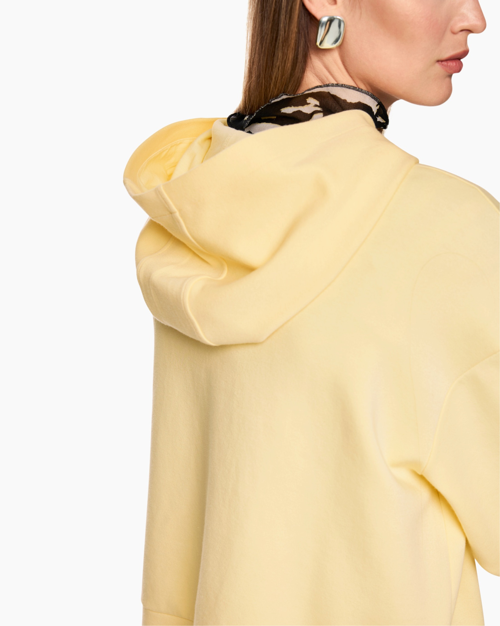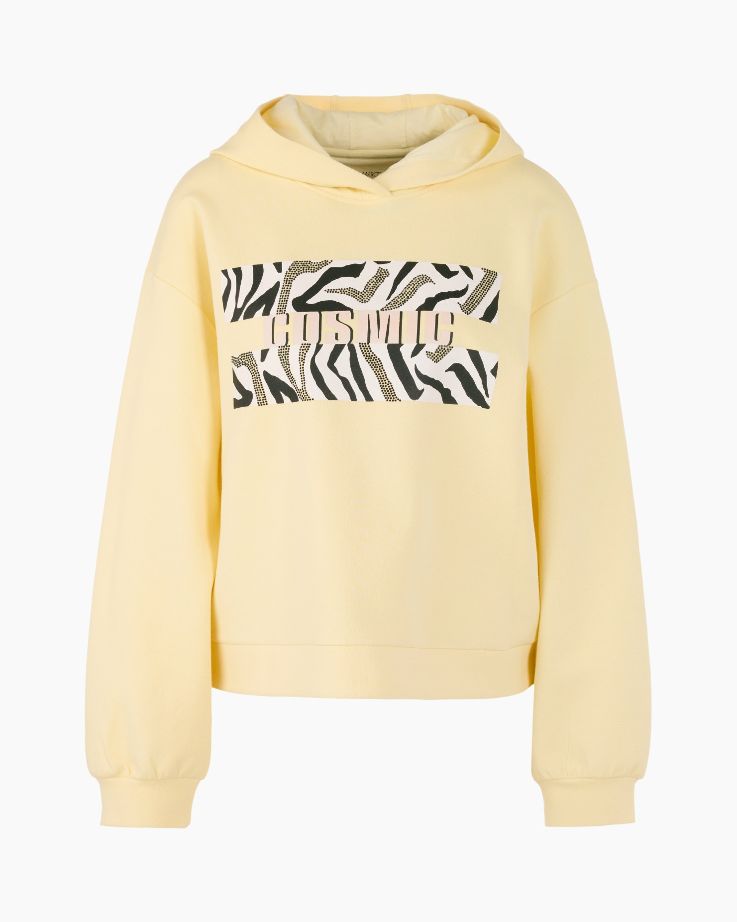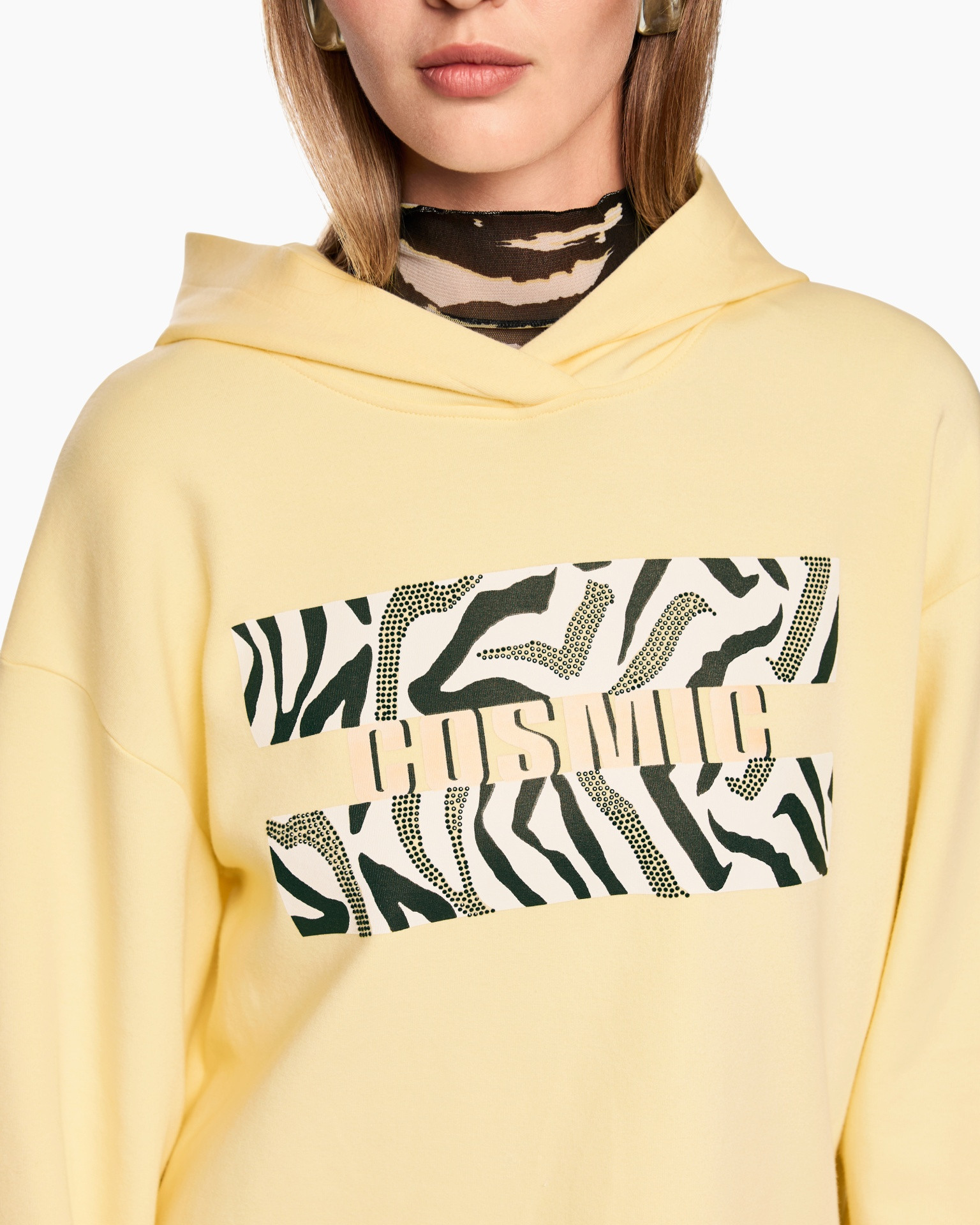 Deze lichtgele hoodie brengt een zonnig gevoel in de garderobe. De zachte sweatstof voelt aangenaam op de huid tijdens koelere momenten. Op de borst prijkt de tekst COSMIC tegen een achtergrond van zebraprint. Dit ontwerp paart een sportieve uitstraling aan moderne grafische details.
