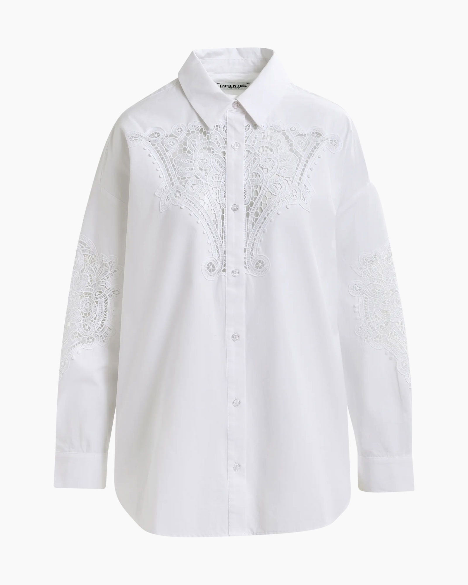 Overhemd van 100% katoen, ontworpen in een oversized pasvorm. Het silhouet is afgewerkt met een puntkraag en blousemouwen met gefronste uiteinden, voor de perfecte mix tussen elegantie en comfort. Het is voorzien van een knoopsluiting vooraan en een lage mouwinzet, en versierd met kanten borduurwerk op de voorkant en schouders voor een vleugje elegantie. De afgeronde zoom, met iets langer achterpand, creëert een flatterende en eigentijdse look, perfect om veelzijdig te stylen.