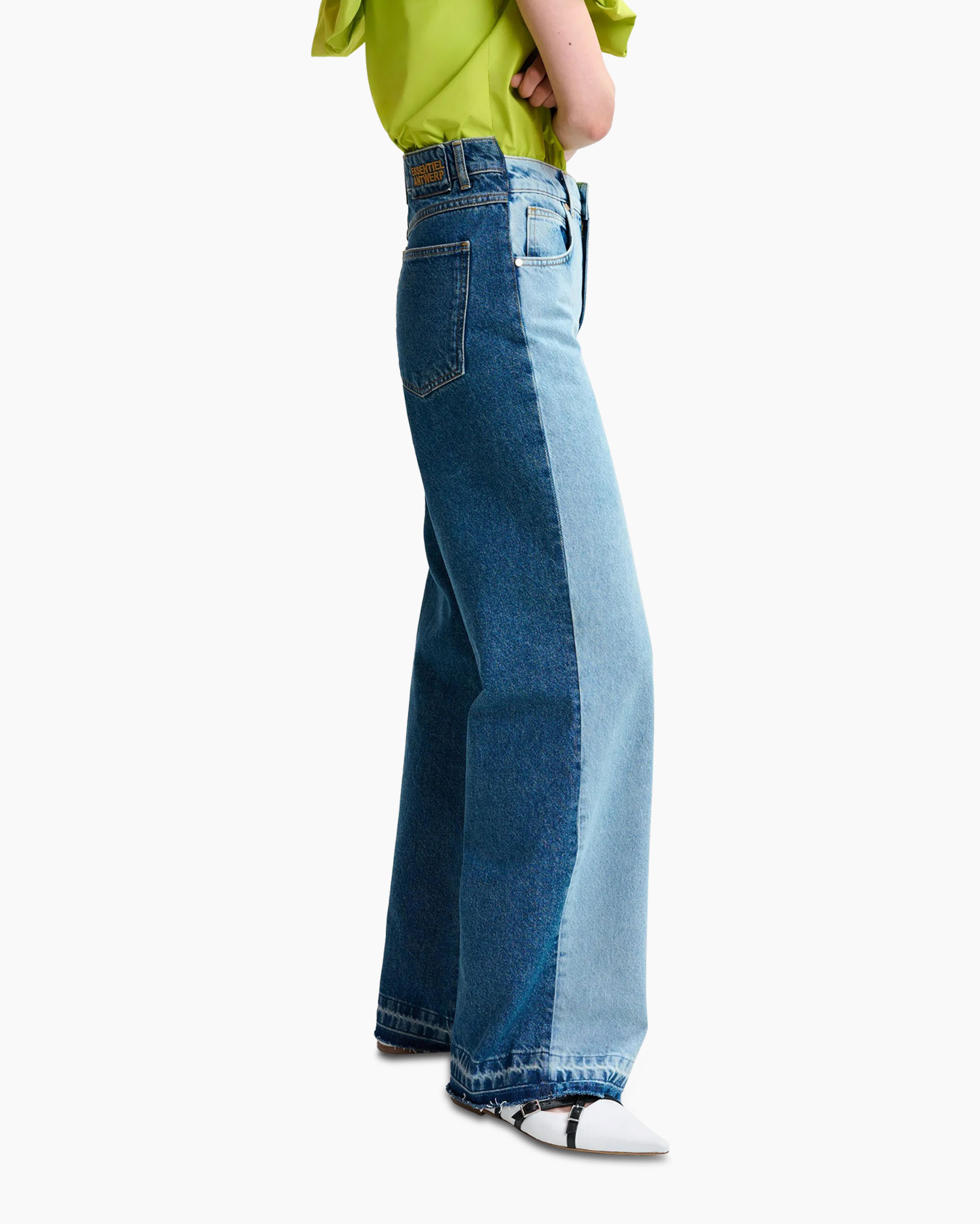 Je ziet de Jeans Hail Aqua van Essentiel Antwerp. Dit is een spijkerbroek die een hoge taille heeft en wijde pijpen. Deze jeans heeft een tweekleurig design dat direct opvalt, met een lichte wassing aan de voorkant en een donkerdere aan de achterkant.