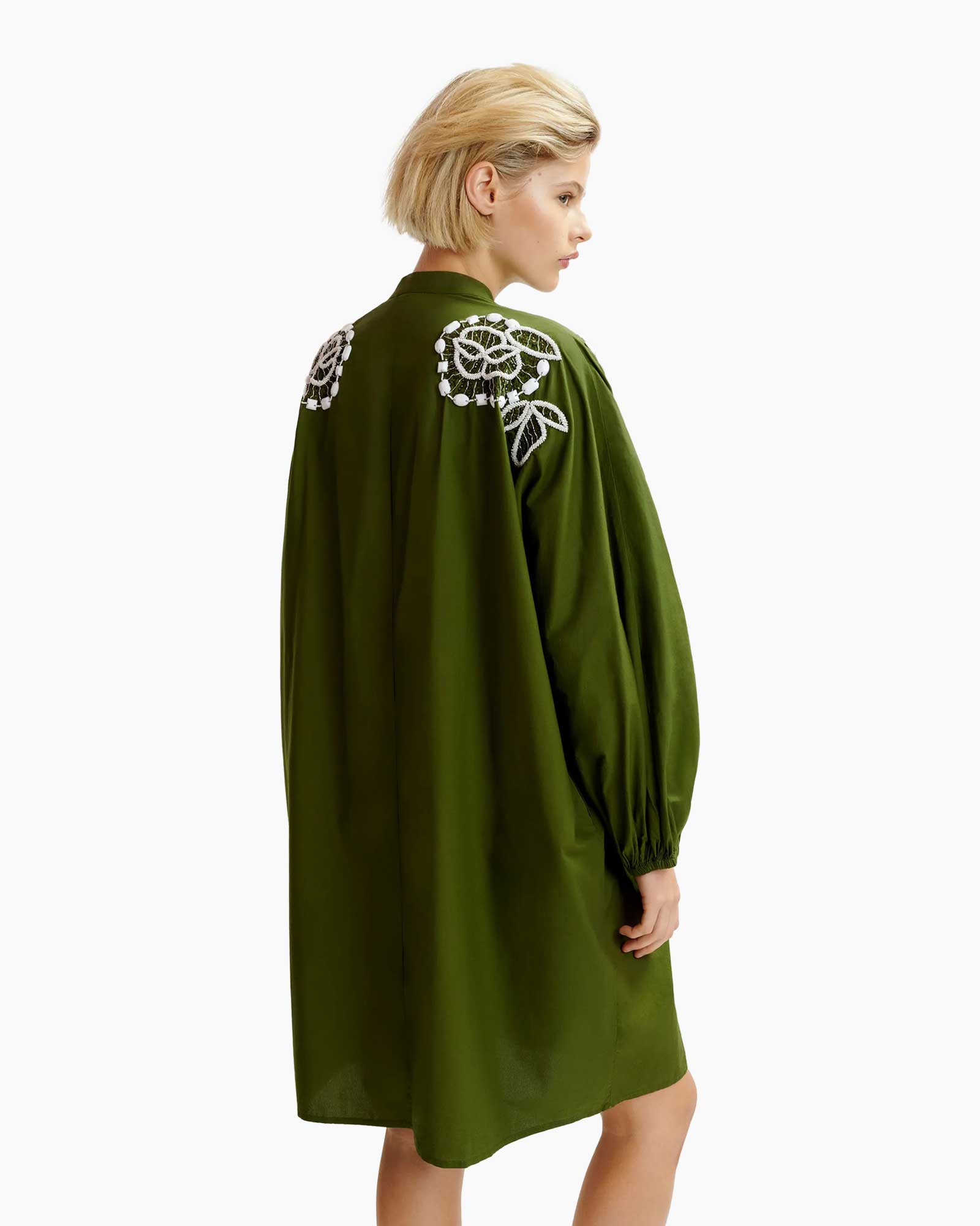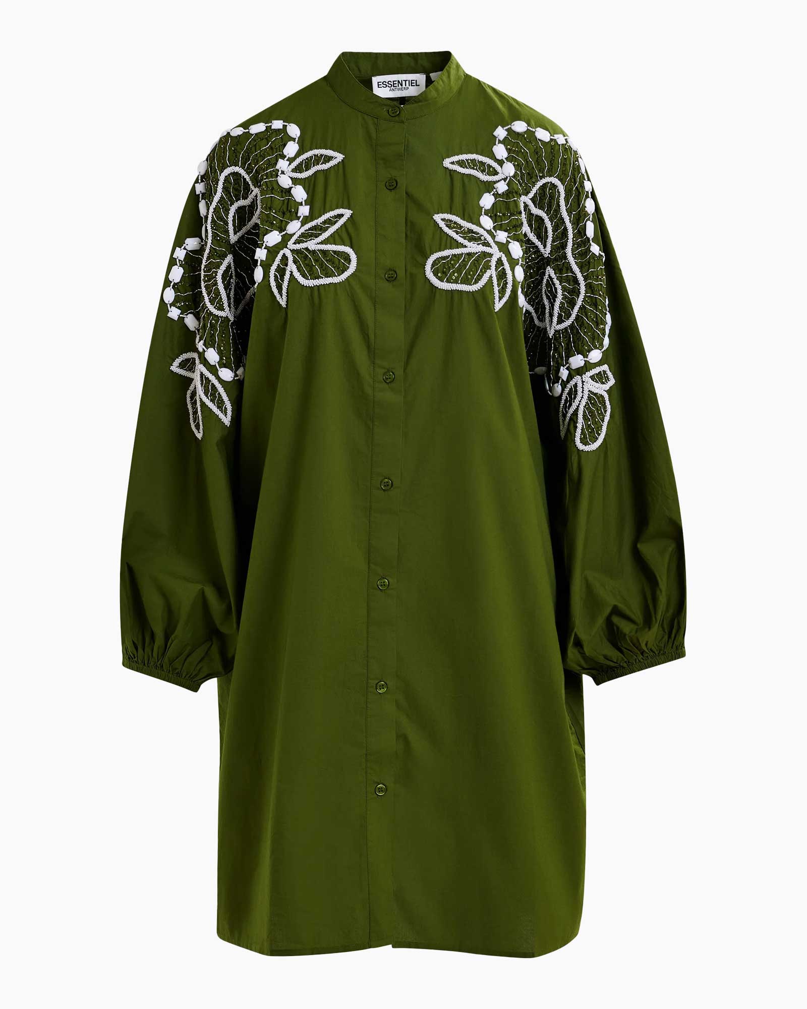 Hemdjurk vervaardigd van katoenen popeline, een geklede maar makkelijke optie voor casual dagen. De comfortabele oversized pasvorm is afgewerkt met een nette maokraag, twee steekzakken en volumineuze mouwen met elastische uiteinden. De delicate bloemversieringen van kralen op de voorkant geven dit veelzijdige kledingstuk een vleugje elegantie.