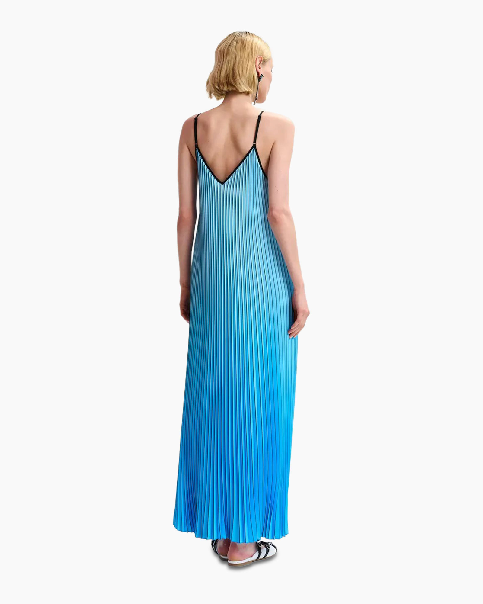 Hier is een kledingstuk dat direct de aandacht grijpt: de Jurk Haurus Aqua van Essentiel Antwerp. Je ziet direct dat deze maxi-jurk is ontworpen om indruk te maken met haar unieke karakter. De jurk valt soepel en lang, en heeft een sierlijke plissé die van boven tot onder doorloopt. Kijk goed naar de kleur, die subtiel overgaat van een helder aquablauw bovenaan naar een dieper, verzadigd oceaanblauw aan de onderkant. Die kleurovergang geeft de jurk een bijzondere diepte. De pasvorm is luchtig en volgt de contouren van je lichaam zonder te knellen. Je hebt een open V-hals, zowel aan de voor- als achterkant, mooi afgewerkt met een contrasterende zwarte bies. De slanke schouderbandjes dragen bij aan de open uitstraling. Dit kledingstuk kiest ervoor om puur te spreken via zijn textuur en opvallende kleurenpalet. Er zijn geen knopen, ritsen of zakken die de lijnen doorbreken, waardoor de focus volledig ligt op de vloeiende beweging en de plissé structuur.