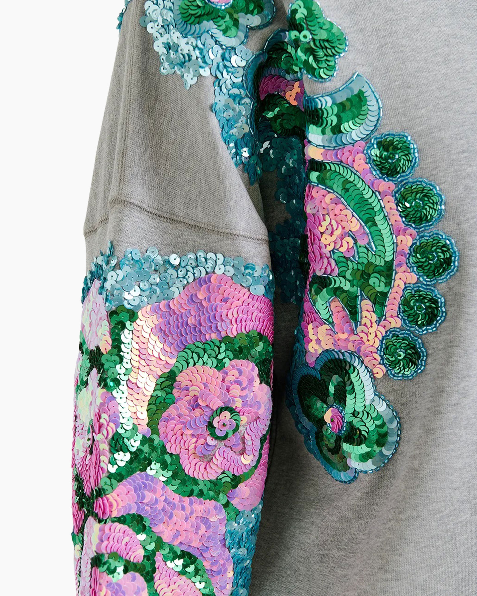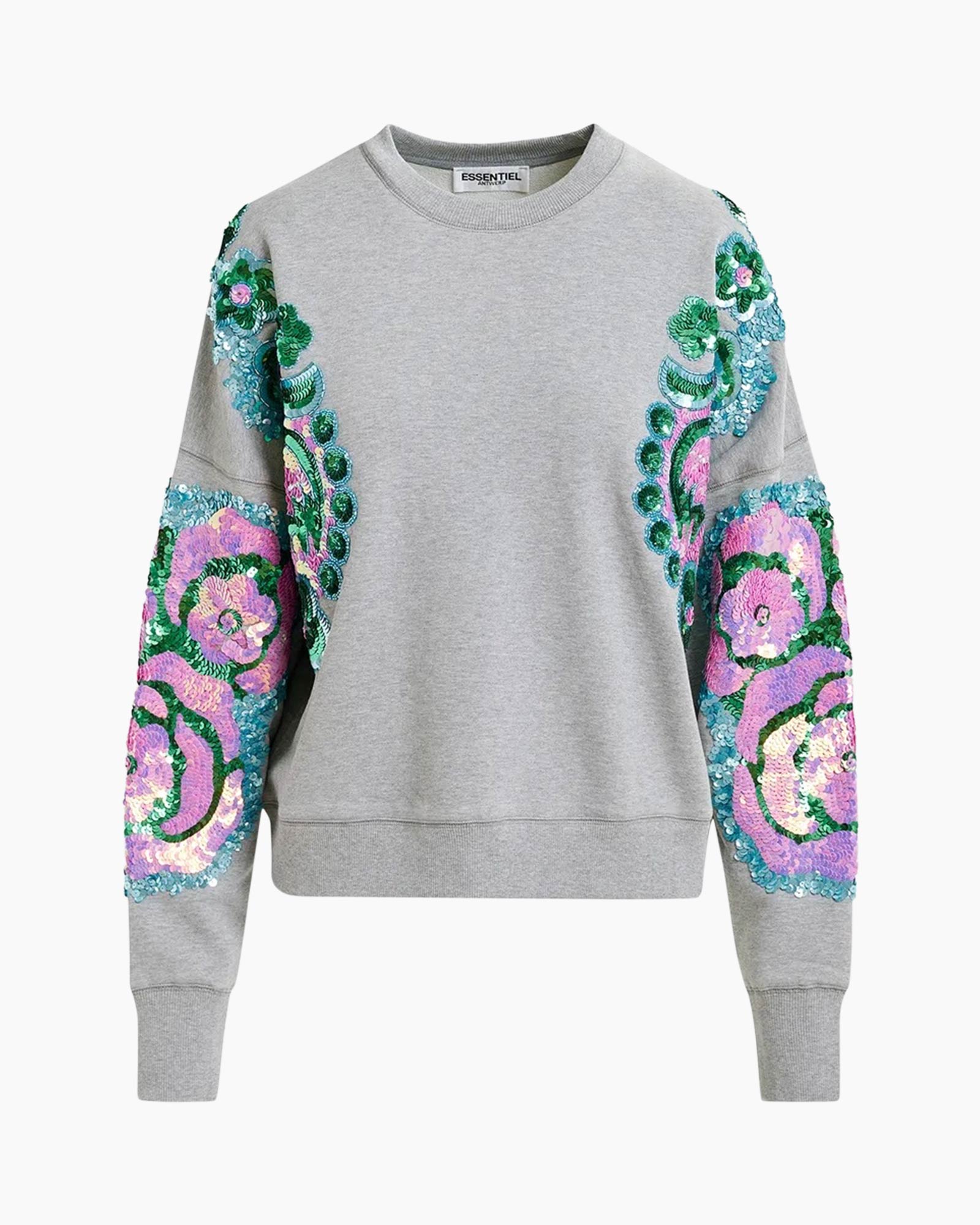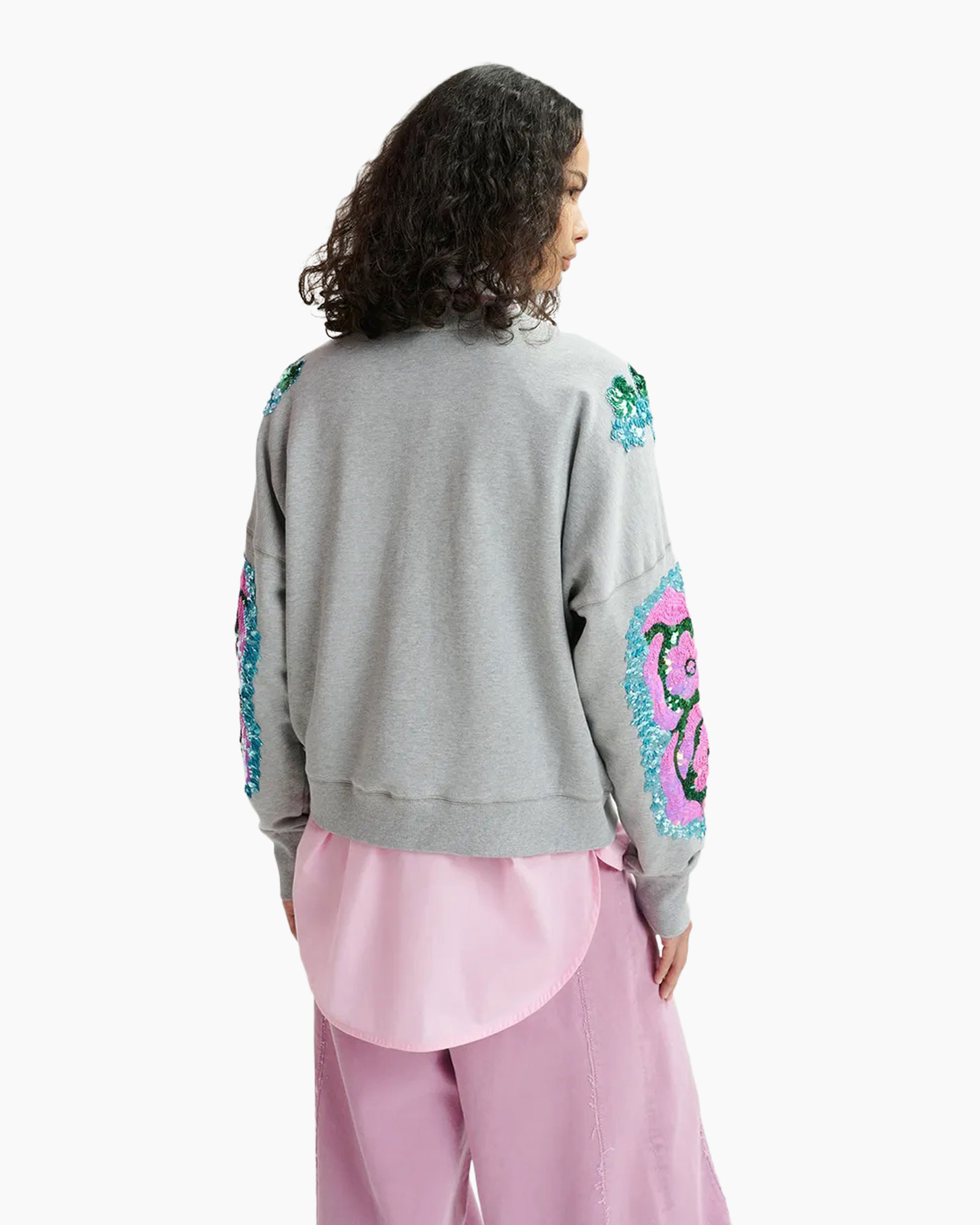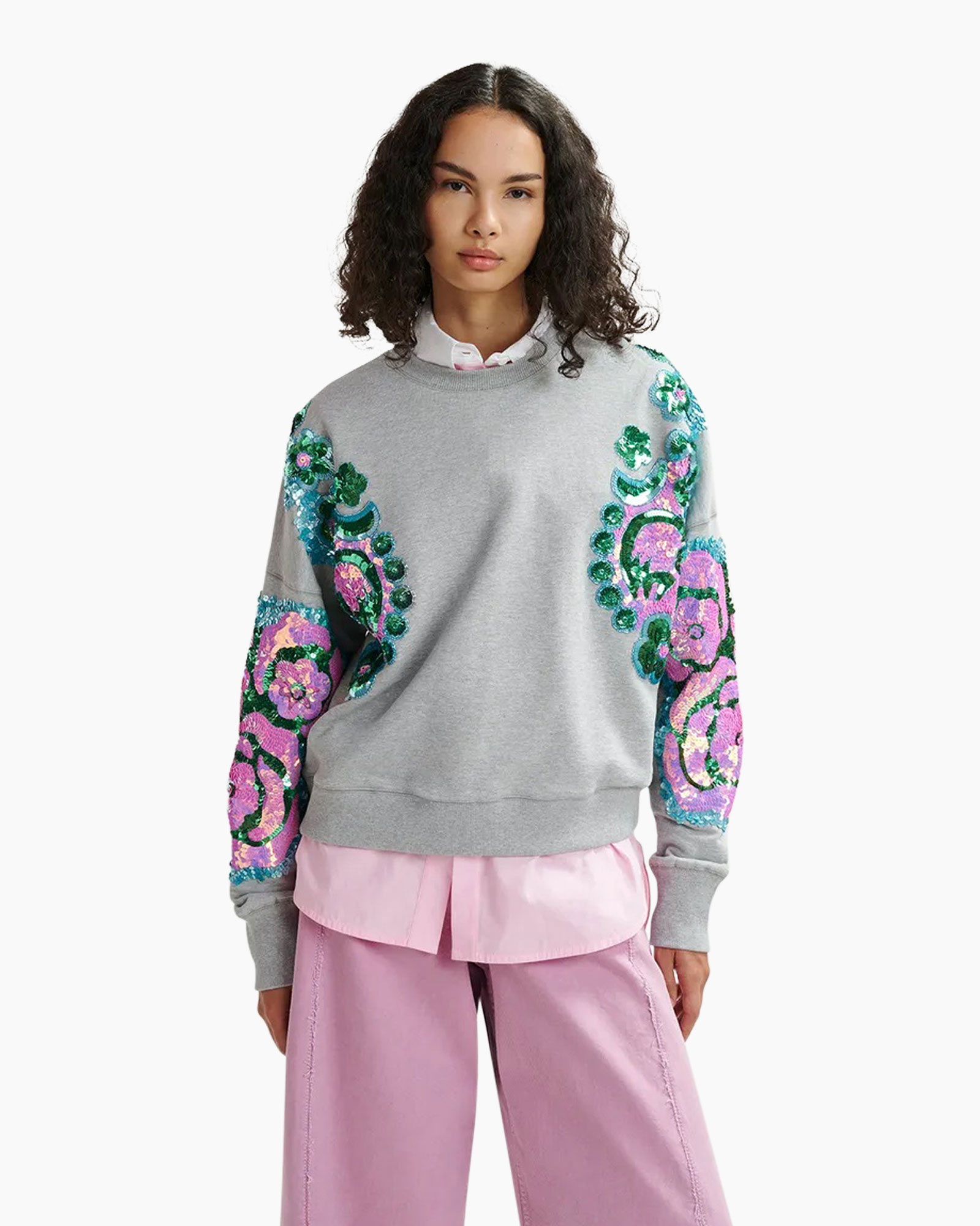 Sweater van zacht biokatoenen jersey ontworpen in een relaxte pasvorm en modern afgewerkt met dubbele stiksels. Met zijn verfijnde bloemenborduursels van pailletten op de mouwen, geeft hij zelfs jouw meest casual dagen een vleugje sprankel.