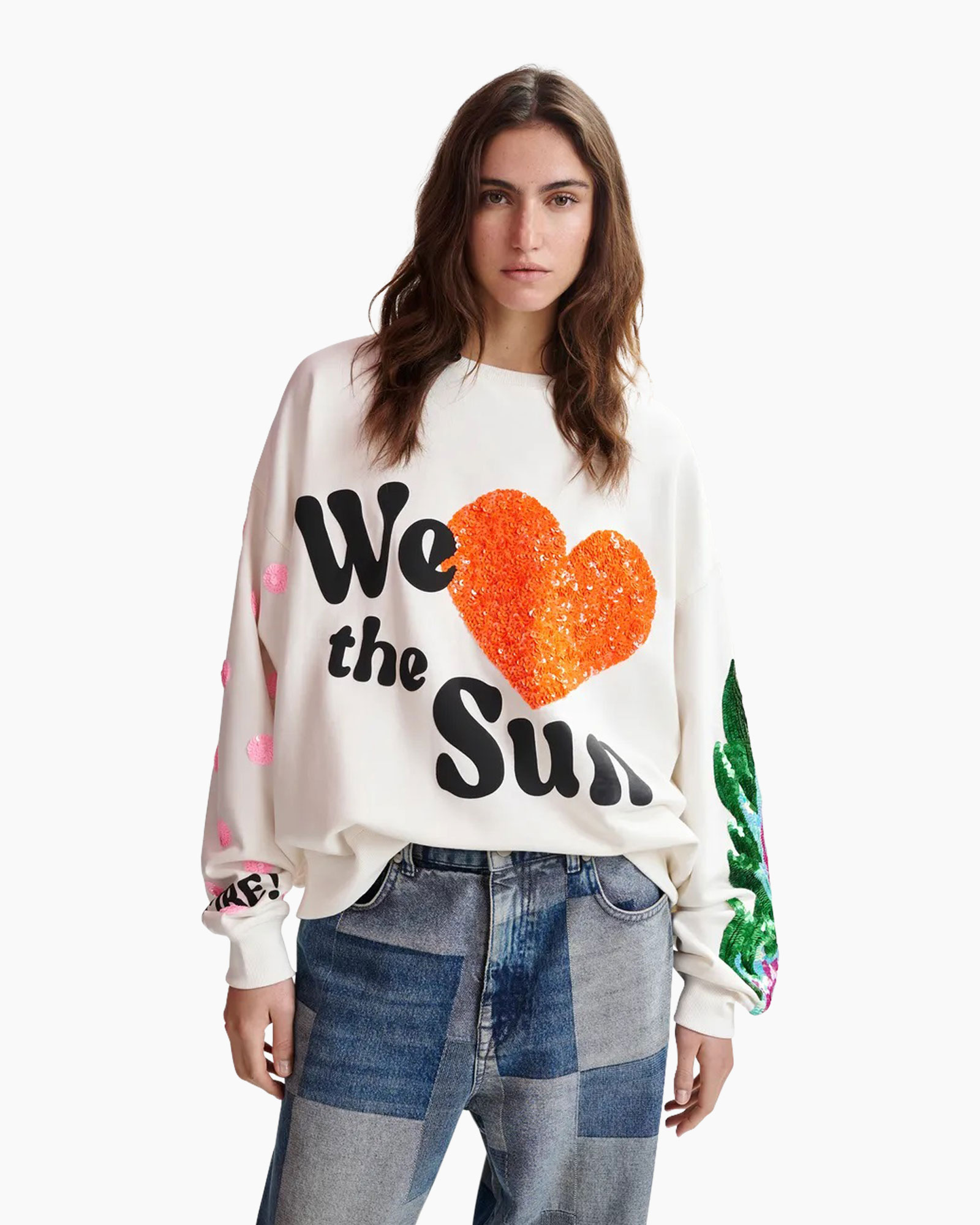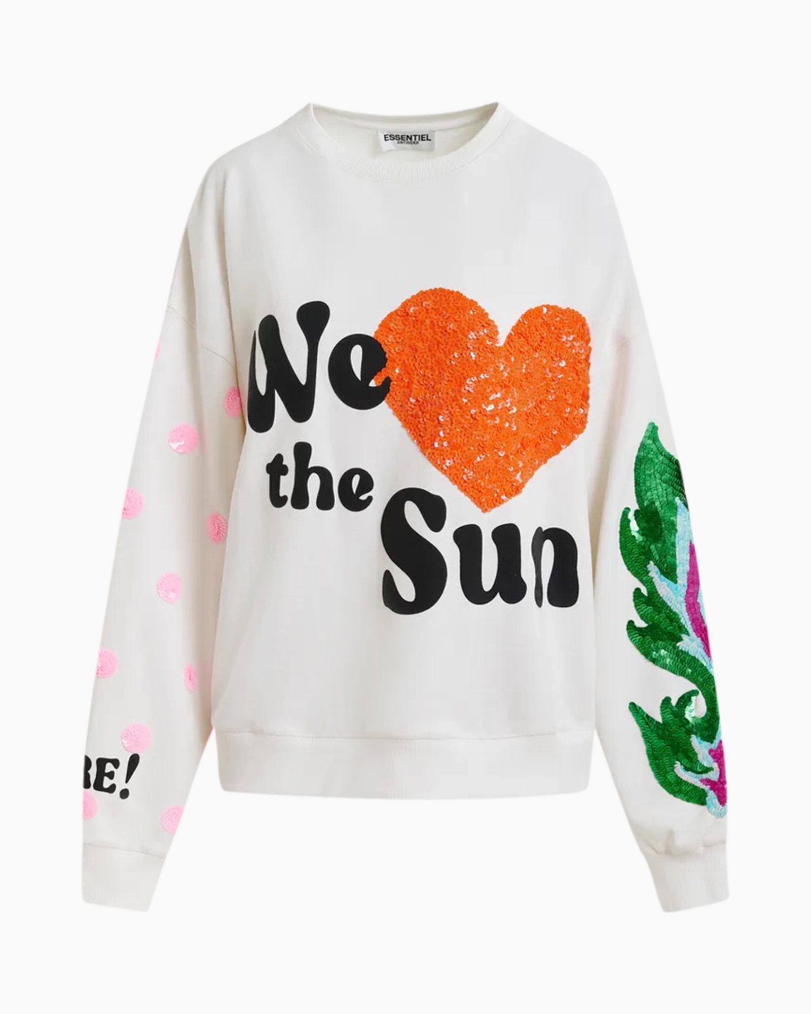 +8 spaarpuntenMet de Trui Ihexperience Off White van Essentiel Antwerp haal je direct een opvallend item. Deze off-white trui biedt je een comfortabele, ruimvallende pasvorm. Je beweegt vrij en voelt je relaxt door de ronde hals en brede boorden. Op de voorkant springt de grote opdruk ‘We the Sun’ in het oog, compleet met een hart van glanzende oranje pailletten. Kijk je naar de mouwen, dan zie je een levendig patroon van groene en roze pailletten op de rechtermouw. De linkermouw heeft speelse roze stippen en een deel van het woord ‘RE!’ bij de manchet. Ook de achterkant verrast je met de opdruk ‘Endless Summer’ en meer van die roze stippen.