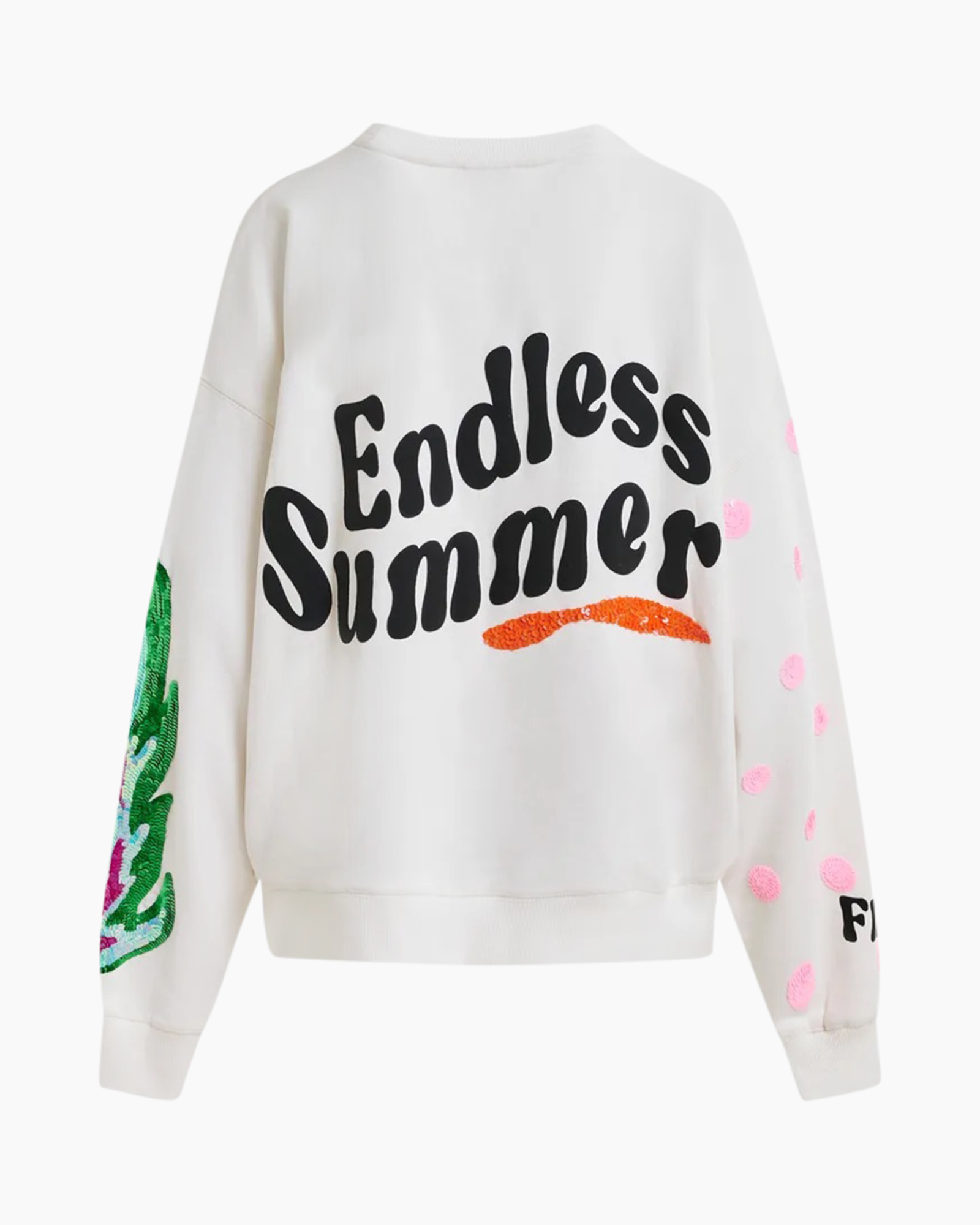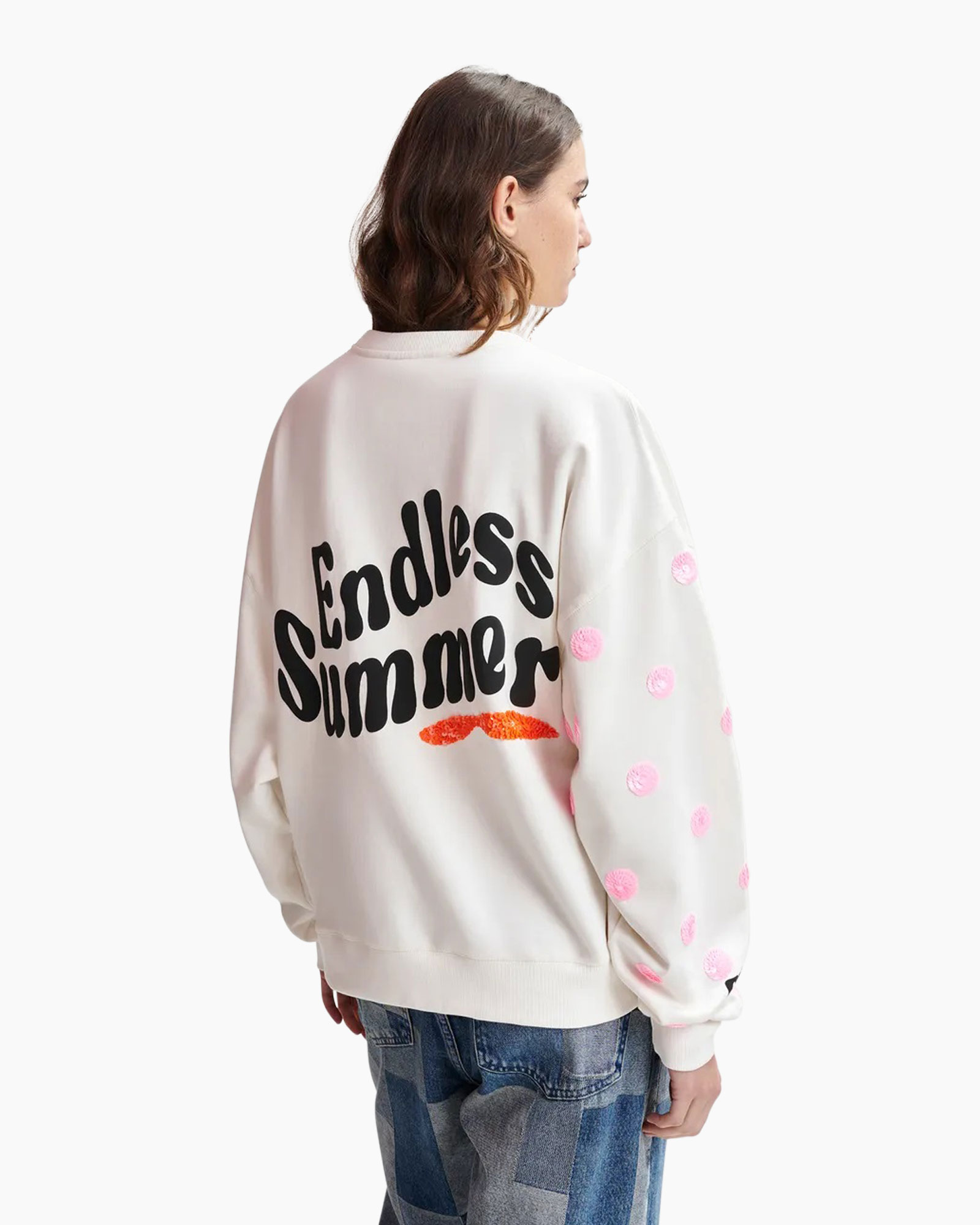- Mouwen met roze stippen en kleurrijke paillettenprint.