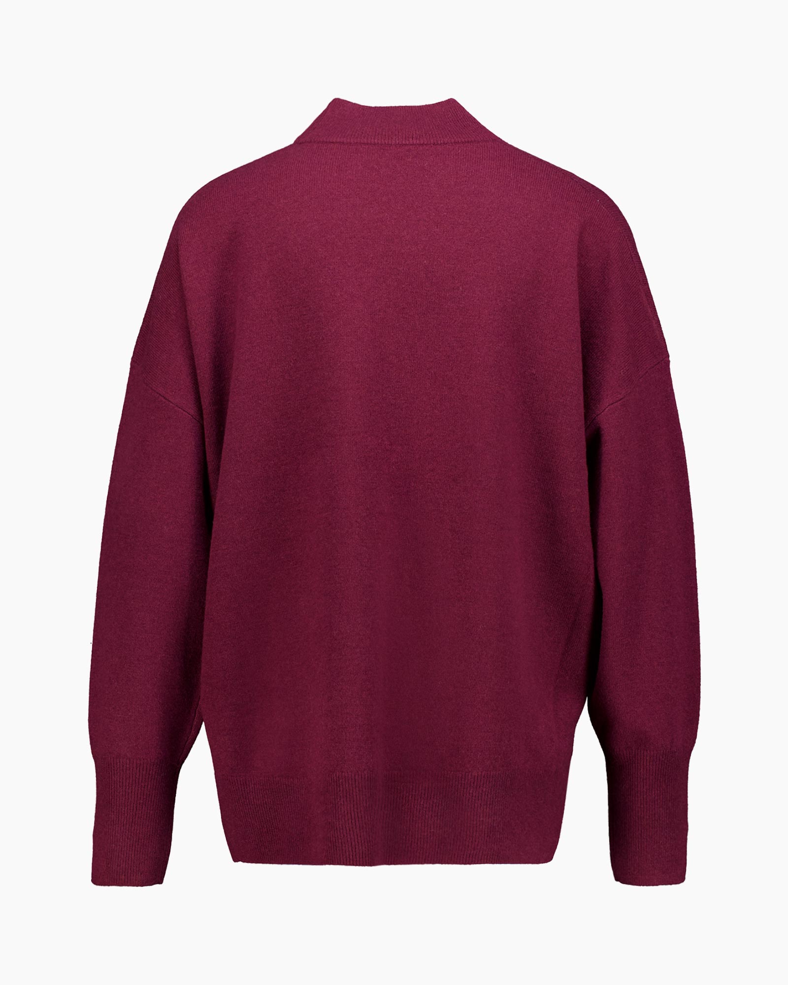 Trui 0/14000 Bruin van Ffc is een zachte, gebreide trui die zorgt voor direct draagcomfort. Dit item heeft een ruimvallende pasvorm met verlaagde schoudernaden, wat een ontspannen uitstraling geeft. Je ziet direct de diepe bordeauxrode kleur en de opstaande kraag die je lekker warm houdt. De trui is afgewerkt met subtiele ribgebreide boorden en een klein split detail in de manchetten.