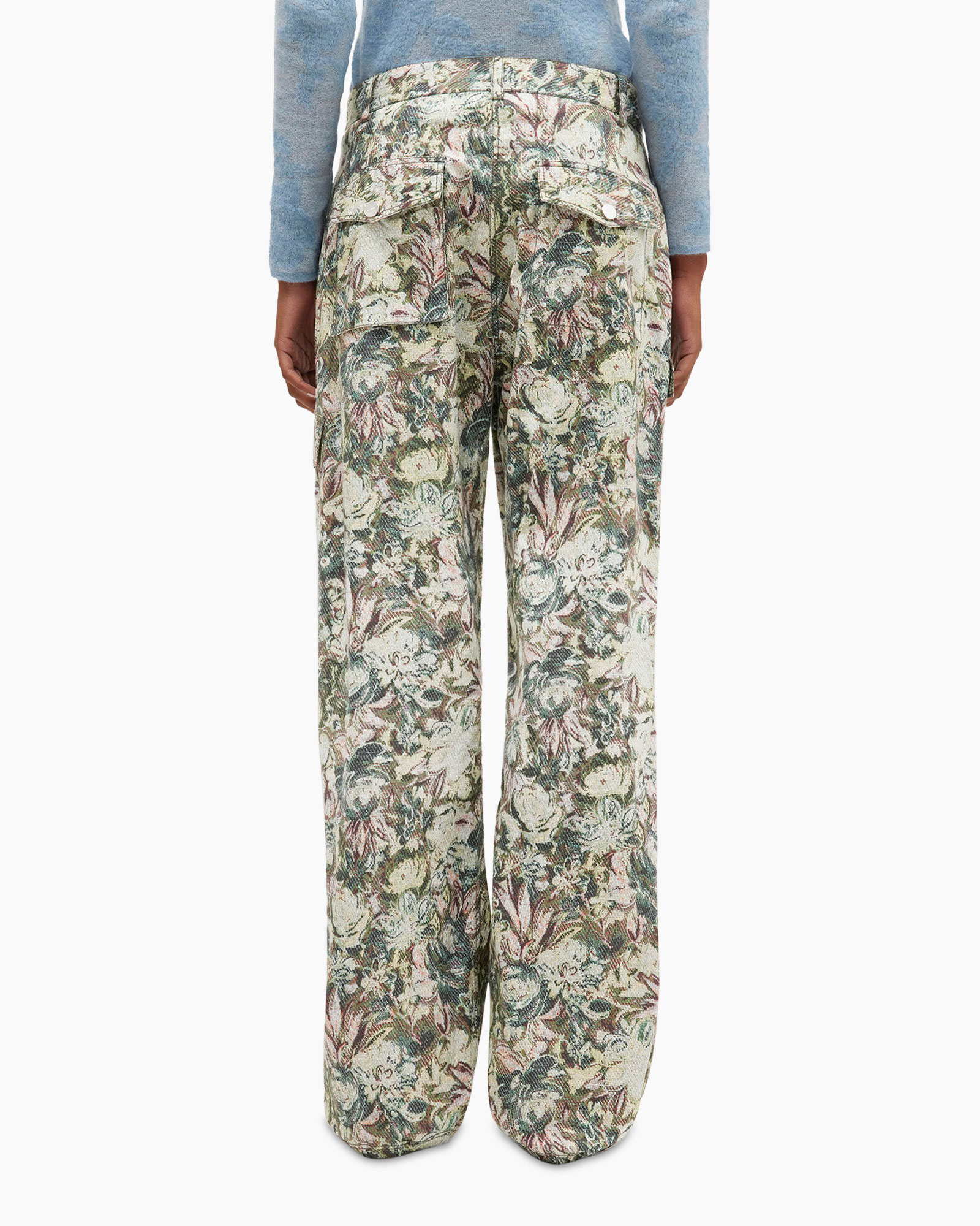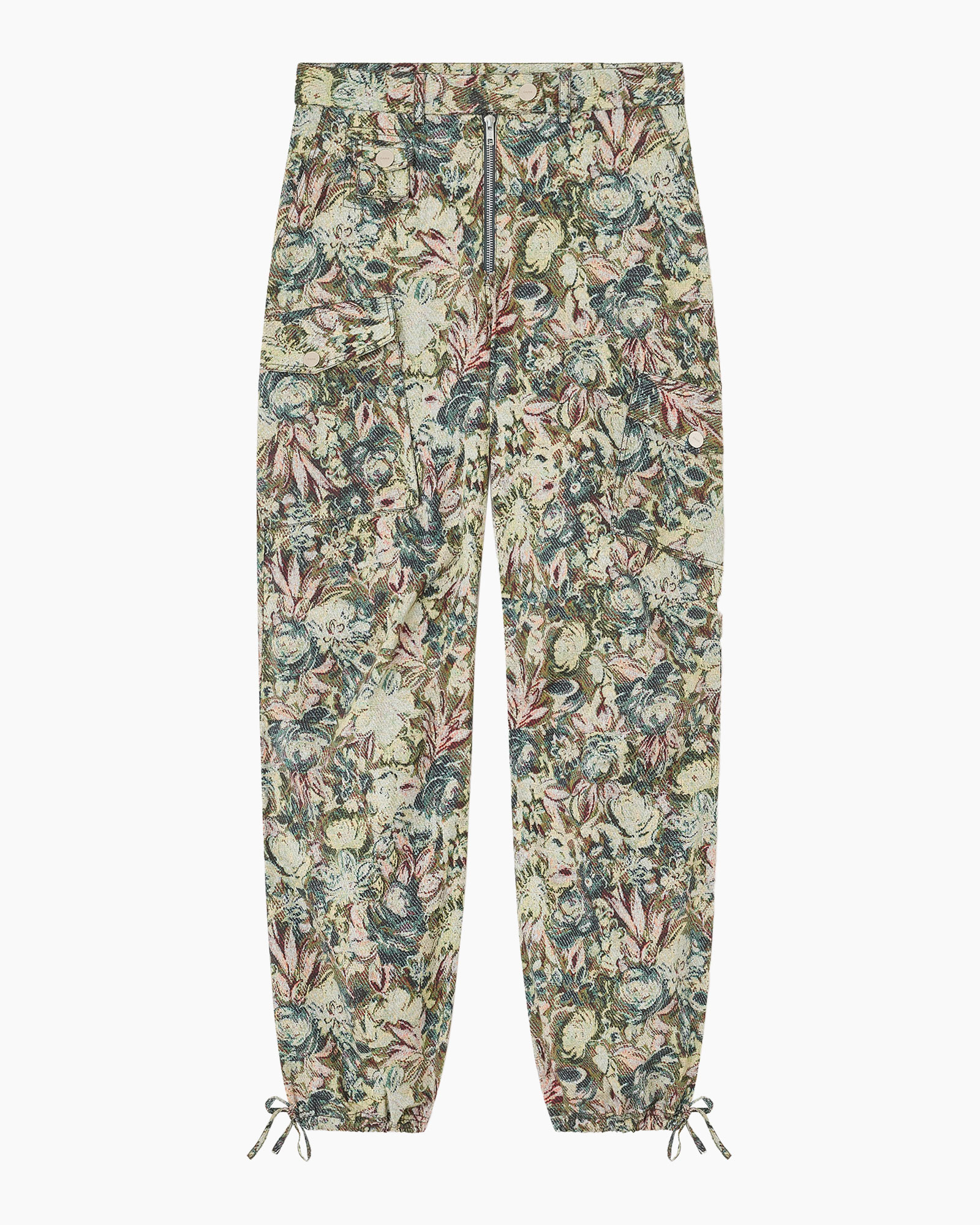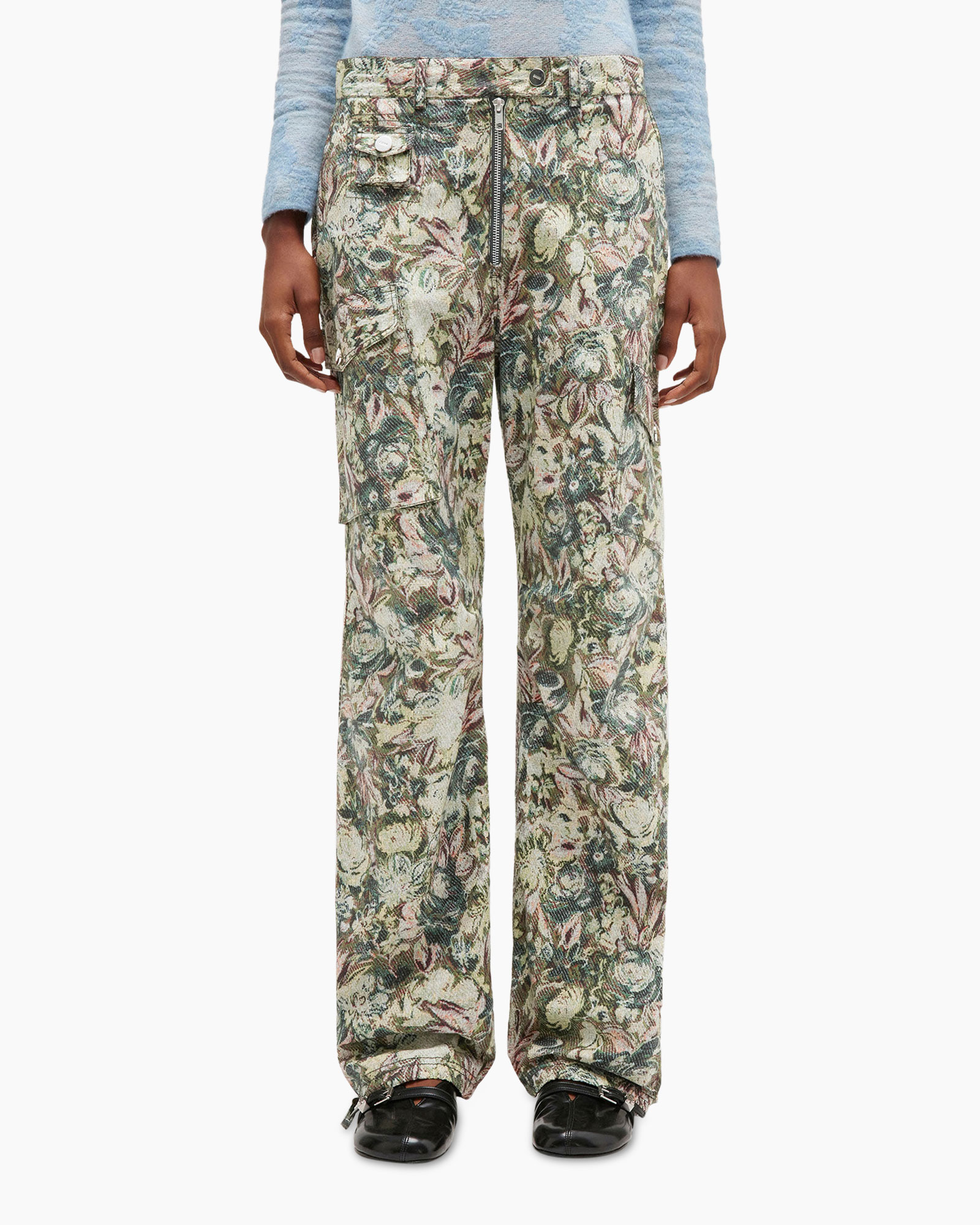 Met de Broek Printed Stretched Cotton Groen van Ganni haal je een veelzijdige broek in huis die je look direct een opvallende draai geeft. Je ziet direct de relaxte, rechte pasvorm die comfortabel valt langs je benen. De broek pronkt met een rijk, bloemig patroon in tinten groen, crème en zachtroze, wat zorgt voor een levendige uitstraling. De duidelijk zichtbare rits aan de voorkant is een direct detail, aangevuld met handige klepzakken op de tailleband, elk met een zilveren knoop. Aan de zijkant vind je een extra cargozak. Achterop zie je twee opgestikte zakken, ook voorzien van een knoopsluiting.