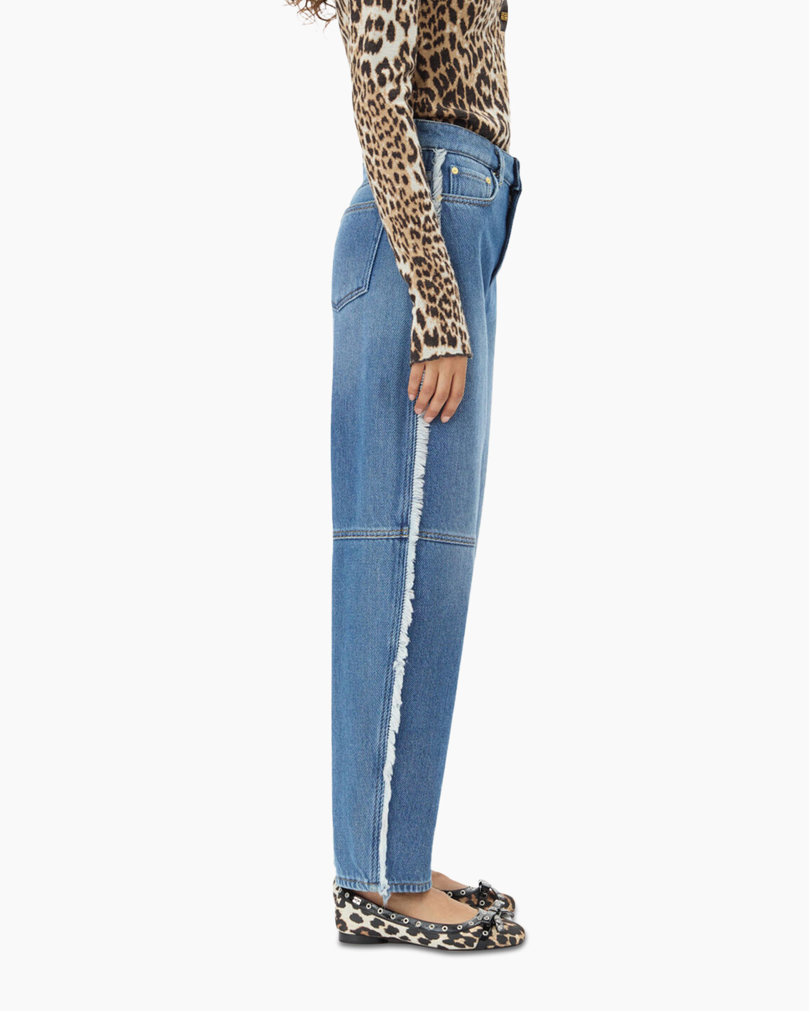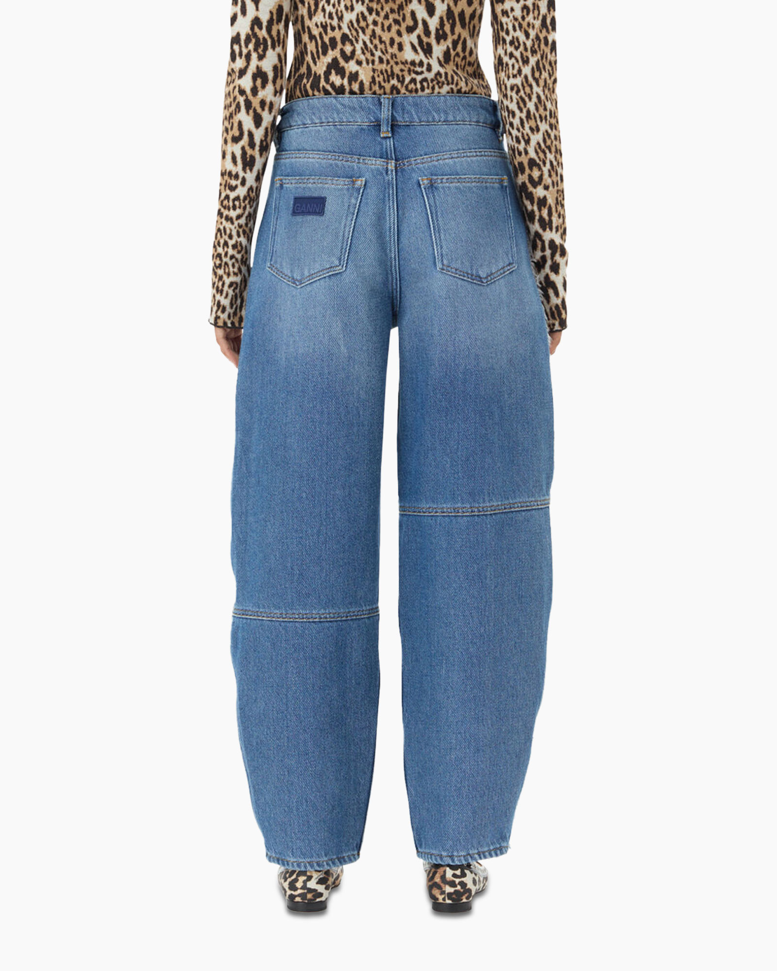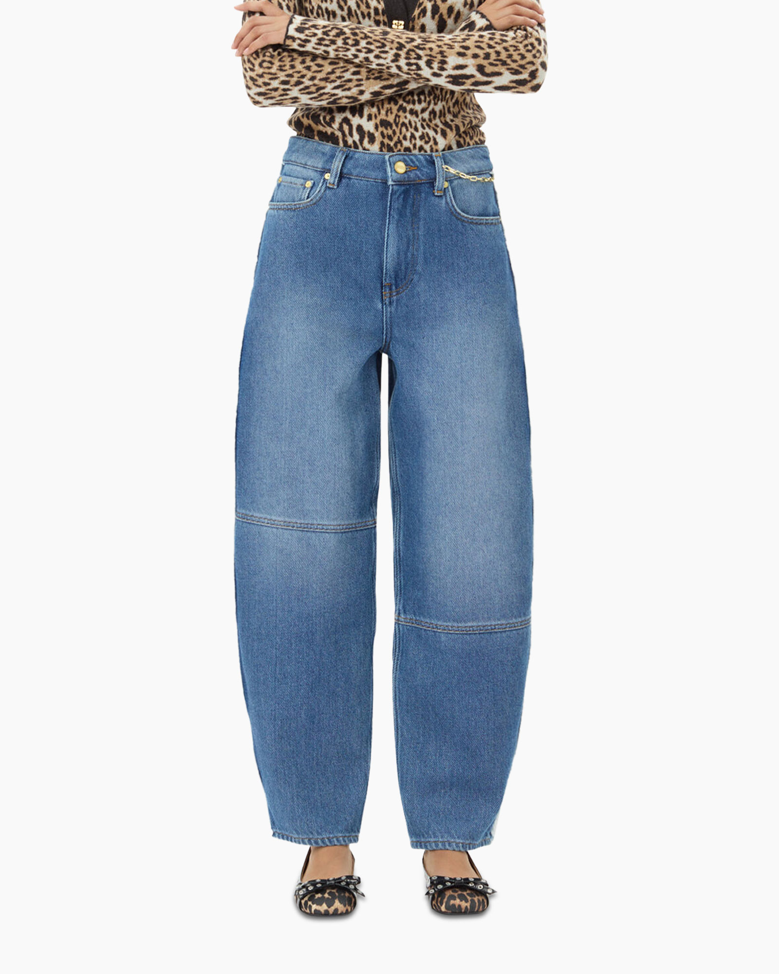 Jeans Heavy Denim Stary midden blauw van Ganni geven jouw outfit direct een krachtige uitstraling. Deze wijde jeans valt hoog in de taille en heeft een ontspannen pasvorm die ruim zit rond de heupen en benen. Je ziet een klassieke middenblauwe wassing met lichte vervaging op de bovenbenen en knieën, wat de broek een gedragen karakter geeft. De broek sluit met een goudkleurige knoop en rits. Aan de voorkant vind je twee steekzakken en een kleine extra zak, aangevuld met twee ruime zakken aan de achterzijde. Opvallende horizontale stiknaden op de knieën voegen een uniek detail toe. Een kleine ketting siert subtiel een van de riemlussen aan de voorkant. De pasvorm loopt comfortabel en breed, tot aan de enkels.
