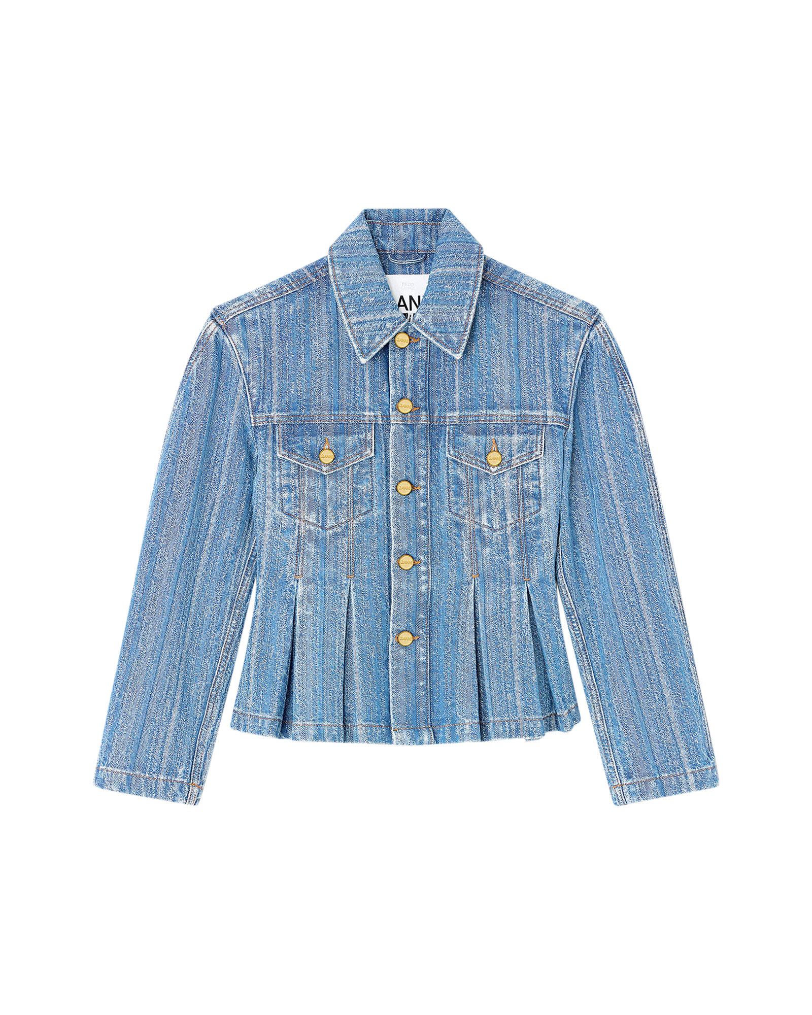 Geef je outfit direct karakter met de Spijkerjas Structured Denim Fitted Blauw van Ganni. Deze spijkerjas heeft een getailleerde pasvorm die strak aansluit op je bovenlichaam. Onder de taille vallen de plooien op, die de jas een verfijnd peplum-effect geven. De denimstof heeft een lichtblauwe wassing met een subtiele verticale streep. Je ziet goudkleurige knopen aan de voorkant en op de twee borstzakken met klep. De klassieke kraag en brede mouwen met bijpassende knopen ronden het ontwerp af.
