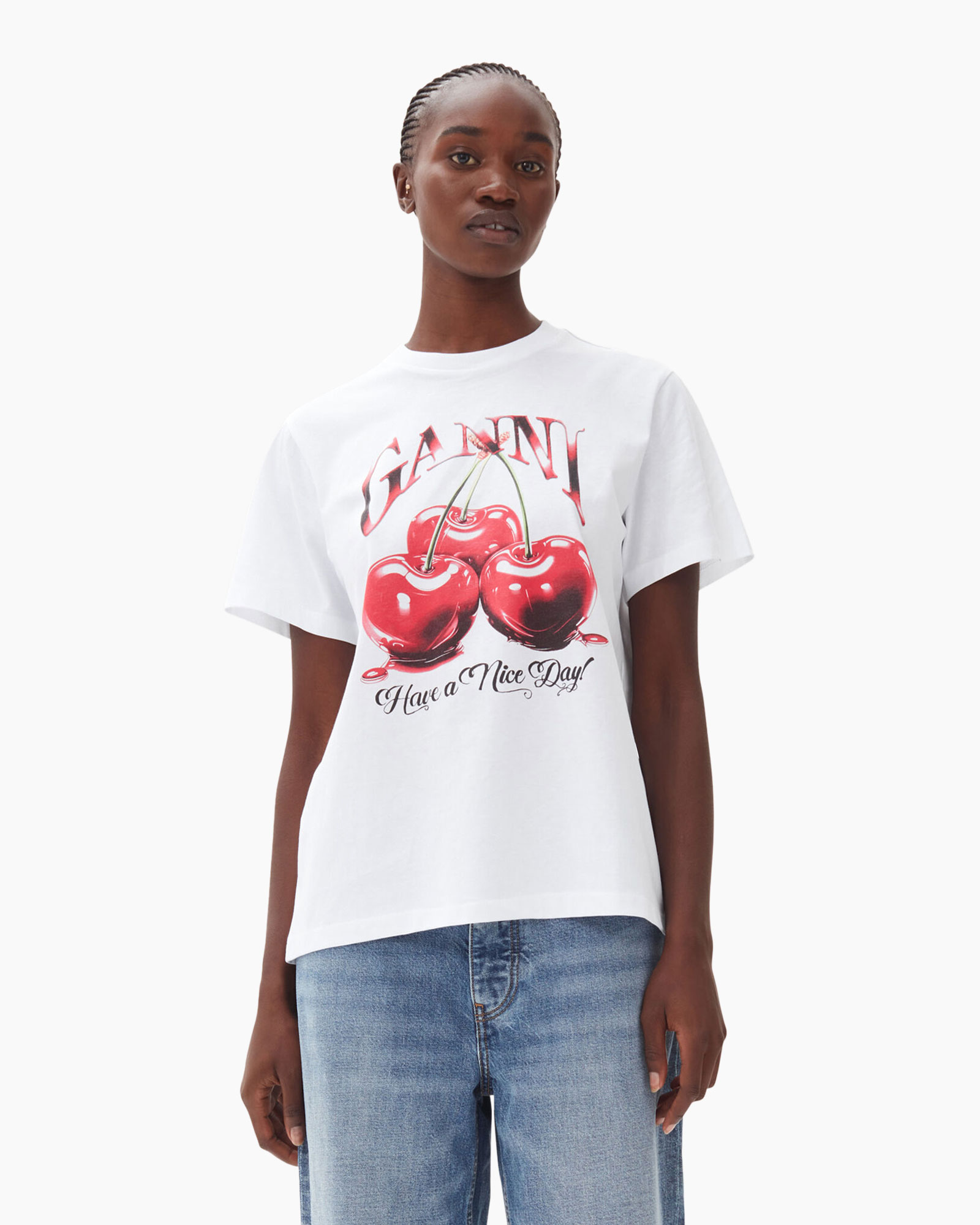 Bekijk eens het T-shirt Korte Mouw Basic Jersey Cherry Relaxed Wit van Ganni, een comfortabel T-shirt dat je direct een vrolijk gevoel geeft. Dit T-shirt heeft een heerlijk zachte jersey stof en een ruime, relaxte pasvorm. Deze pasvorm biedt je volop comfort en bewegingsvrijheid voor al je bezigheden. De helderwitte kleur zorgt voor een frisse basis in elke outfit. Je ziet een klassieke ronde hals en korte mouwen, ideaal voor warmere dagen. De voorkant van het T-shirt trekt de aandacht met een levendige en gedetailleerde print. Drie glanzende rode kersen vormen het middelpunt, met daarboven de merknaam GANNI die je in een opvallend rood-zwart ruitpatroon ziet. Onder de kersen staat de uitnodigende tekst ‘Have a Nice Day!’. Dit is een veelzijdig T-shirt dat je makkelijk combineert en een persoonlijke touch aan je kledingkast toevoegt.
