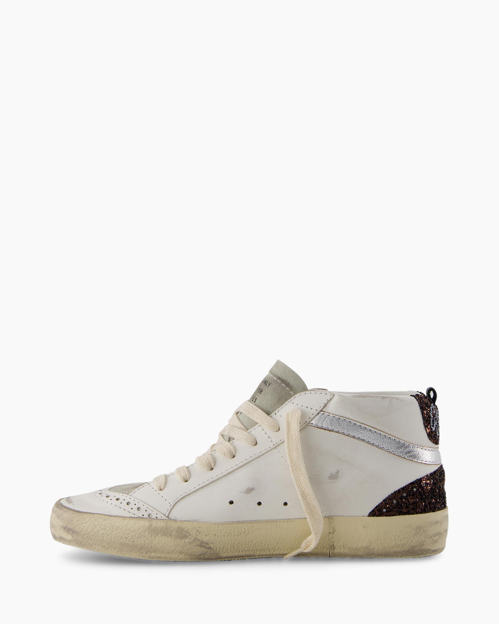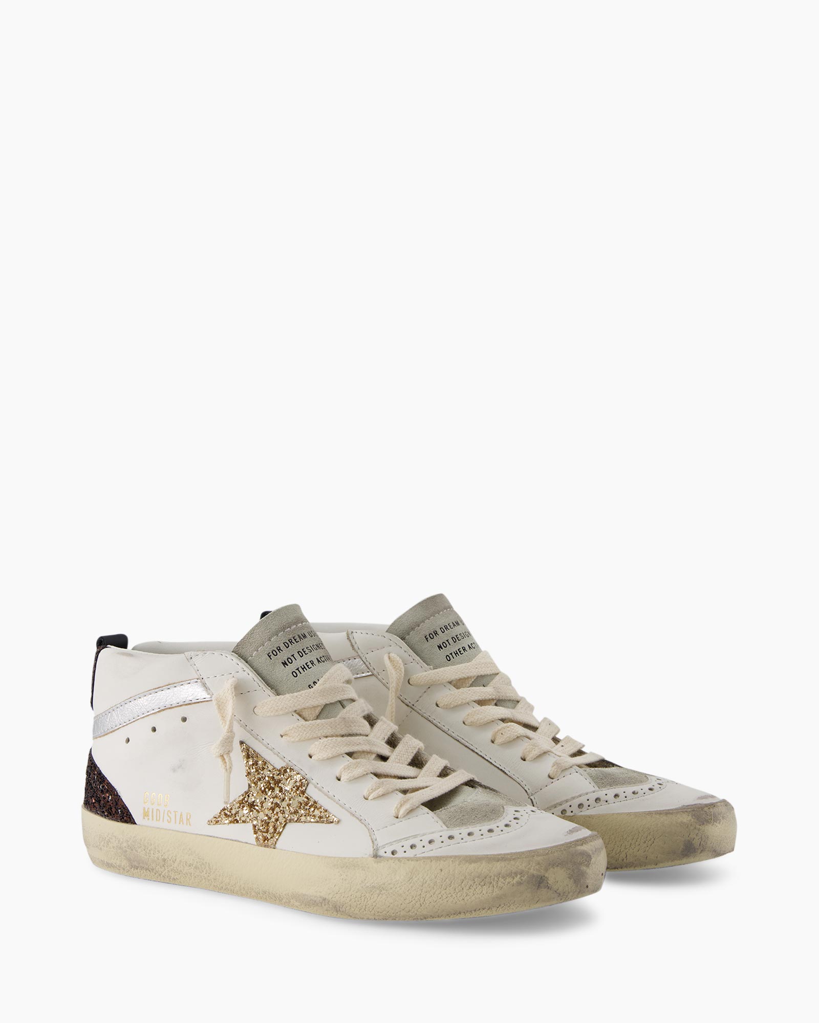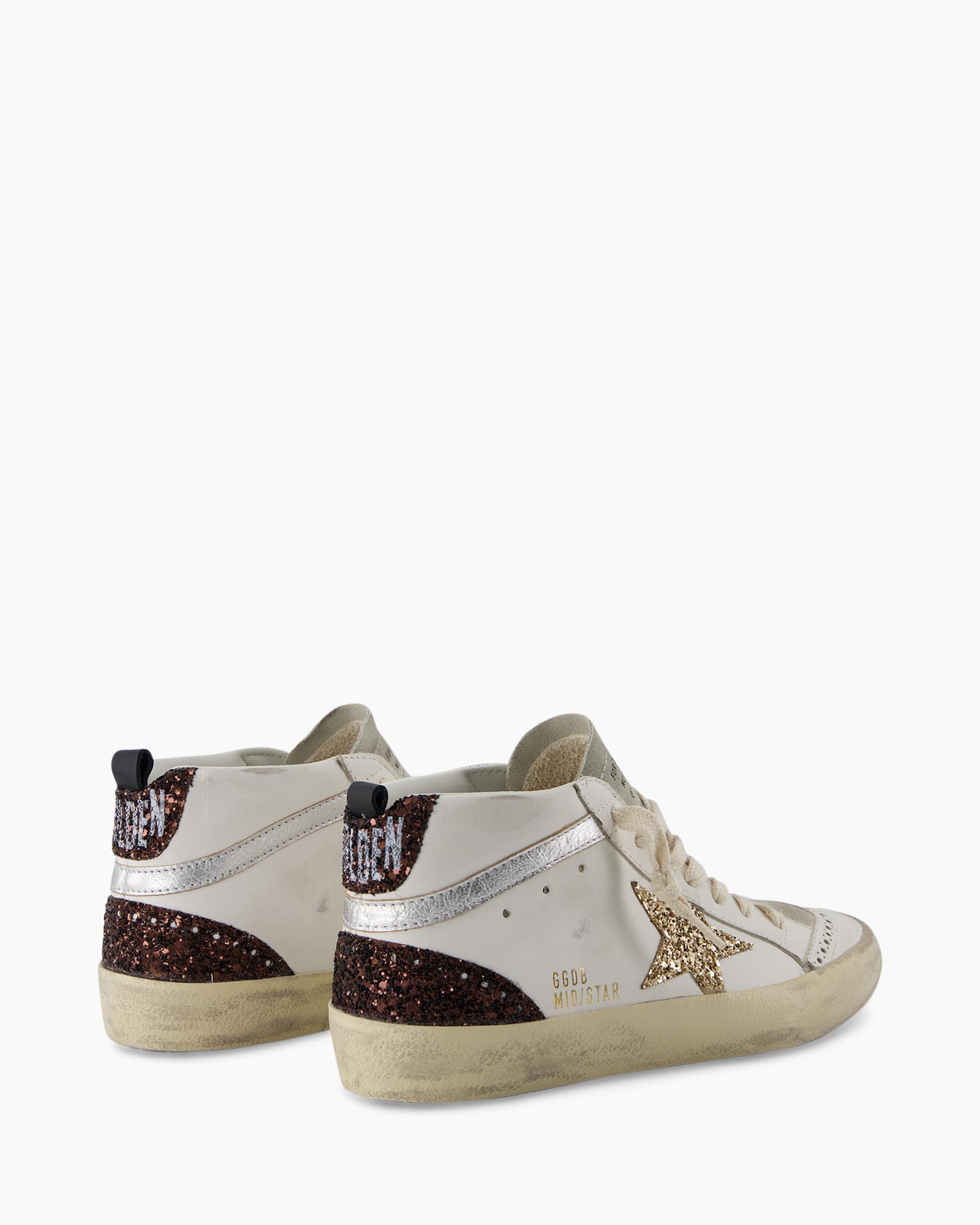 Sneaker Mid Star Glitter Star Laminated Wave Wit van Golden Goose is een halfhoge sneaker die je verrast met zijn opvallende afwerking. Je ziet meteen dat het witte leer en de zool die kenmerkende, verweerde look hebben gekregen. Dit model heeft een klassieke pasvorm en sluit je met de crèmekleurige veters. De combinatie van het glinsterende sterdetail en de donkere glitter op de hiel geeft deze schoen een krachtige uitstraling.