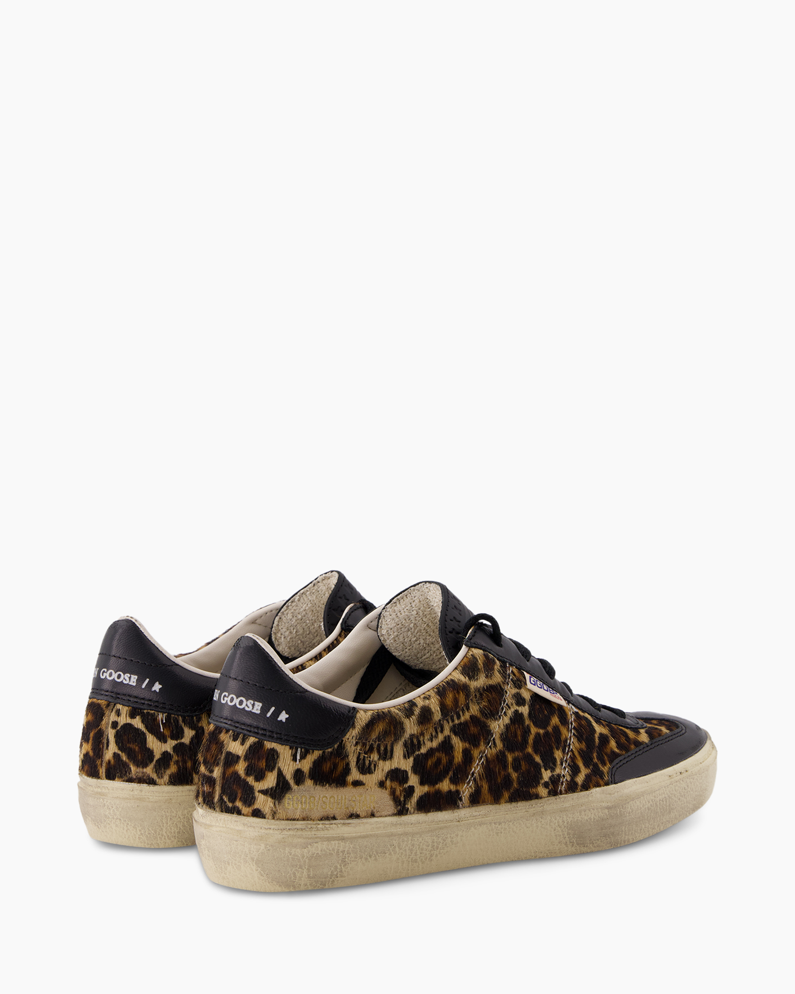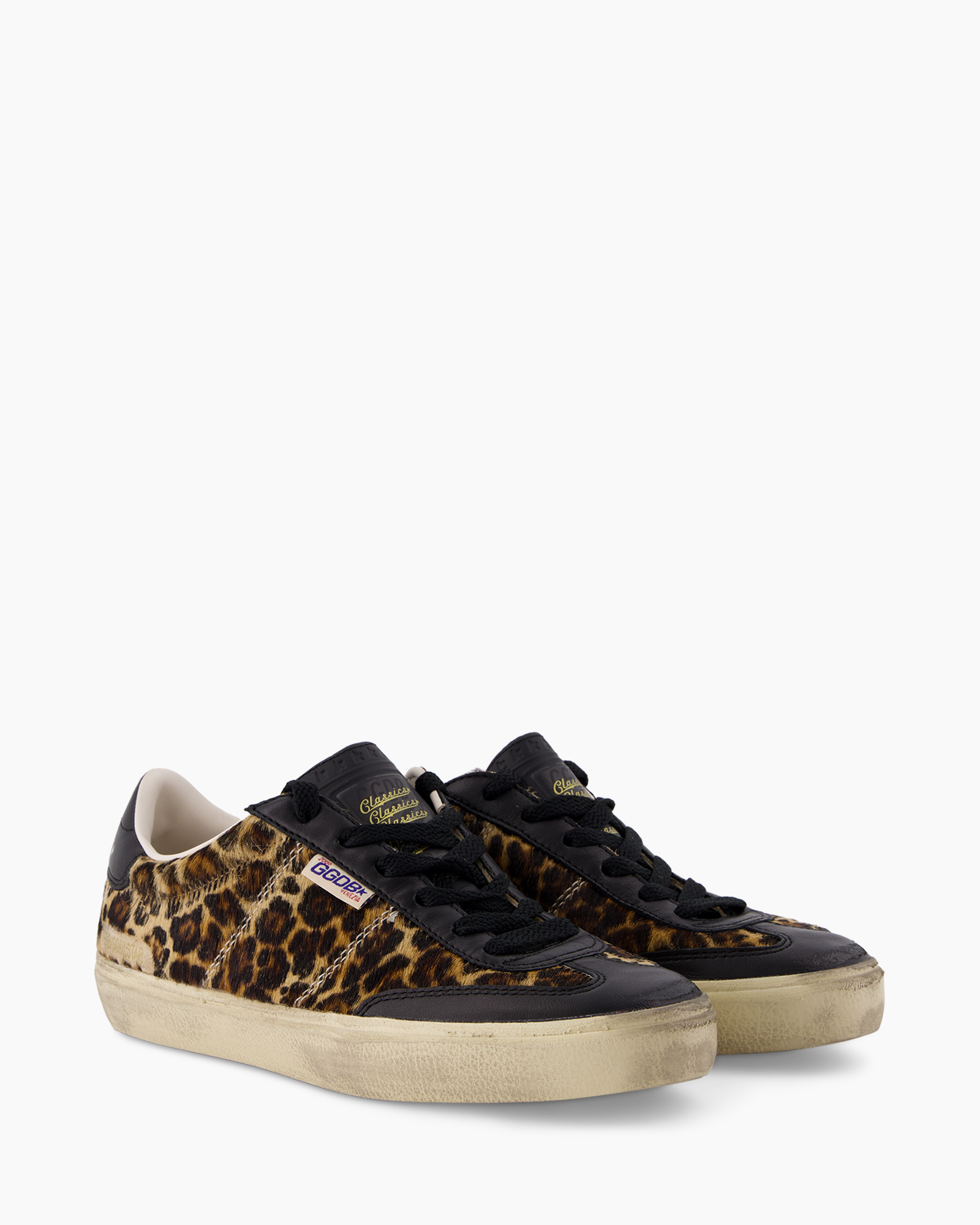 Die Sneaker Soul-star Leopard Horsy Bruin van Golden Goose is een opvallende lage schoen. Dit type sneaker heeft een klassieke pasvorm en combineert harig textiel met een rijke leopard print in bruin en zwart. Je ziet zwarte leren accenten bij de vetersluiting en de hiel, terwijl de robuuste zool een verweerde afwerking heeft. Kies deze schoen als je direct een sterke look wilt neerzetten.