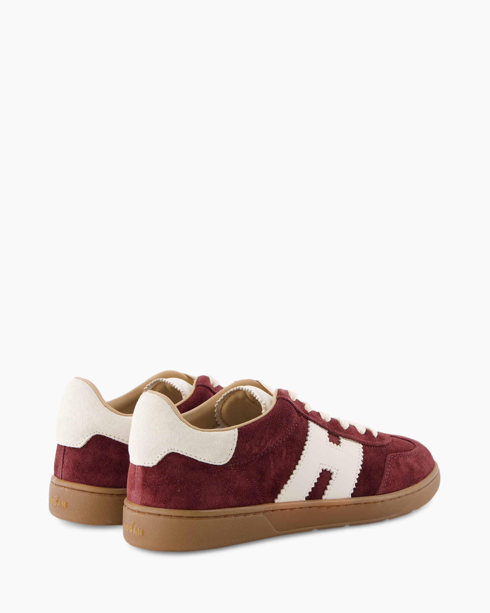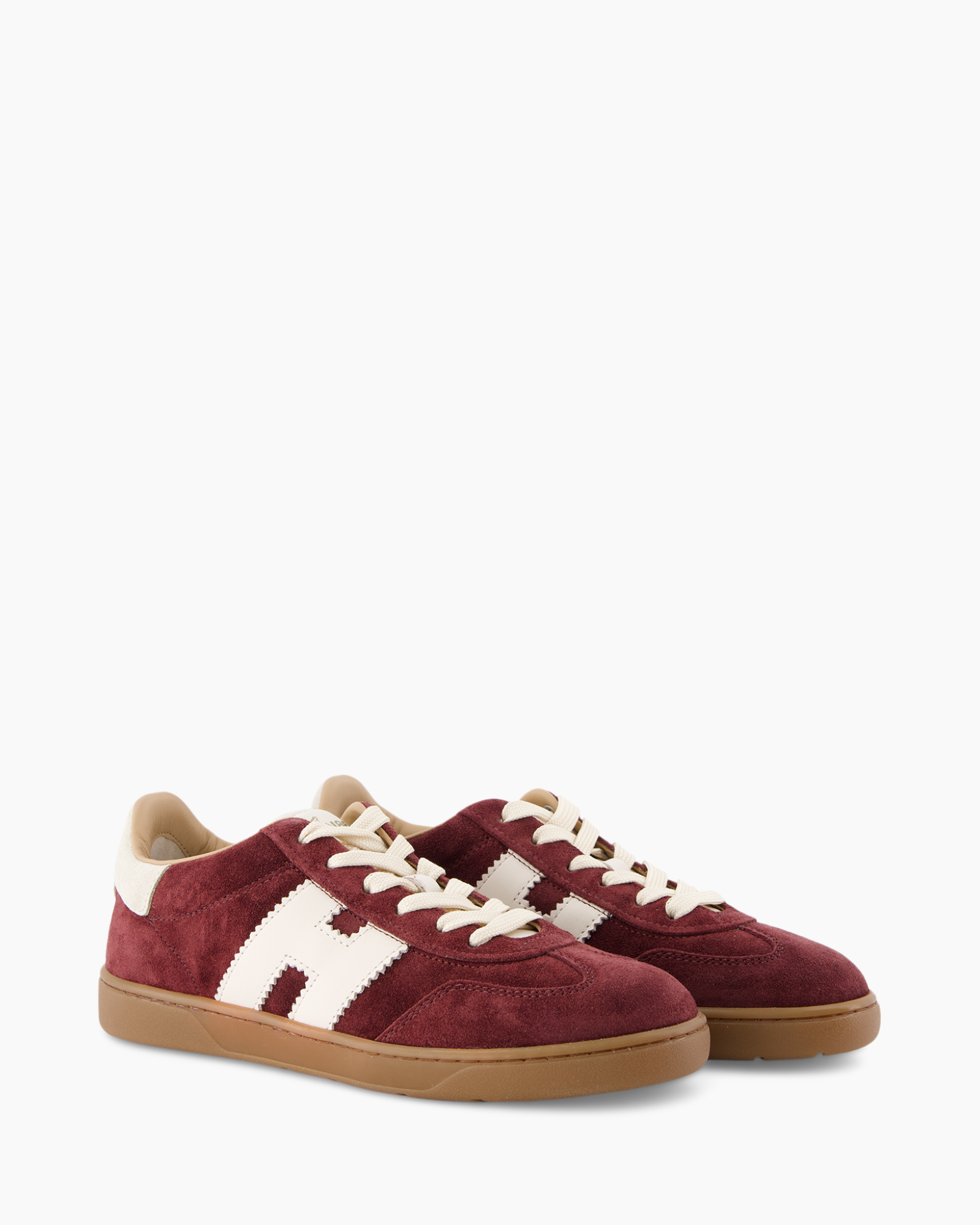 Als je zoekt naar schoenen die je persoonlijkheid onderstrepen, dan is de Sneaker Cool Allacciato Bruin van Hogan een uitstekende keuze. Deze sportieve sneaker valt direct op door zijn diepe bordeauxrode suède, dat de schoen een rijke textuur geeft. De contrasterende crèmekleurige veters geven de schoen een sprekend uiterlijk en trekken de aandacht. Aan de zijkant zie je duidelijk het kenmerkende grote H-logo, ook uitgevoerd in een lichte crèmetint. Dit geeft de sneaker een unieke herkenbaarheid. Een lichter hielstuk, gemaakt van soepel leer, vult het geheel fraai aan. De robuuste bruine rubberen zool zorgt voor een solide basis en biedt comfort. Dit is een veelzijdige schoen die je graag draagt voor verschillende gelegenheden.