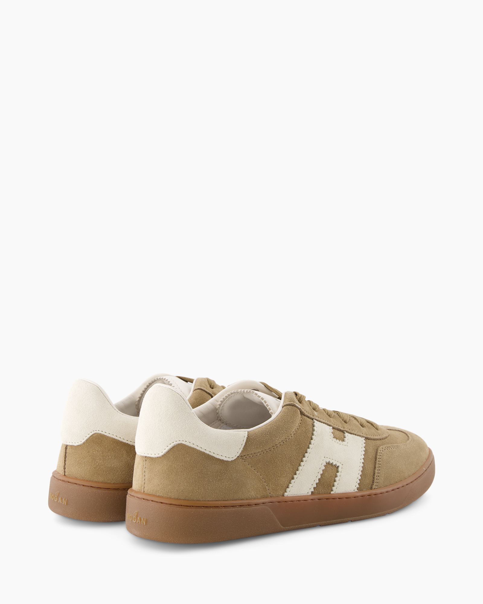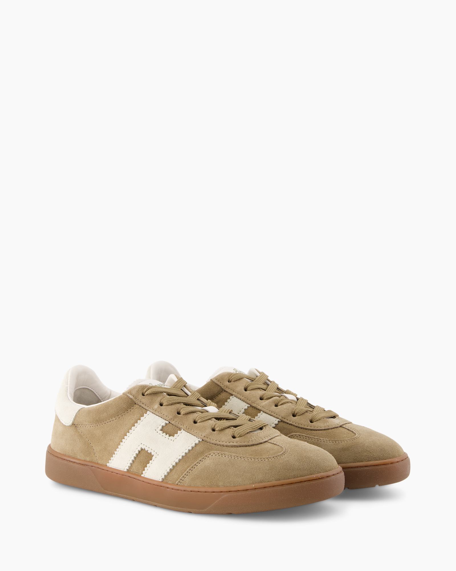 Je outfit krijgt een aardse touch met de Sneaker Cool Allocciato Bruin van Hogan. Deze sneaker, met zijn lage profiel, geeft je een ontspannen uitstraling. De schoen is gemaakt van zacht suède in een zandkleur die goed combineert met veel van je kleding. De veters zijn in dezelfde tint uitgevoerd, wat zorgt voor een rustig beeld aan de voorkant. Aan de zijkant zie je het kenmerkende, grote crèmekleurige 'H'-logo van Hogan, afgewerkt met een speelse zigzagrand. De hiel is ook voorzien van een stuk leer in deze lichte kleur, wat een mooi contrast biedt. Rondom de neus en langs de veterogen zie je subtiele stiksels die de kwaliteit benadrukken. De bruine rubberen zool maakt de look compleet en zorgt voor grip. Deze schoenen zijn gemaakt om jou comfortabel door de dag te leiden.