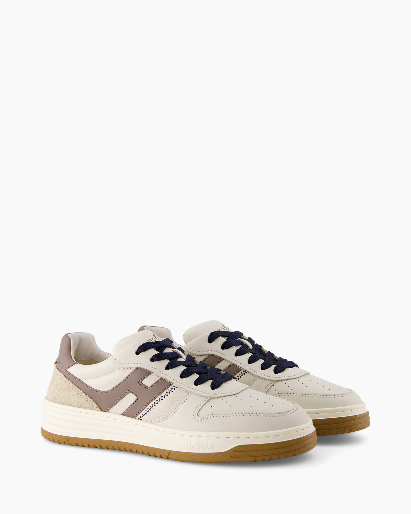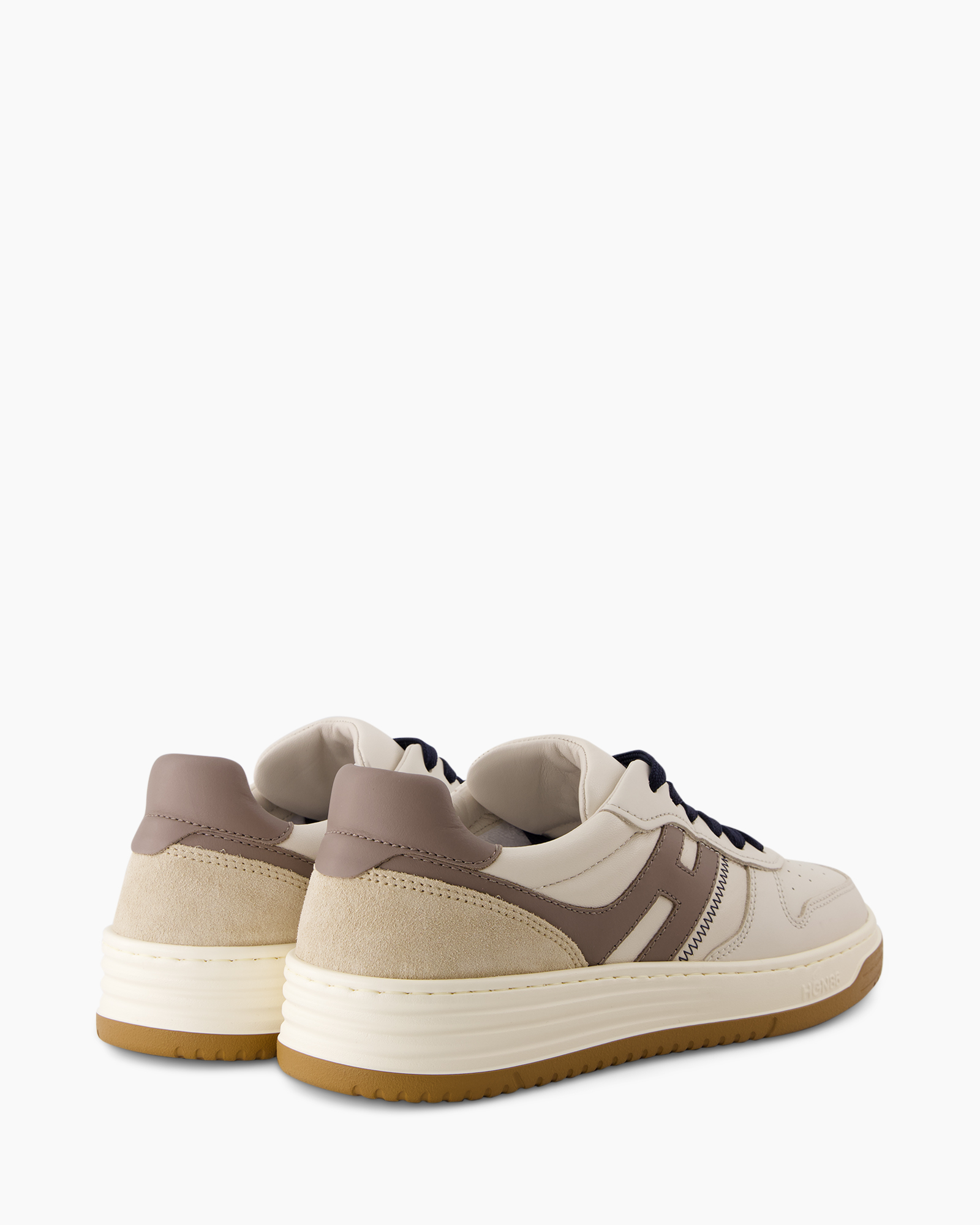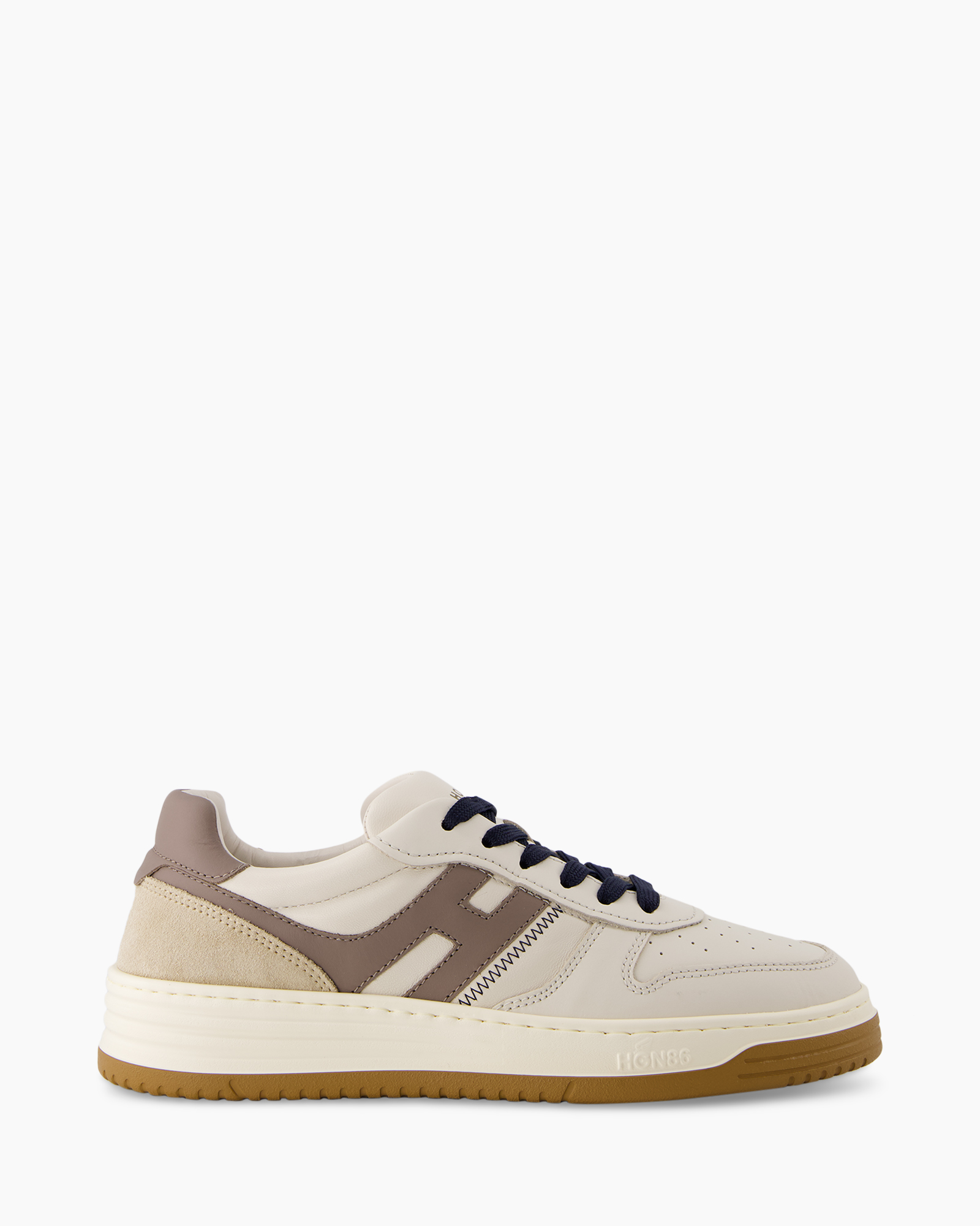 Met de Sneaker H630 Allacciato Ecru van Hogan voeg je een veelzijdige sneaker toe aan je garderobe. Deze schoen valt direct op door de doordachte combinatie van materialen en kleuren. De basis van ecru leer vormt een rustig canvas en wordt versterkt door zandkleurig suède aan de zijkant en een taupekleurig detail bij de hiel. De diepblauwe veters bieden een scherp contrast dat de hele look samenbrengt. Op de zijkant van de sneaker zie je een groot ‘H’ logo van Hogan, subtiel afgewerkt met decoratieve zigzagstiksels. Daarnaast zijn er perforaties zichtbaar op de neus, wat bijdraagt aan het geheel. De lichte zool en de contrasterende bruine buitenzool complementeren de schoen. Deze sneaker is ontworpen om je outfit een verzorgde uitstraling te geven, met aandacht voor detail en comfort.