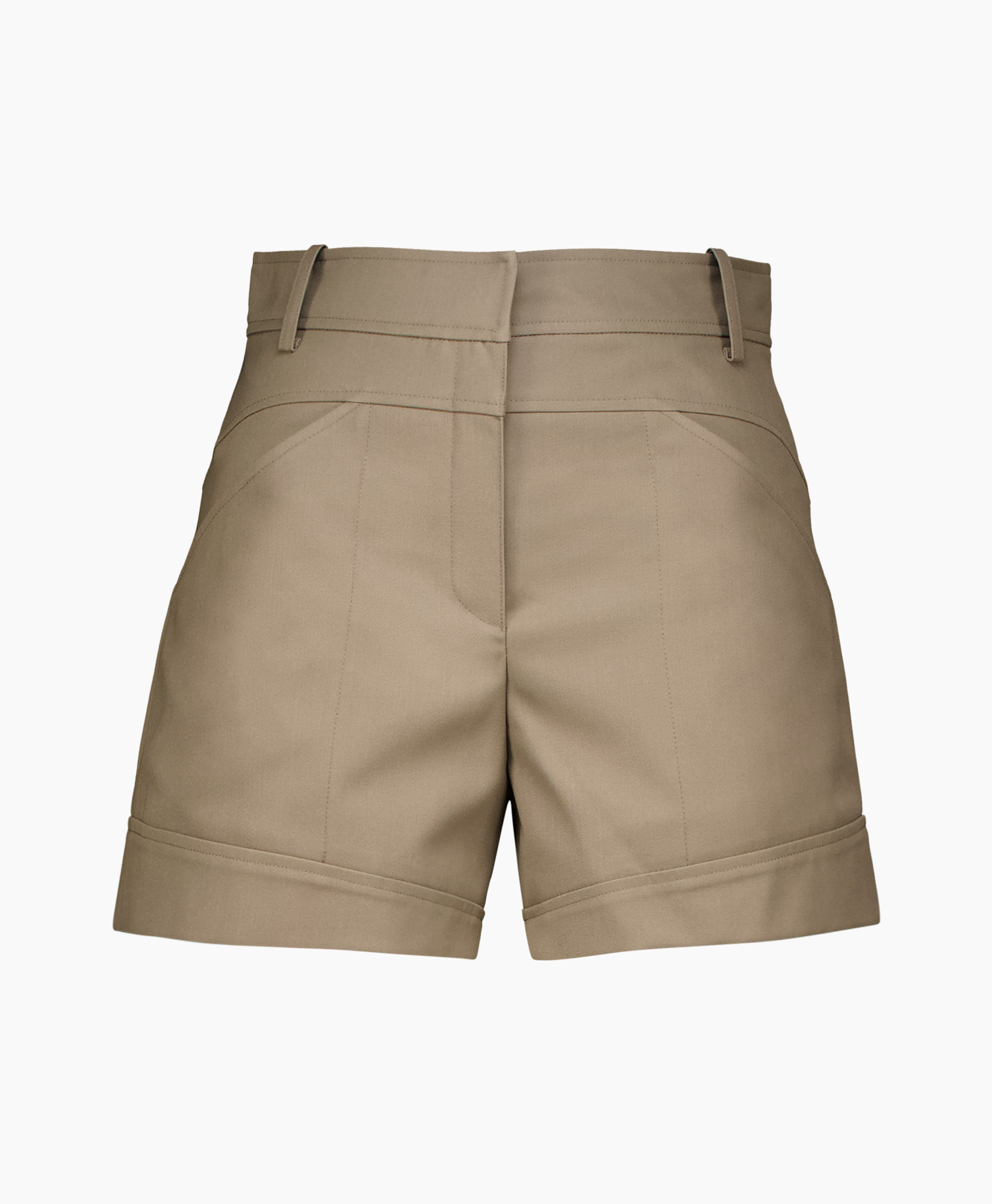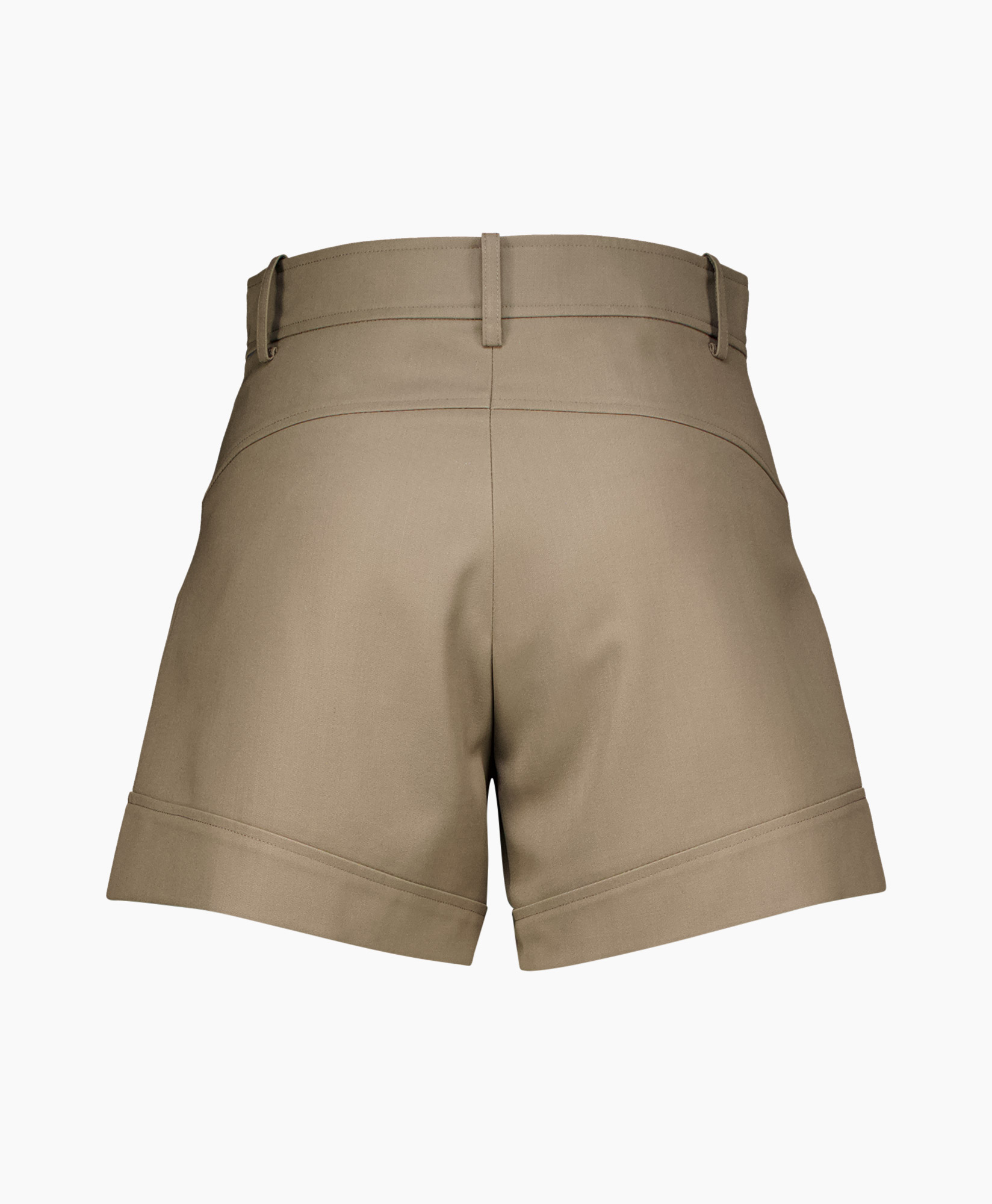 Korte Broek Nomma Khaki van Iro is de korte broek die je zoekt voor zonovergoten dagen. Deze short komt in een neutrale khaki kleur en heeft een getailleerde pasvorm met een hoge taille. Je ziet duidelijke steekzakken aan de voorkant en een brede, vaste omslag aan de onderzijde die de structuur benadrukt. De broek sluit met een verborgen rits en haakje en heeft riemlussen rondom de tailleband.