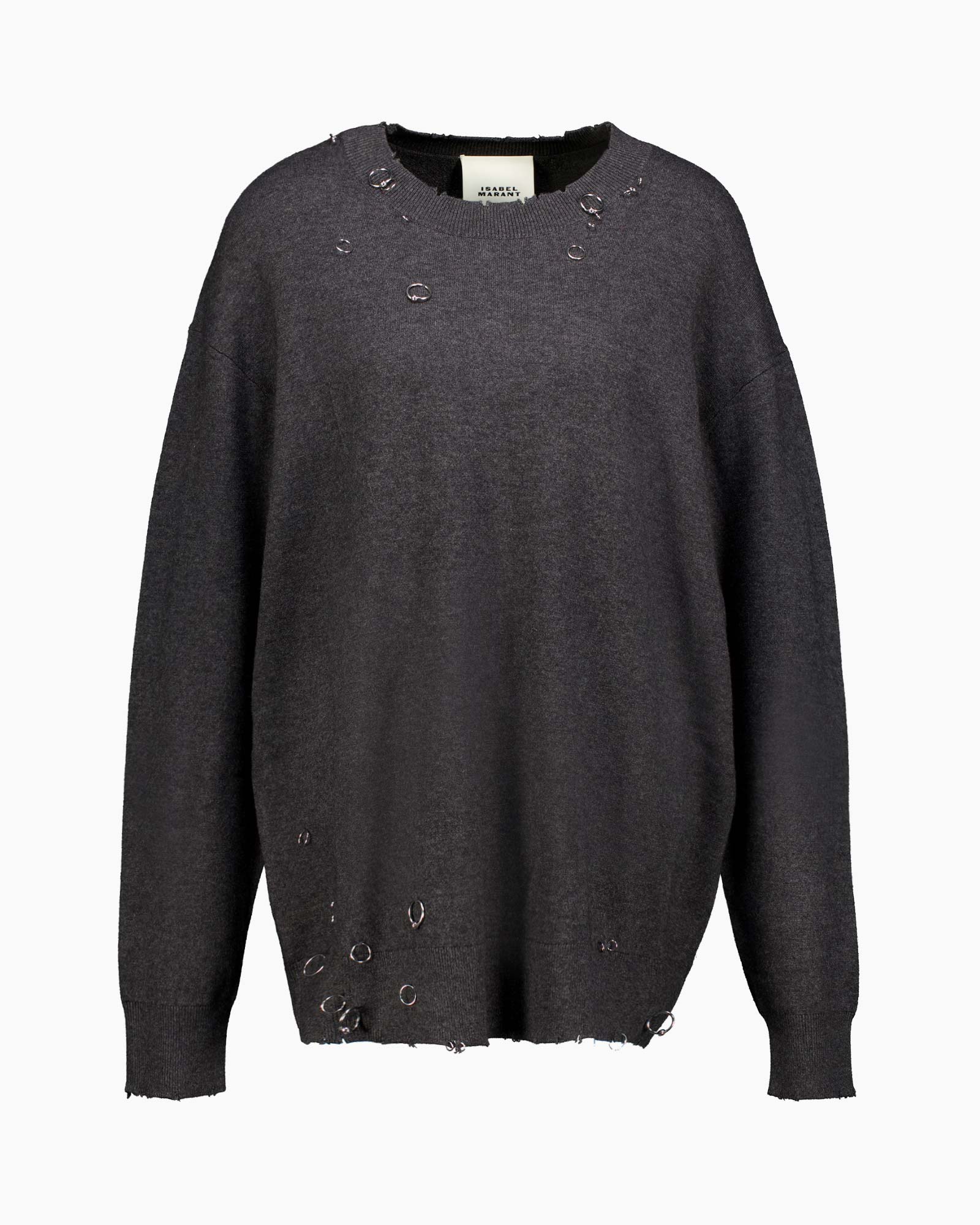 De Pullover Cassandre-gd Grijs van Isabel Marant is precies de trui die je zoekt om je look een rauwe rand te geven. Deze pullover heeft een ruimvallende pasvorm en is uitgevoerd in een diepe, antracietgrijze tint. De rafelige afwerking aan de zomen en de metalen ringen zorgen voor een opvallend en krachtig effect. Dit kledingstuk met klassieke ronde hals zet je direct in je kracht.