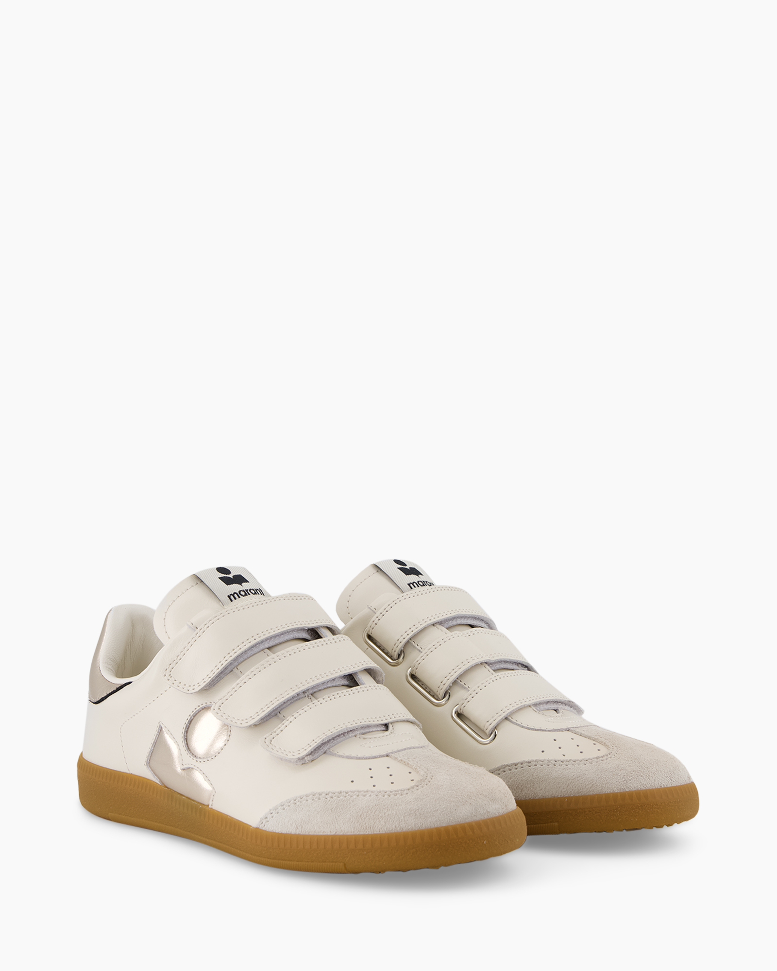 Sneaker Beth-gb kit van Isabel Marant is een lage schoen die je elke dag draagt. Je ziet wit leer met een grijze neus en een bruine zool van rubber. Drie stroken klittenband over de wreef maken het aan- en uittrekken makkelijk. De gouden details op de zijkant en hiel geven de schoen een fris accent.